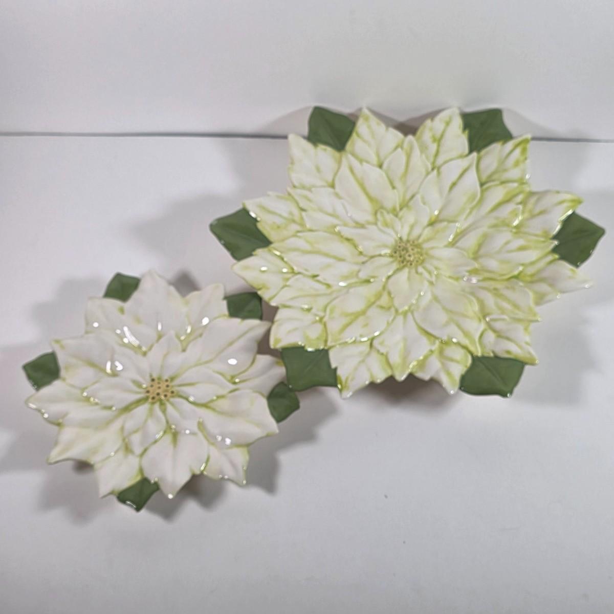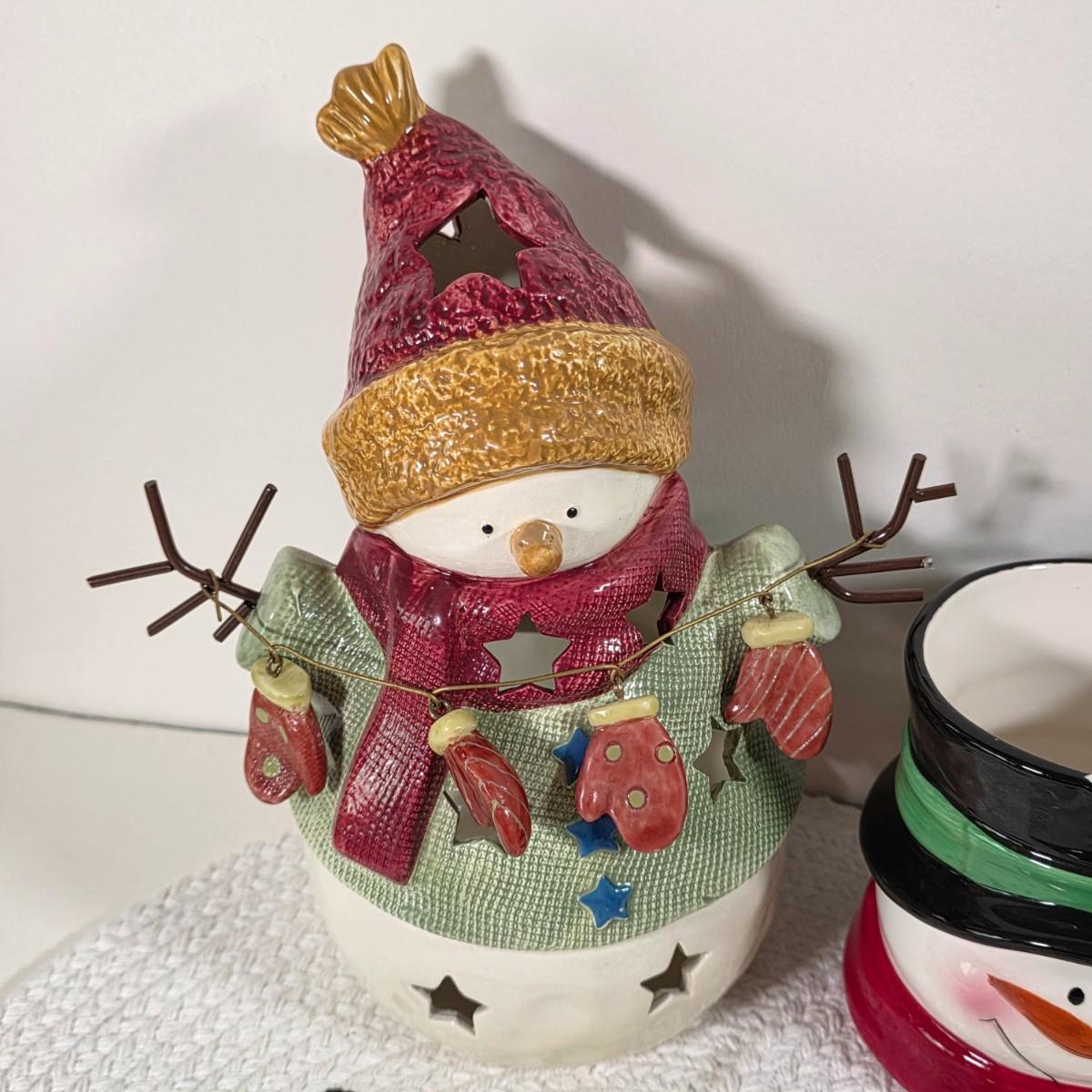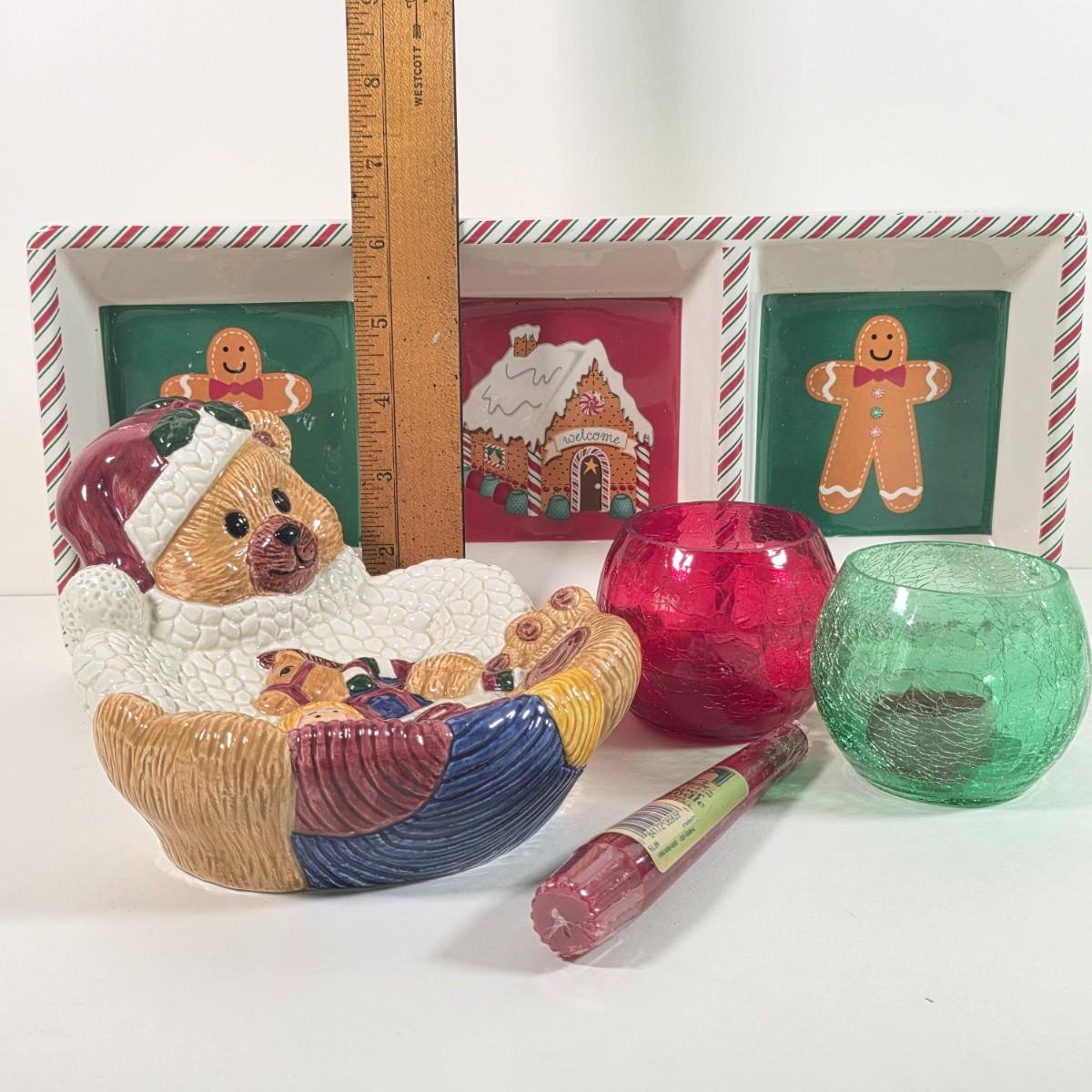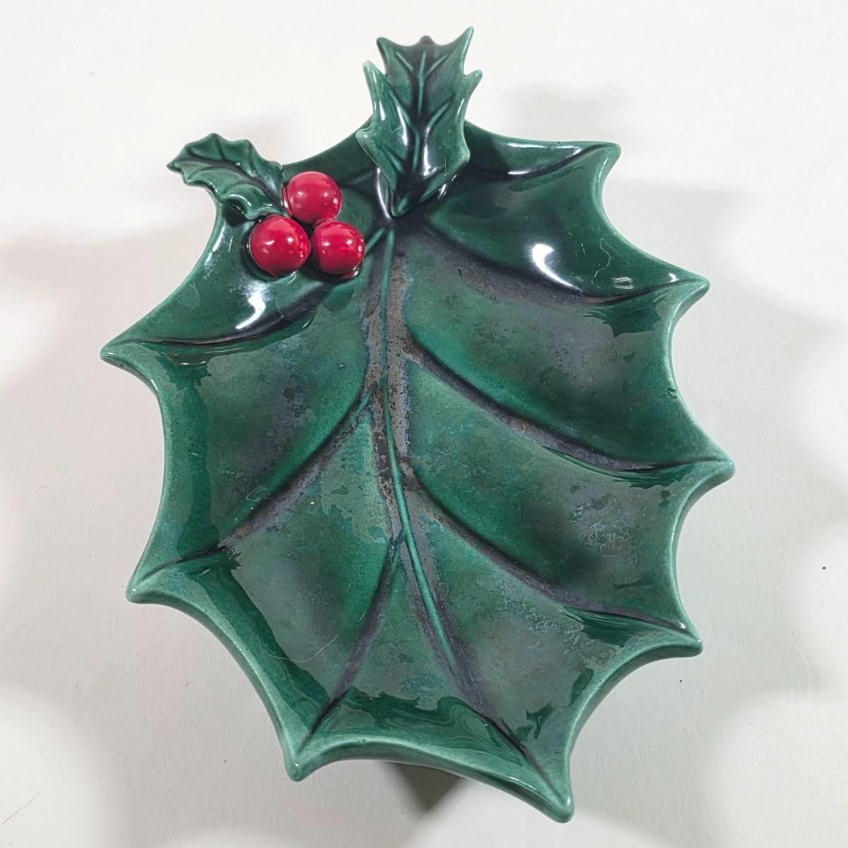 LOT 144D: Christmas in July! Vintage Lefton Holly Berry Collection Ceramic Sleigh & Leaf Dish, Ceramic Poinsettia Dishes, Snowman Placemats, Nesting Bowls, Votives W/Candles & More