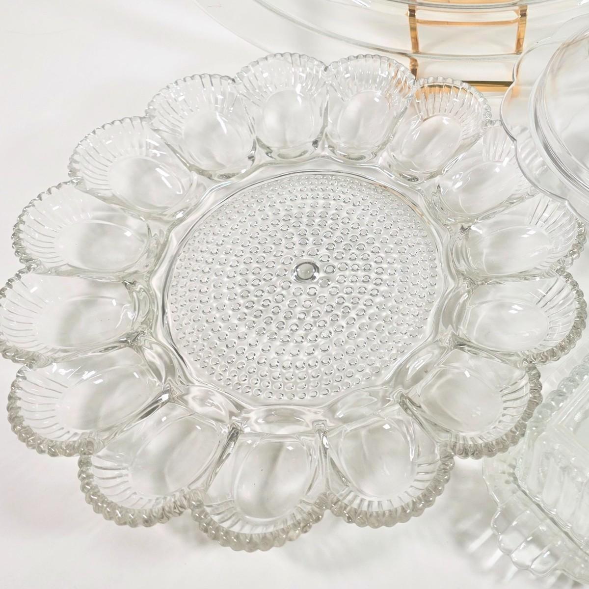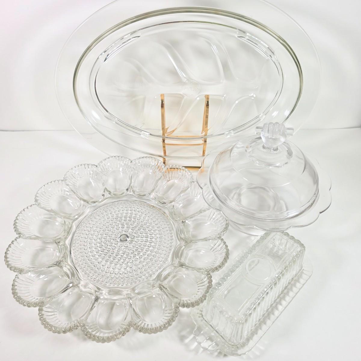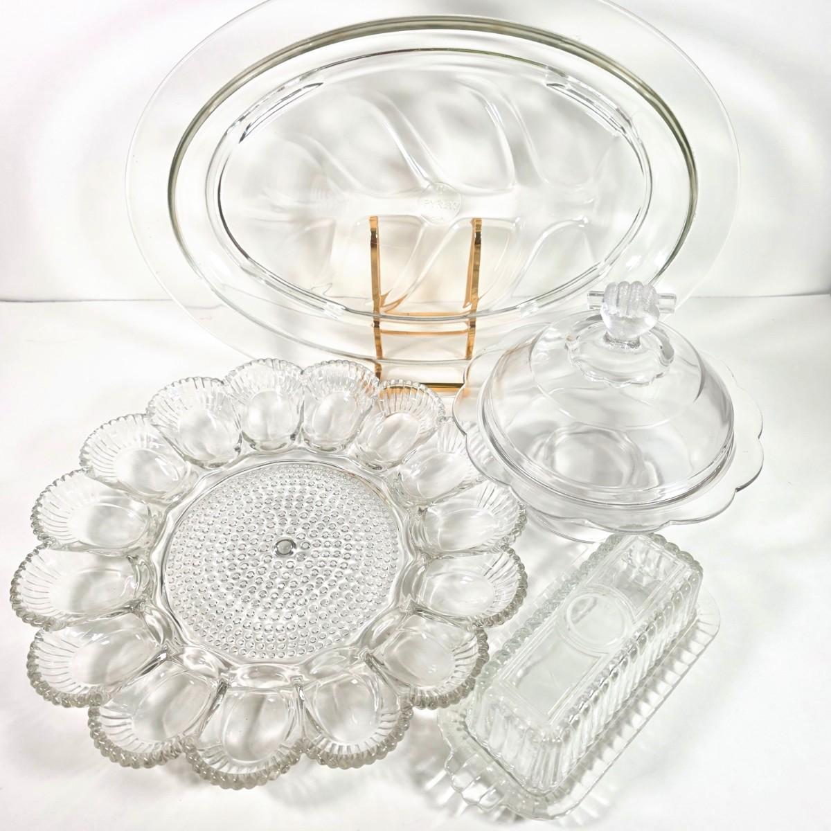 LOT 148D: Antique/Vintage Clear Glass Serving Pieces, Pyrex Meat Platter, Hobnail Deviled Egg Plate, Hand & Bar Lidded/Footed Candy Dish & Covered Butter Dish