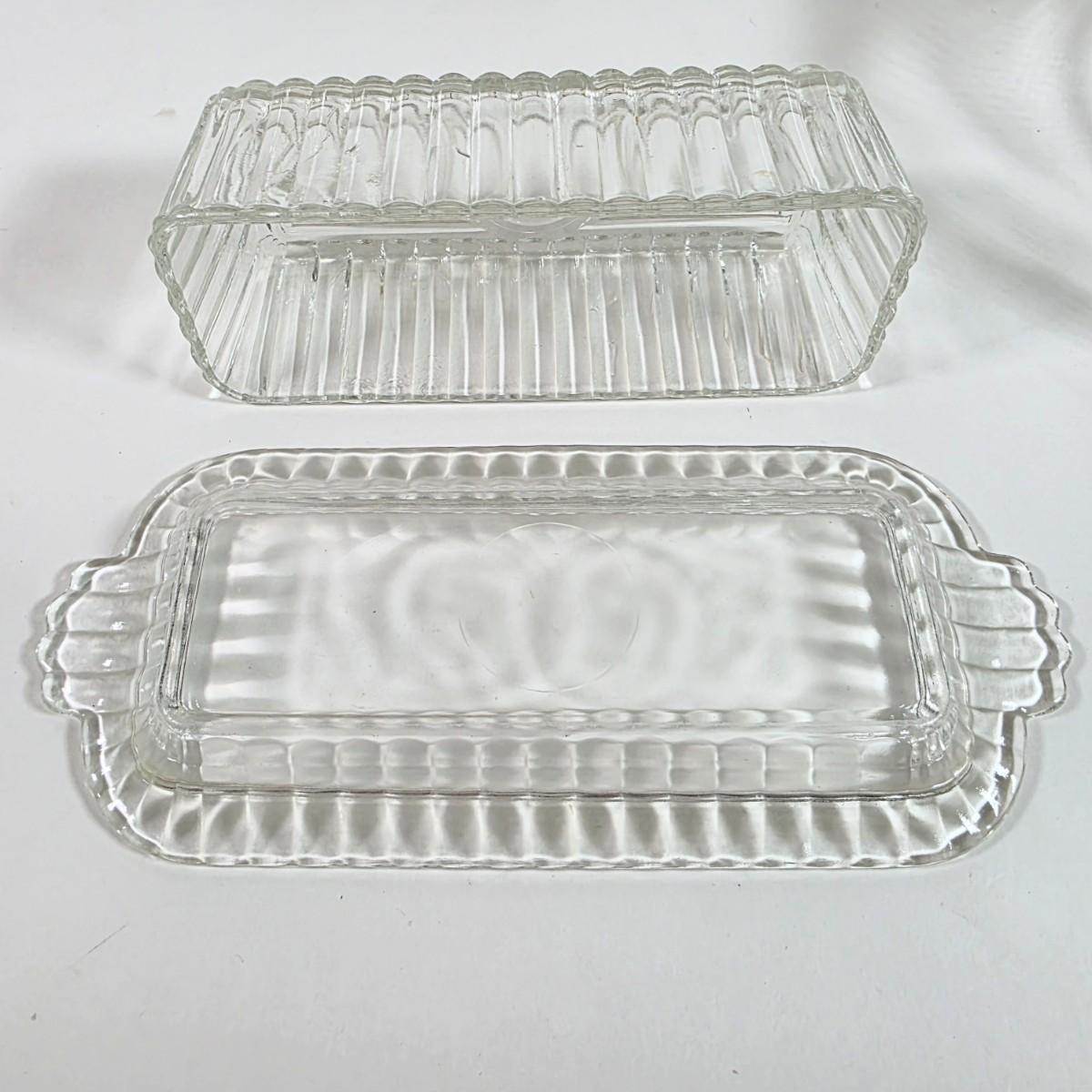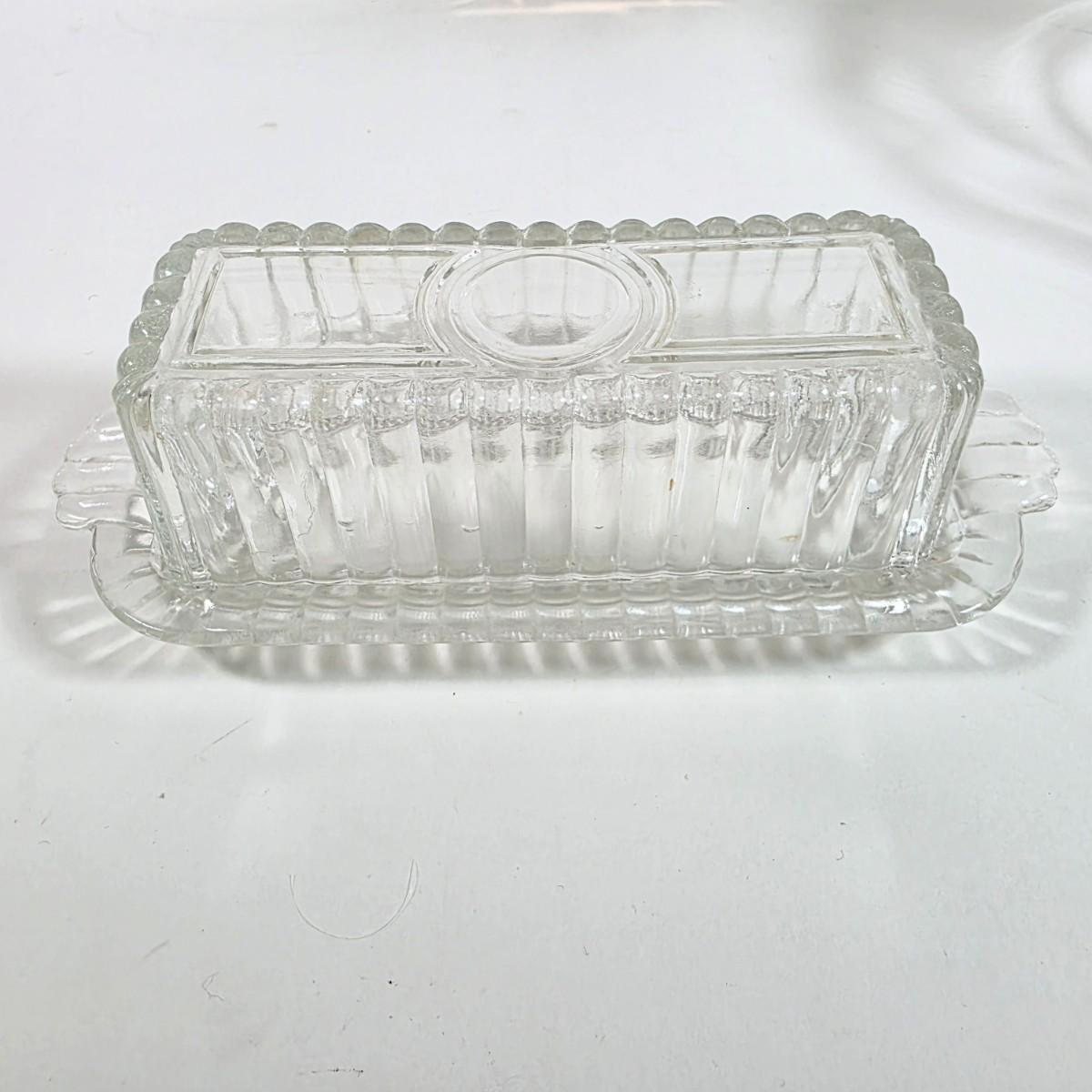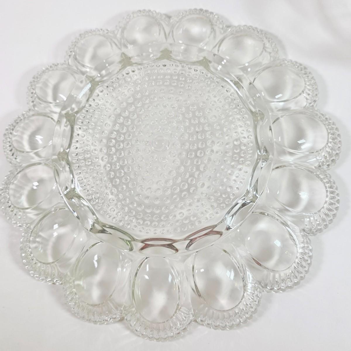 LOT 148D: Antique/Vintage Clear Glass Serving Pieces, Pyrex Meat Platter, Hobnail Deviled Egg Plate, Hand & Bar Lidded/Footed Candy Dish & Covered Butter Dish