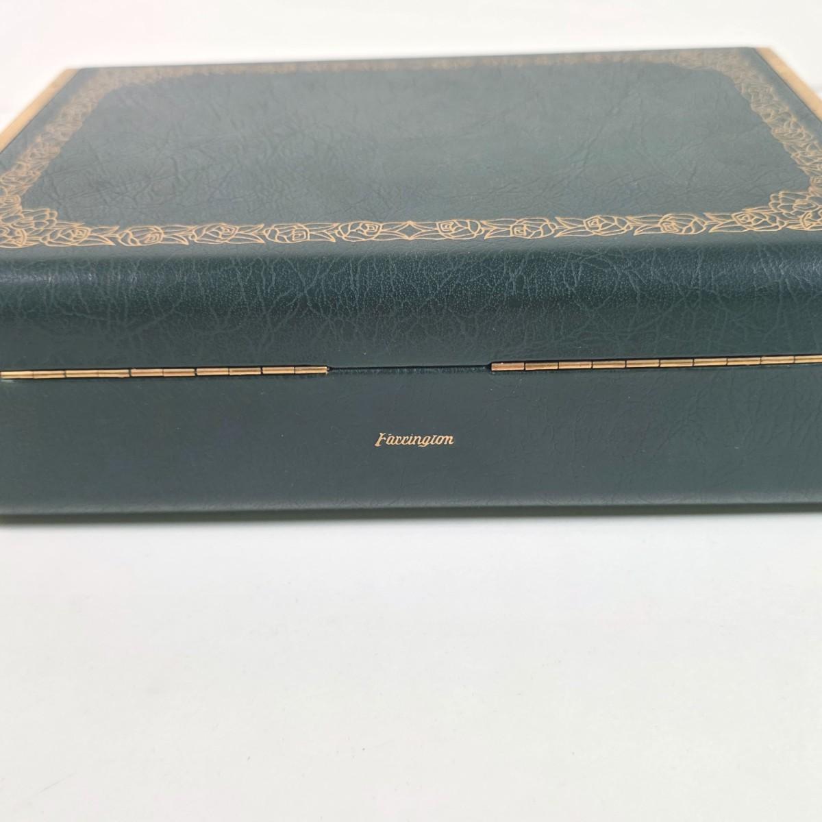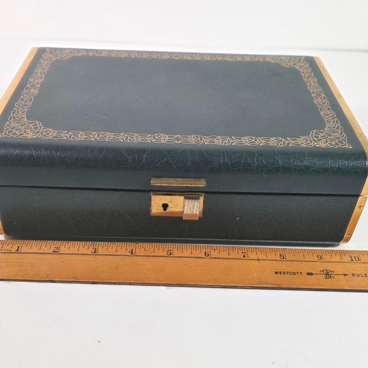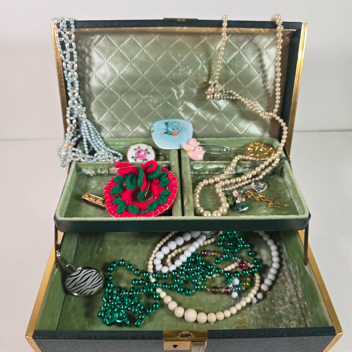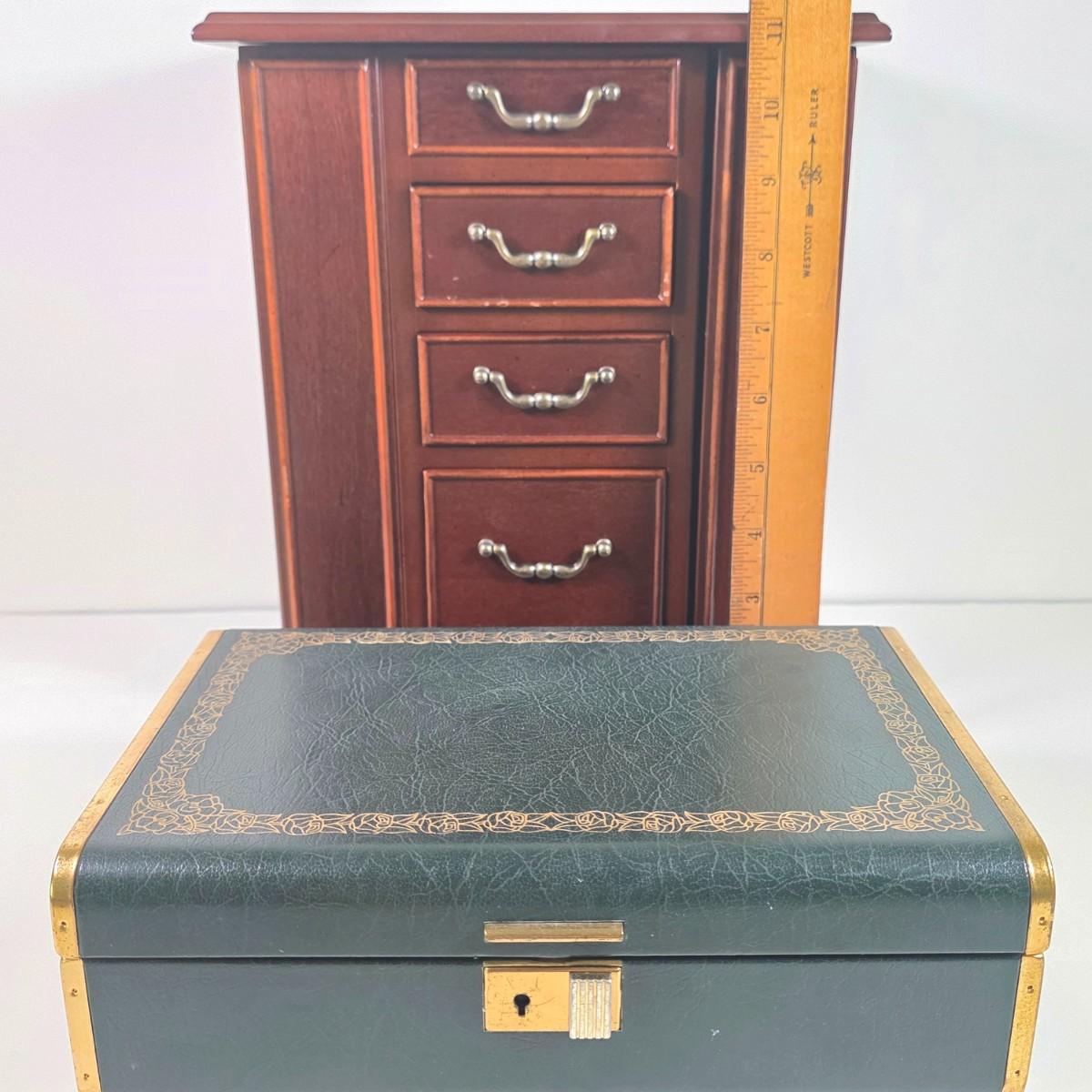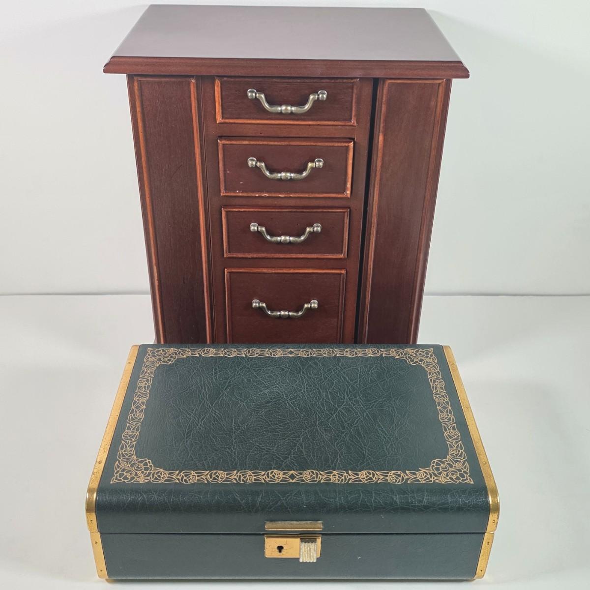 LOT 153D: Vintage Jewelry Boxes, Green Leather/ Gold Embossed Farrington Jewelry Box Filled W/Unique Costume Jewelry & More, Plus a Wood Bombay Company Armoire Jewelry Box