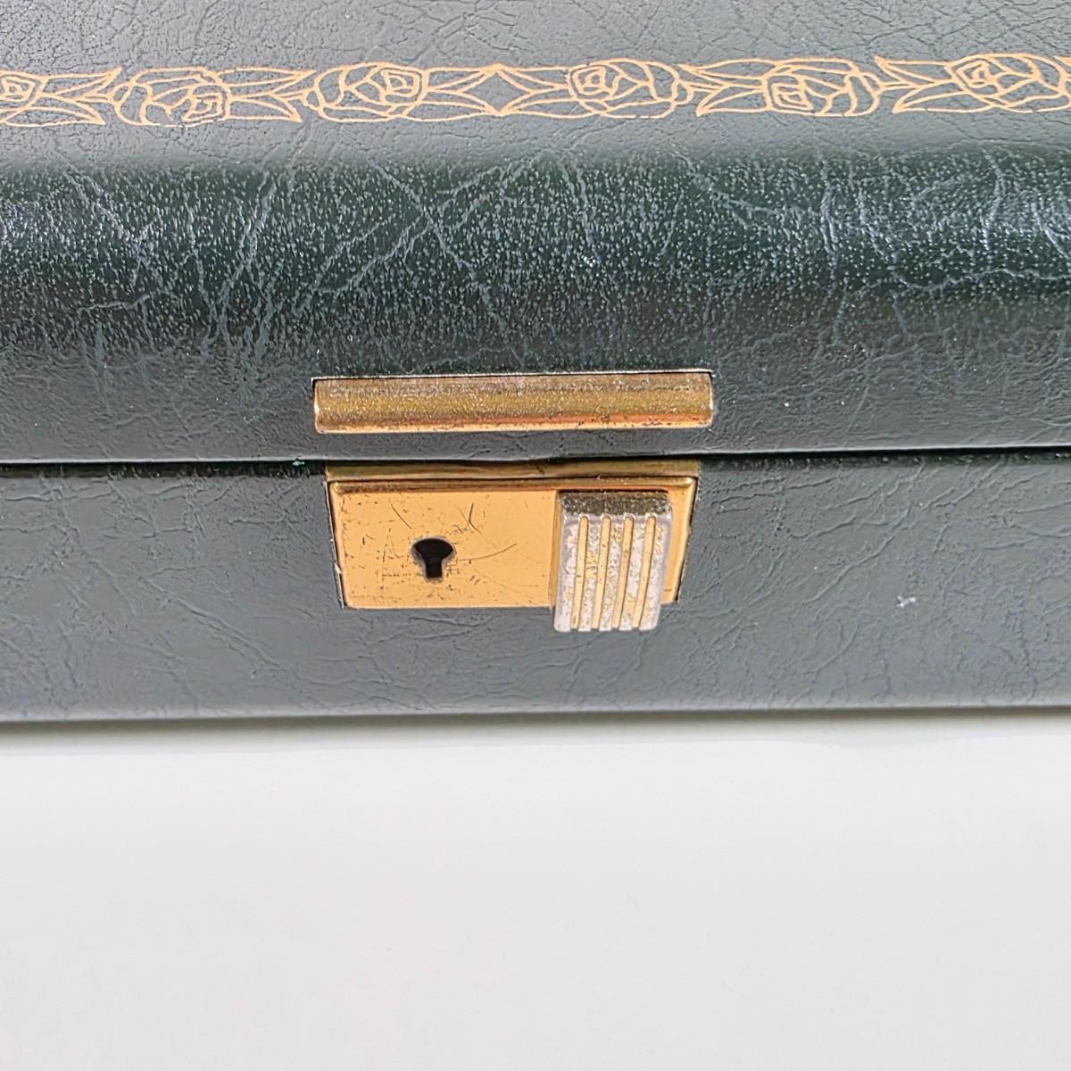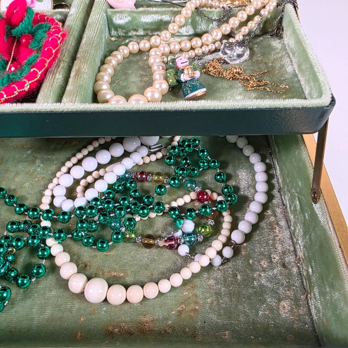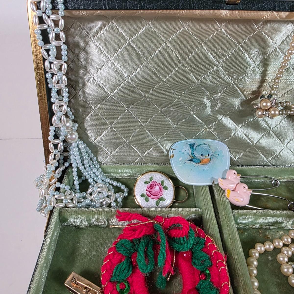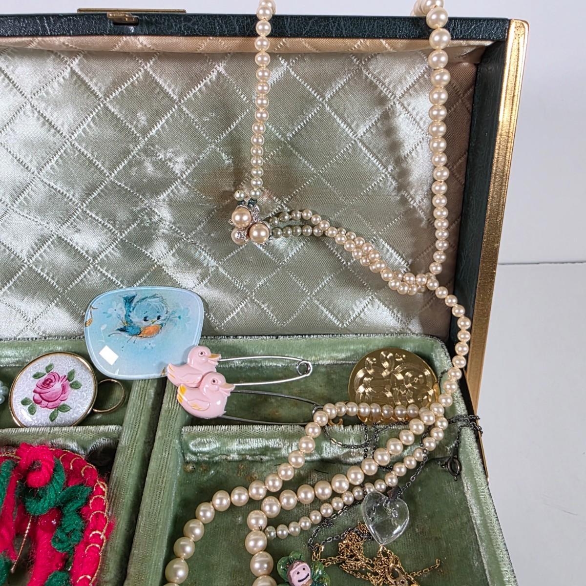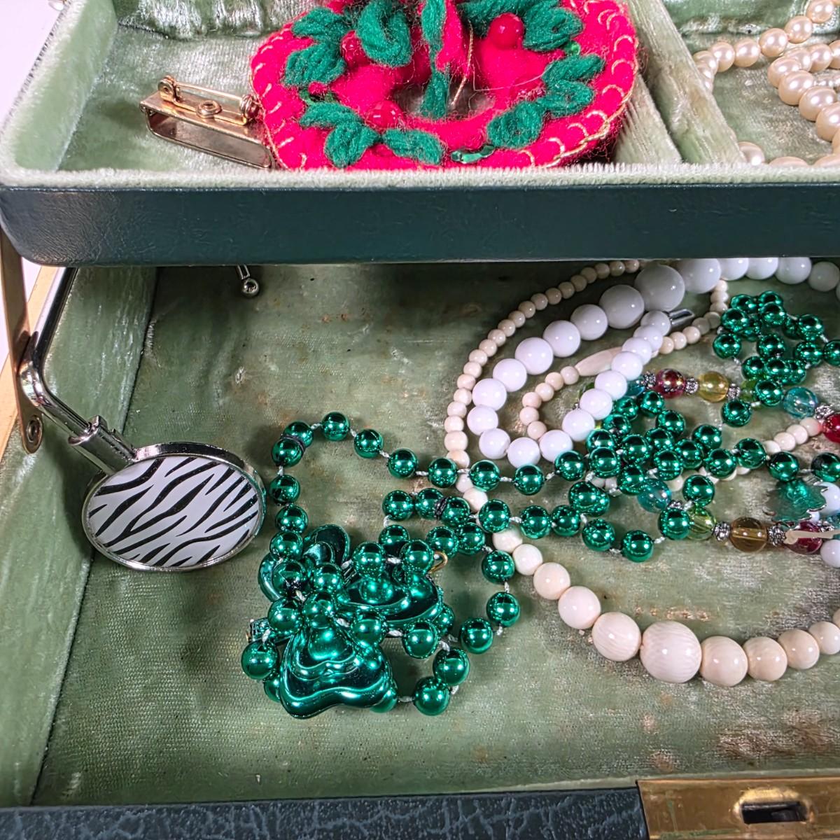 LOT 153D: Vintage Jewelry Boxes, Green Leather/ Gold Embossed Farrington Jewelry Box Filled W/Unique Costume Jewelry & More, Plus a Wood Bombay Company Armoire Jewelry Box