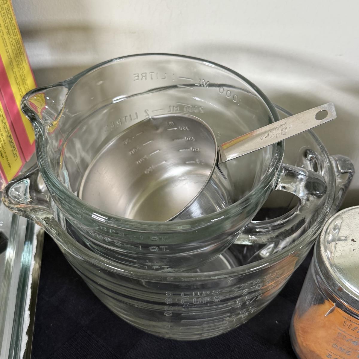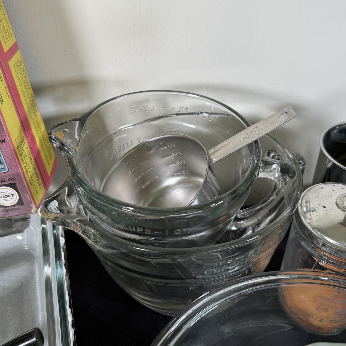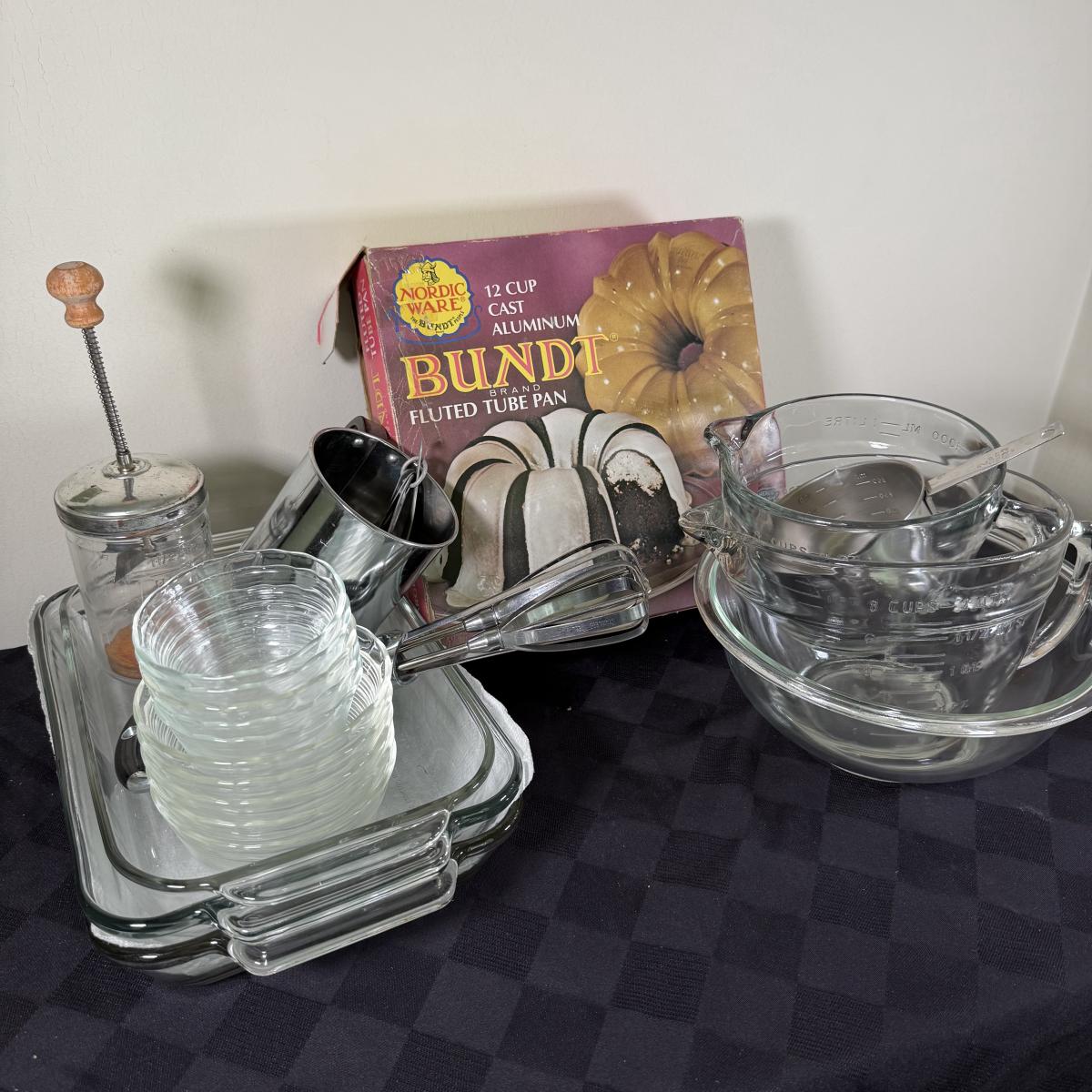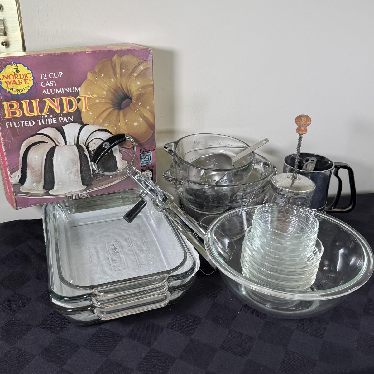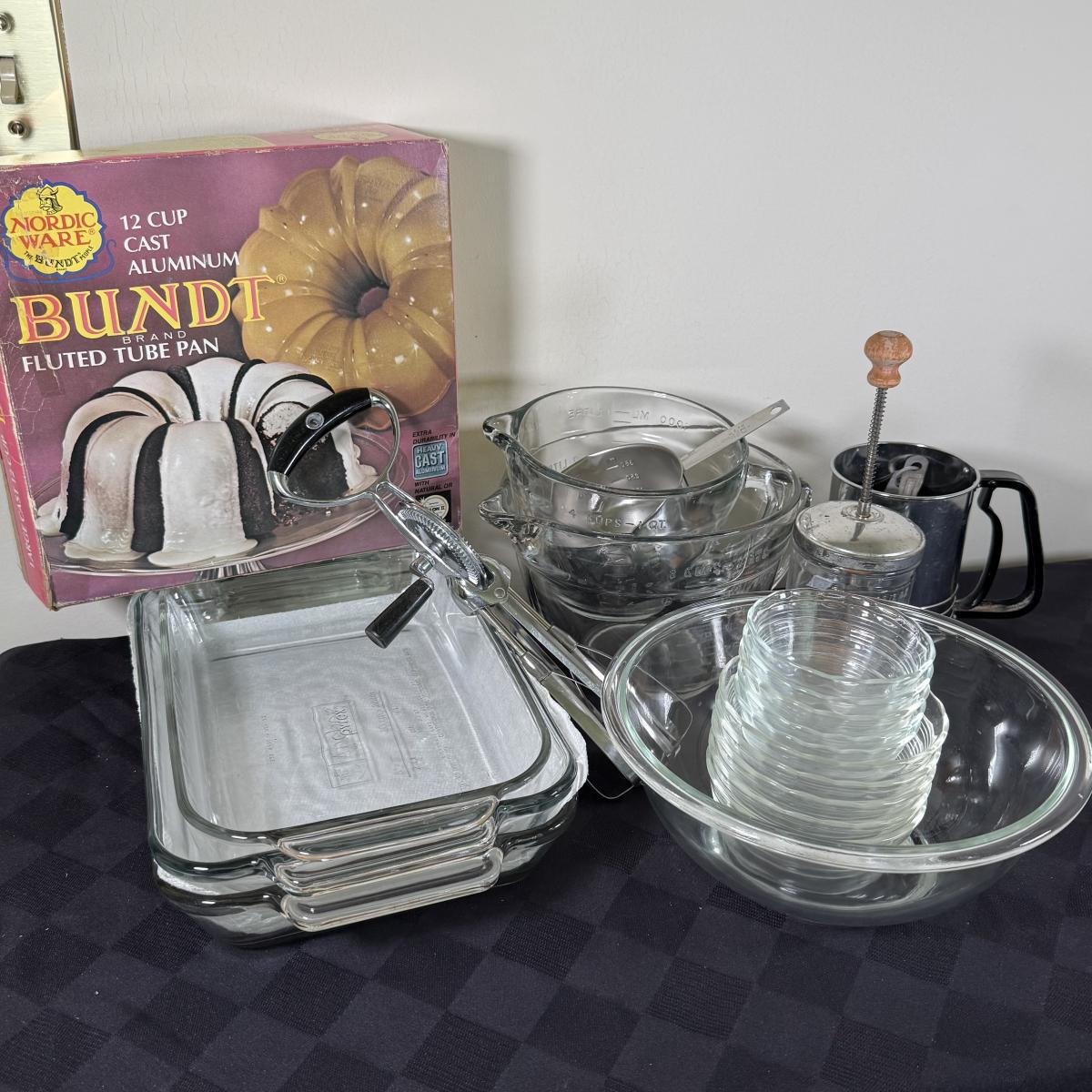 LOT 189K: Baking Collection: Nordic Ware Bundt Pan, Pyrex Dishes, Pampered Chef Measuring Cups & More