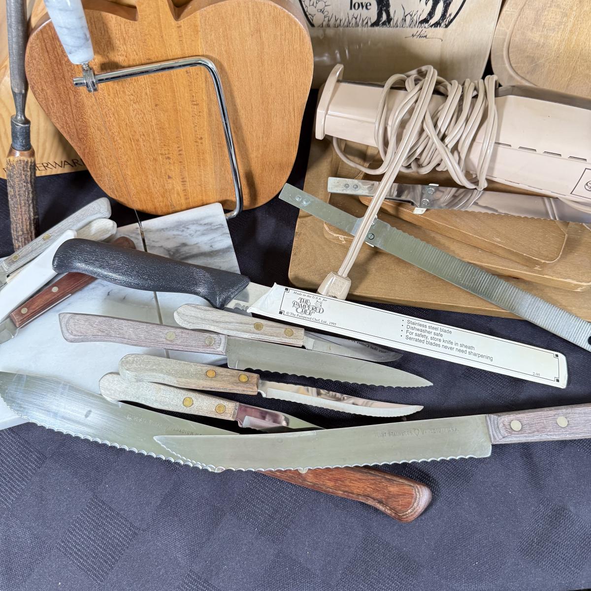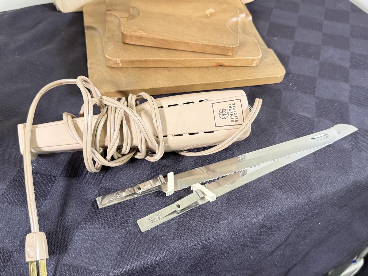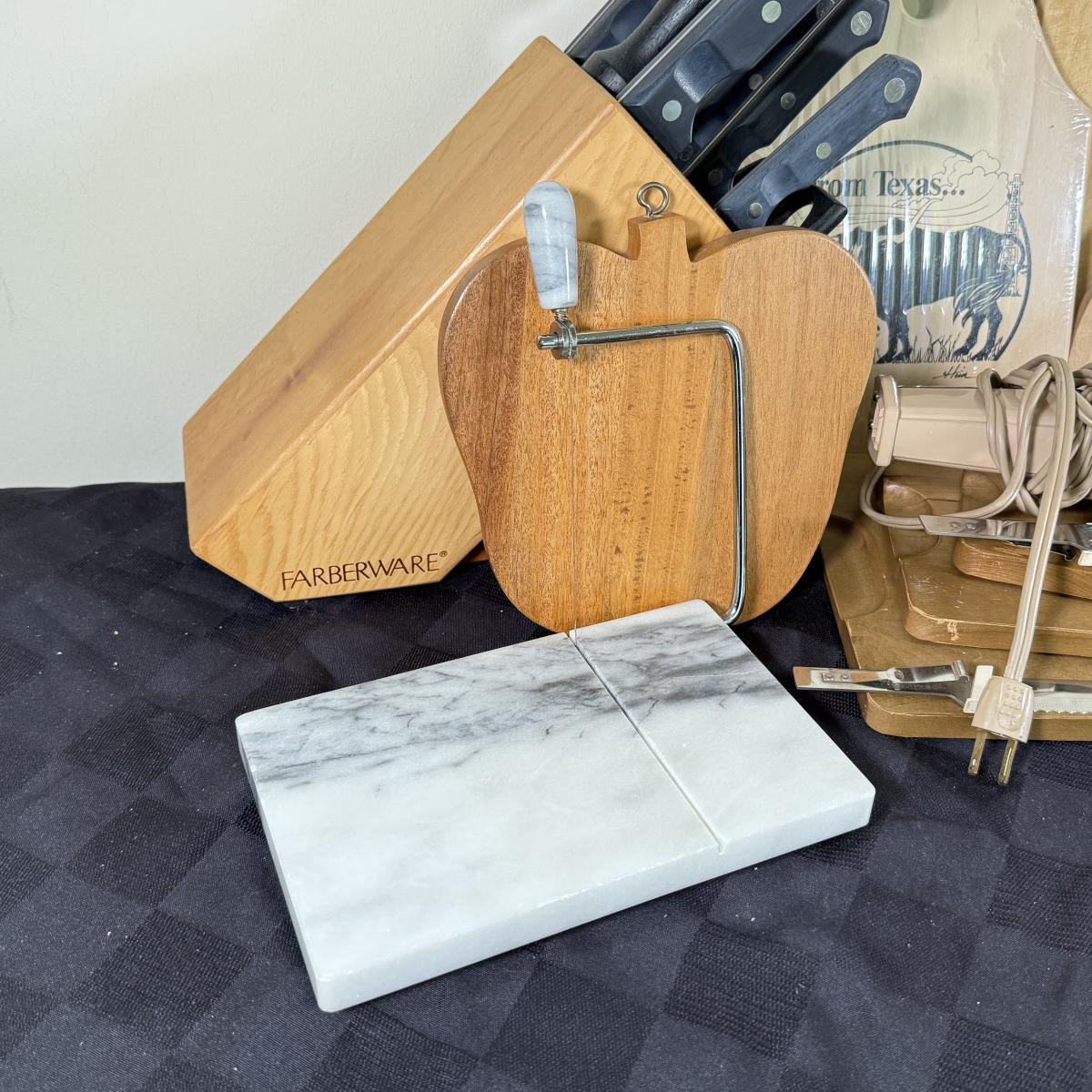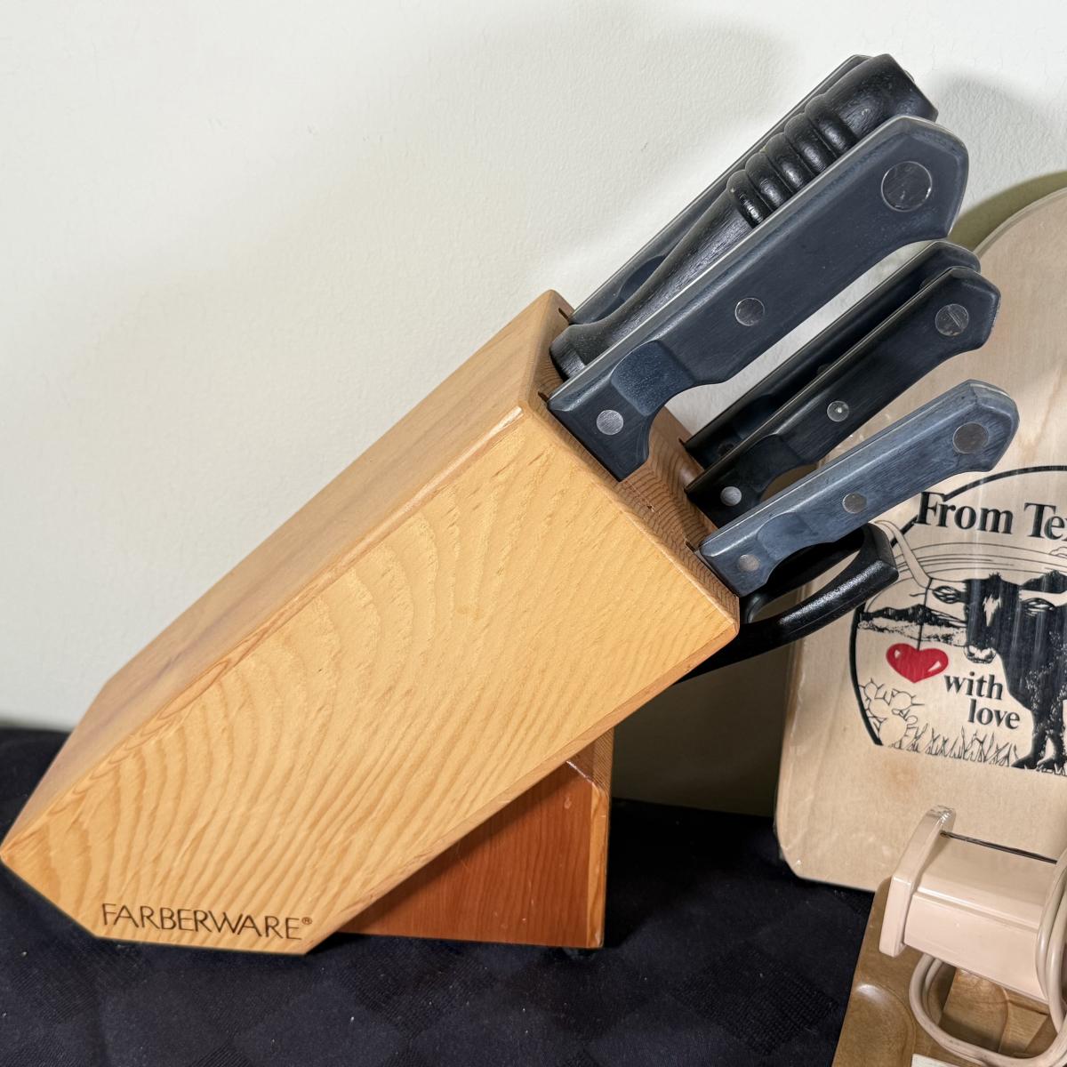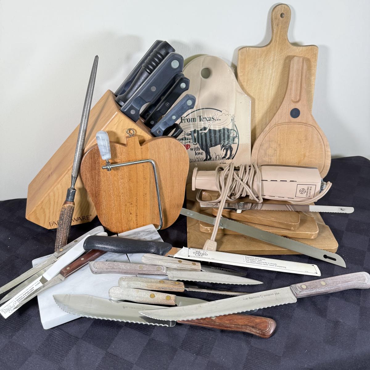 LOT 191K: Farberware Knife Block, General Electric Carving Knife w/ Collection of Knives & Cutting Boards