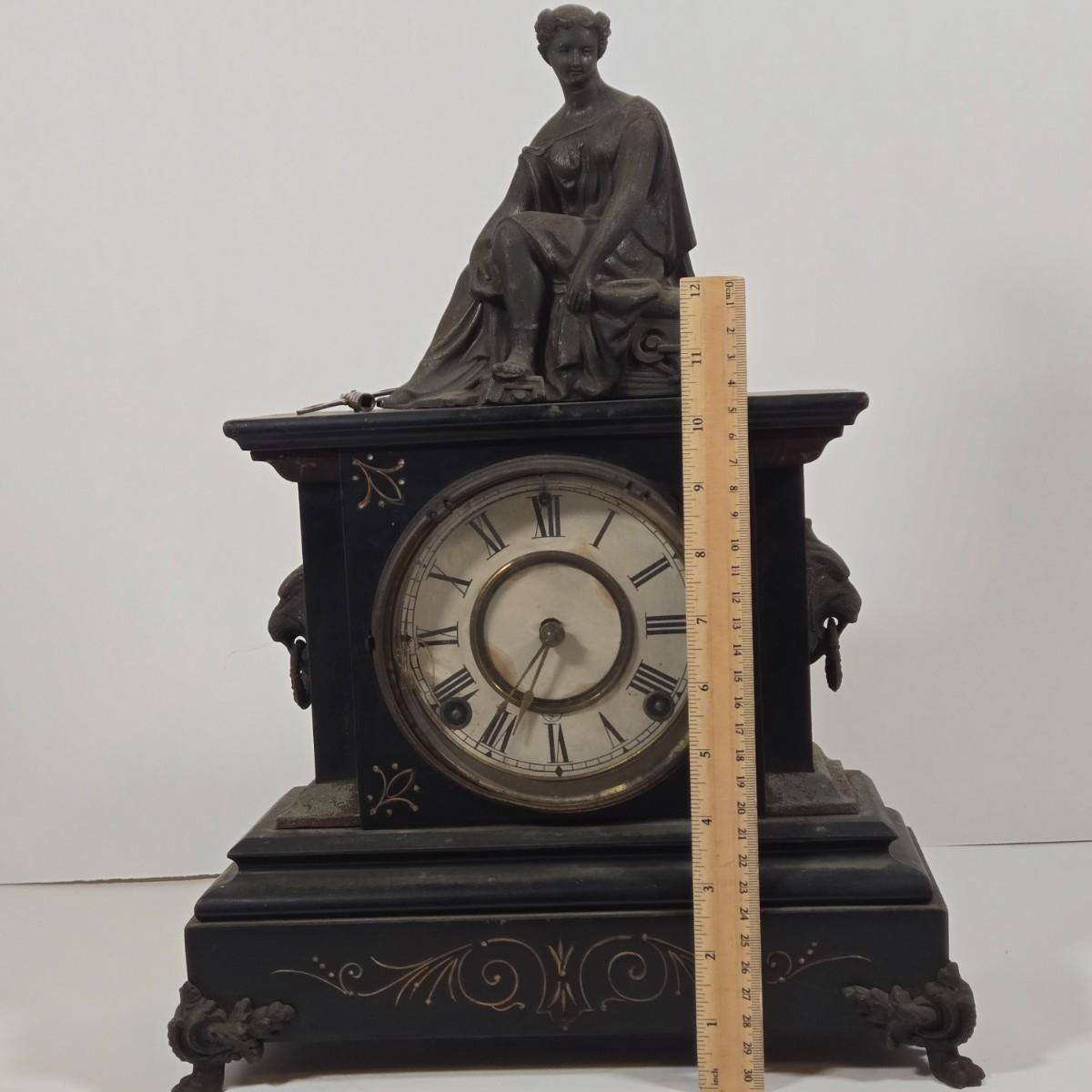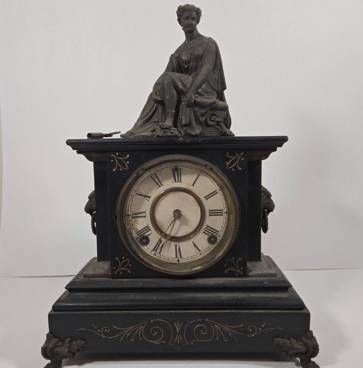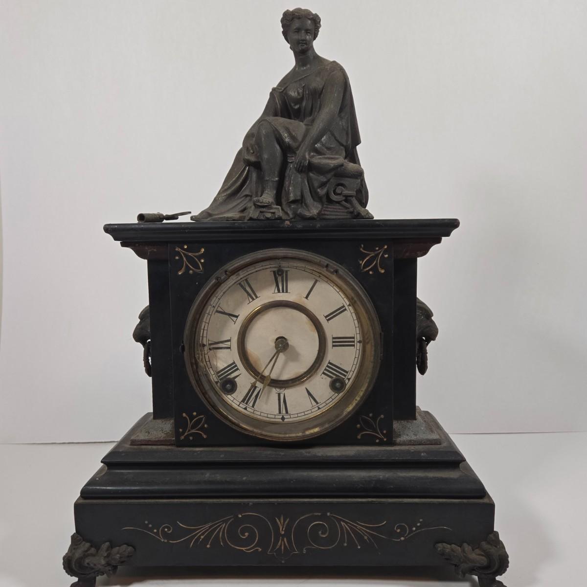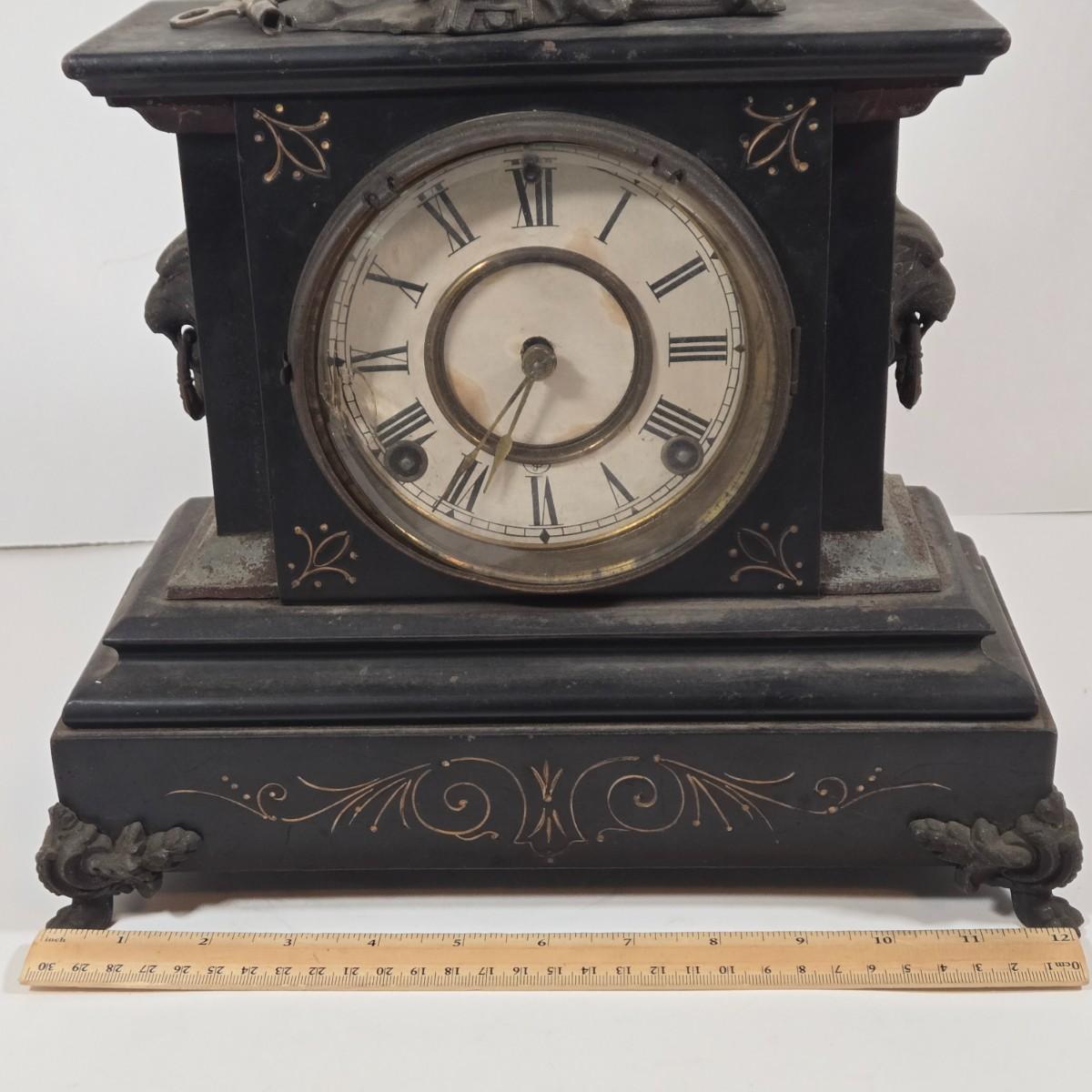LOT 7D: Antique 1800s Cast Iron Ansonia Mantel Clock with Seated Figure