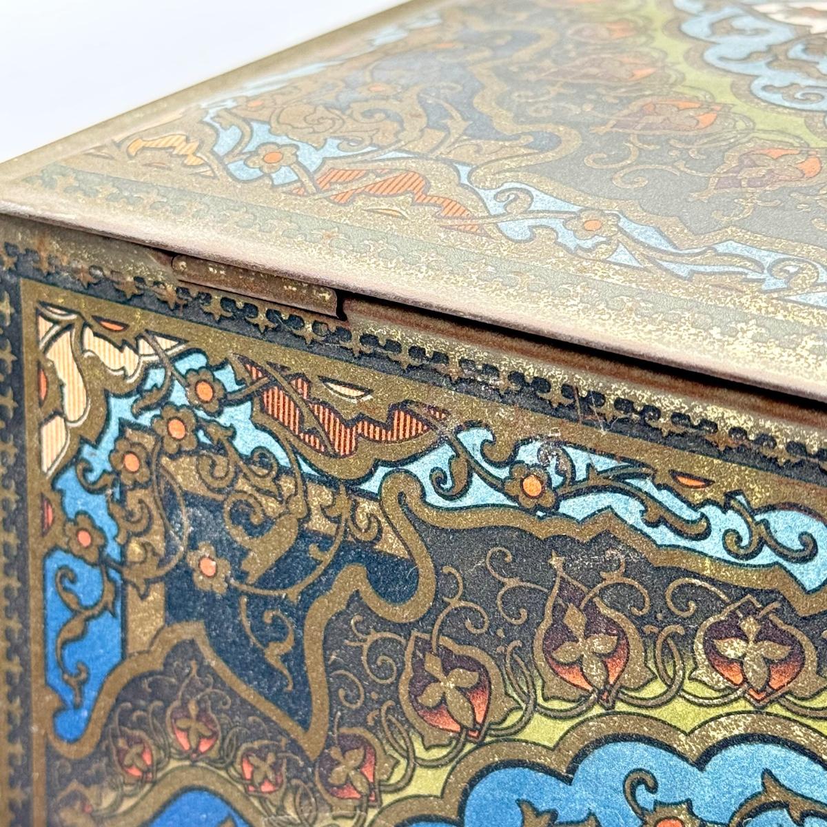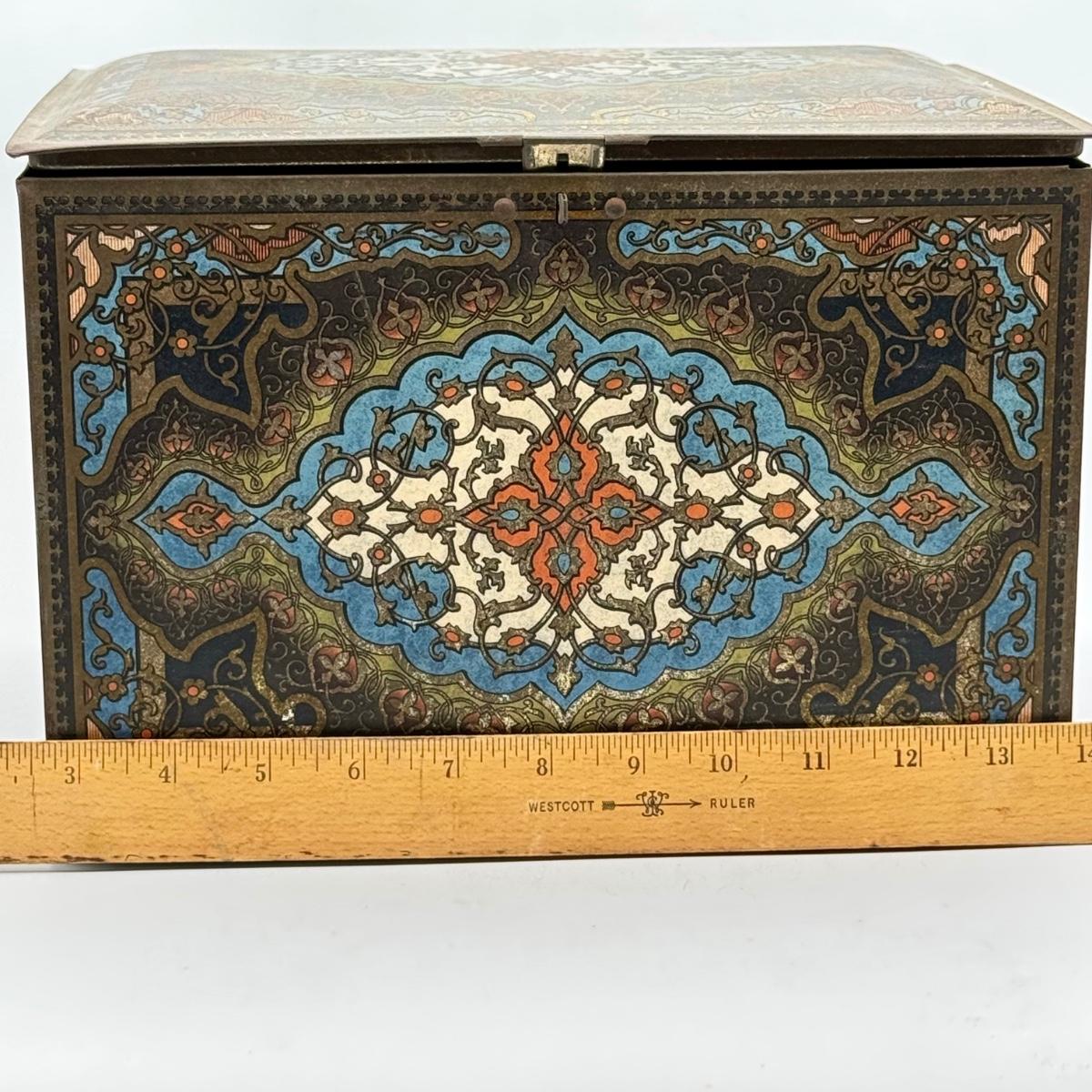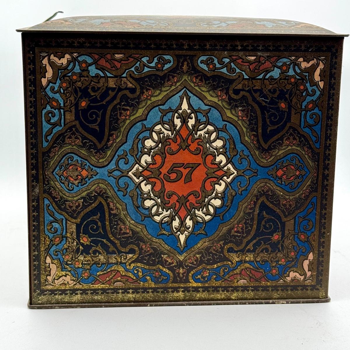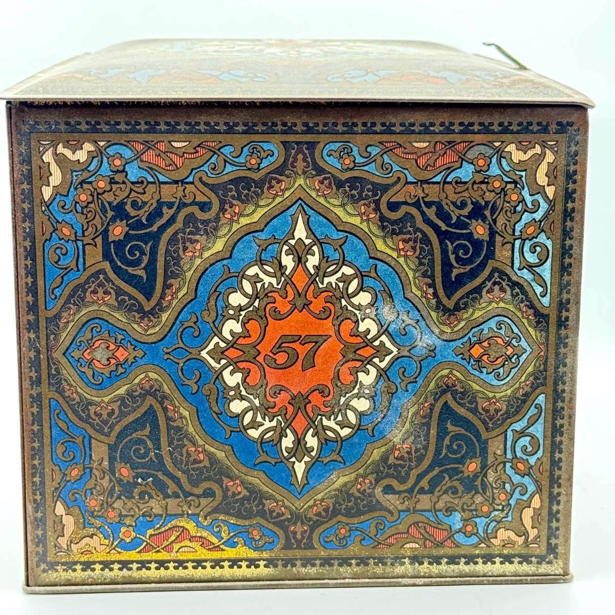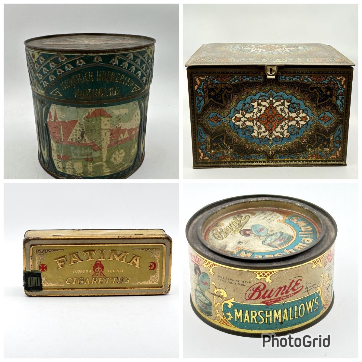 LOT 45P: Assortment of Vintage Tins Including: German Haeberlein-Metzger Gingerbread Tin; Heinz 57 Company Large Biscuit Tin Box; Bunte Marshmallows Tin; and Fatima 100 Turkish Blend Cigarettes Tin