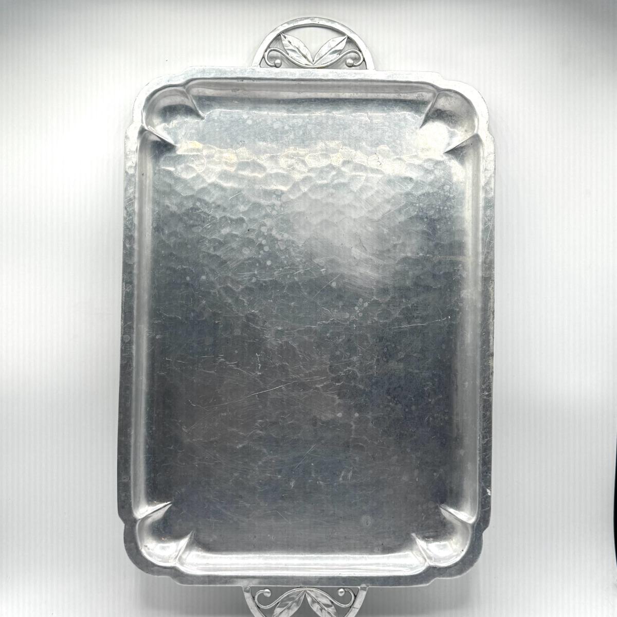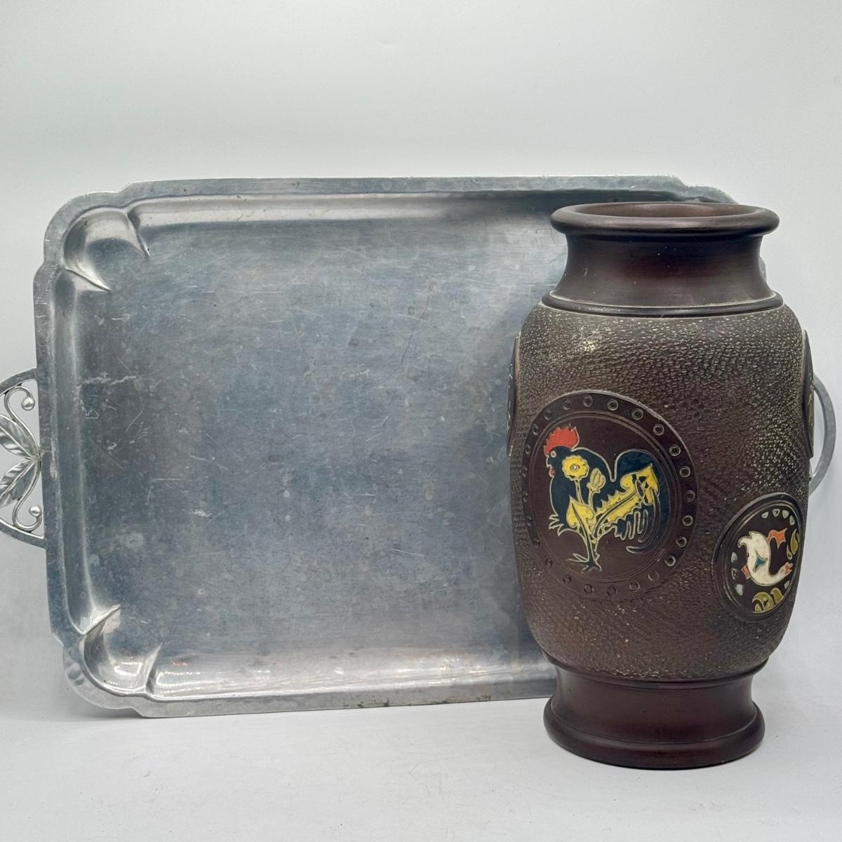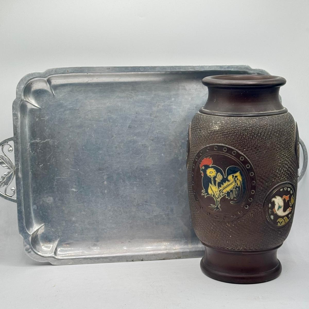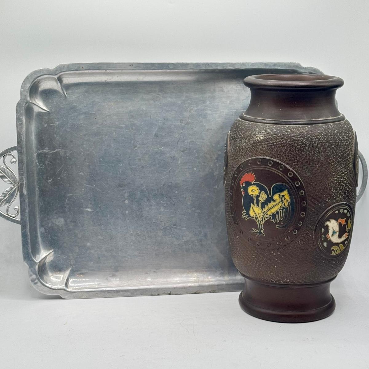 LOT 49D: Vintage Hand Wrought Aluminum Serving Tray and Vintage Japanese Vase