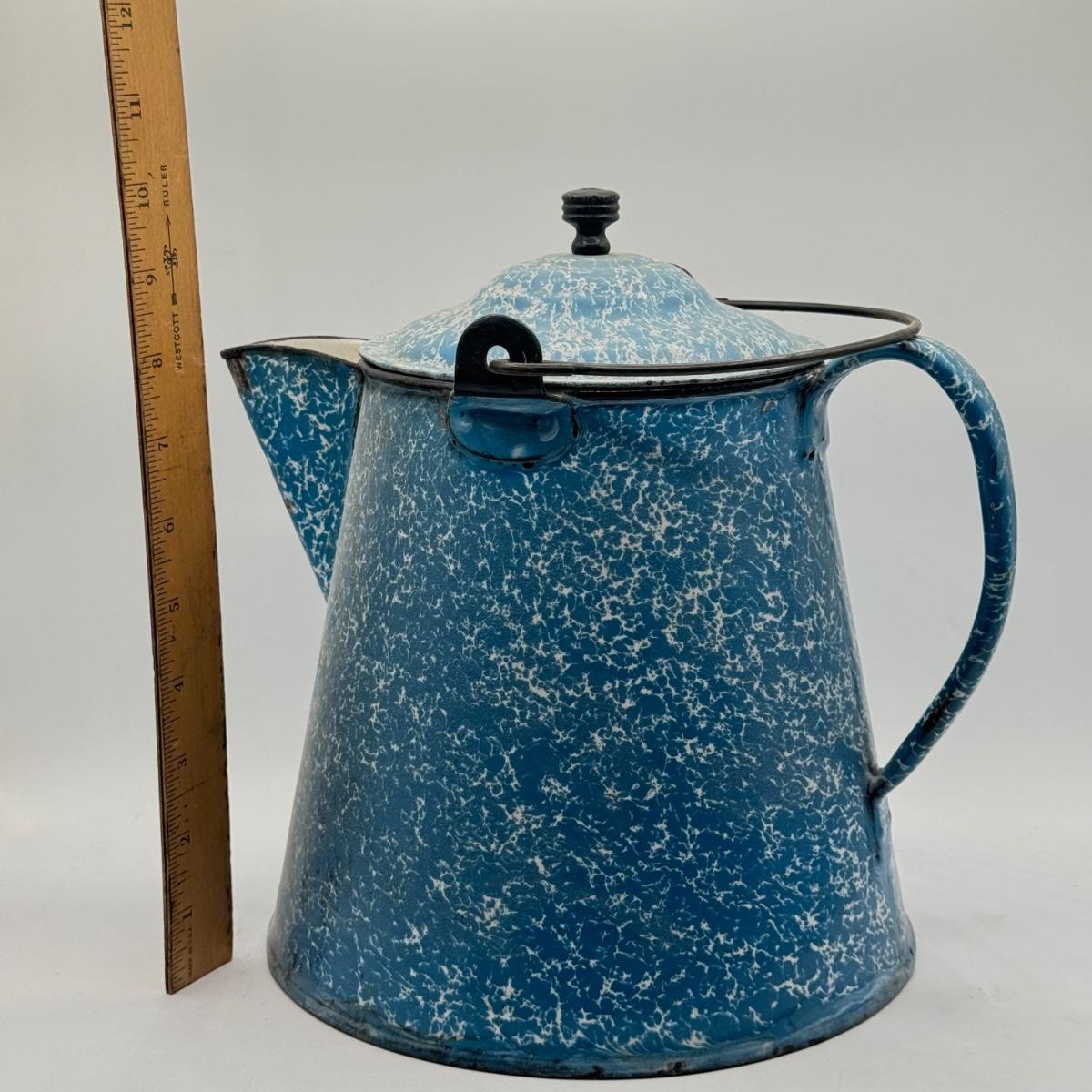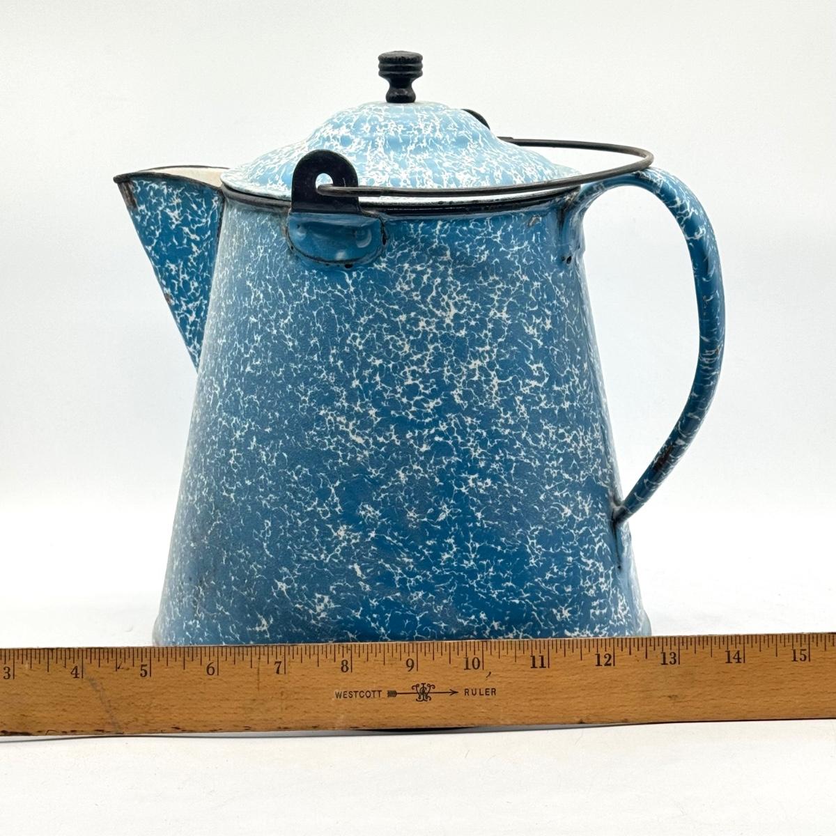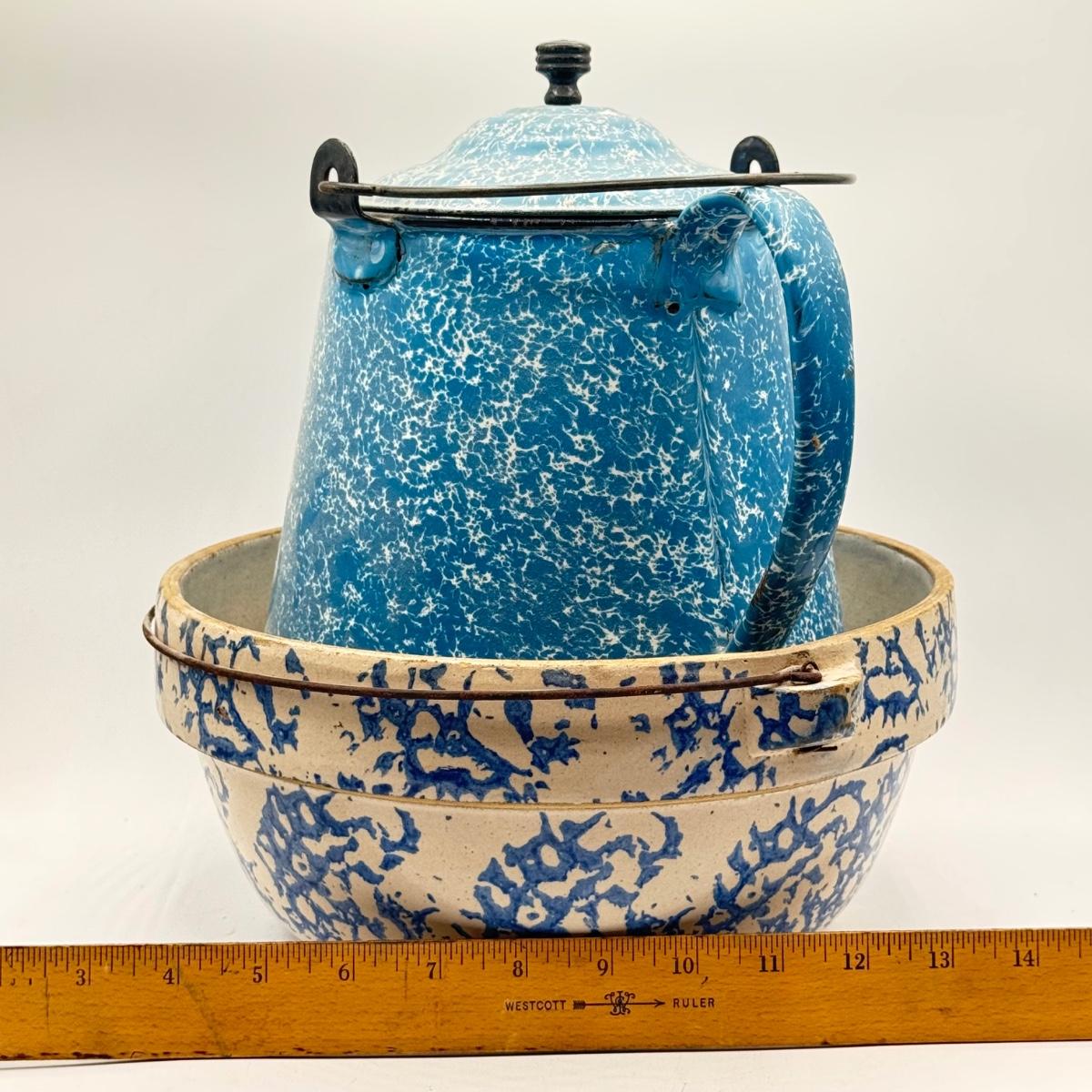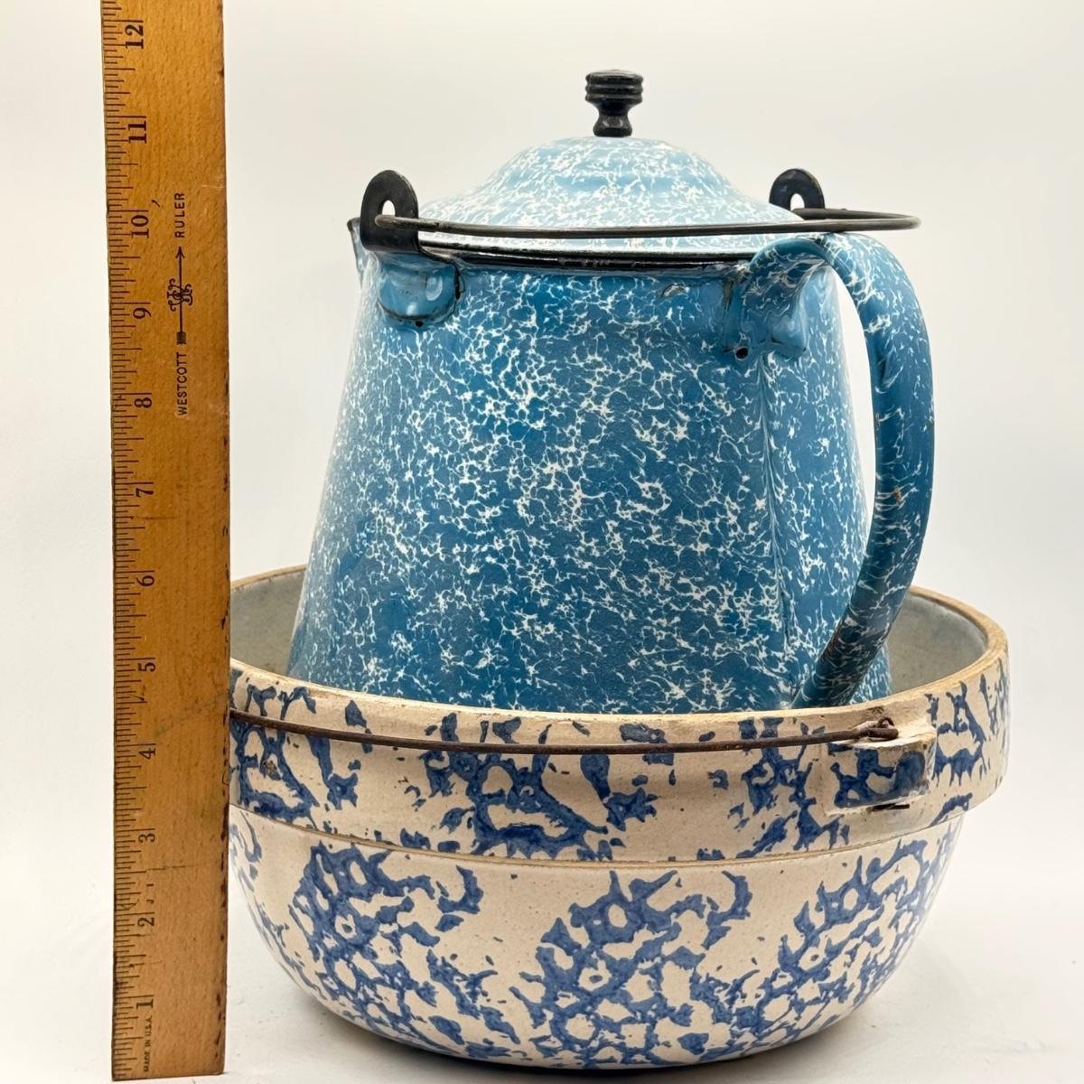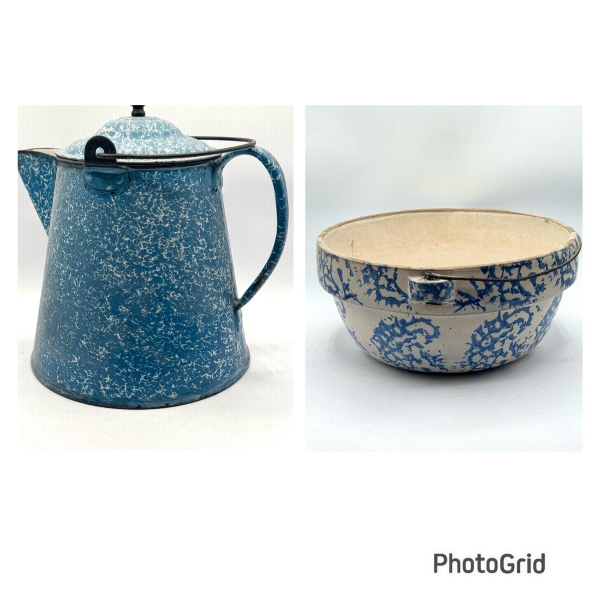LOT 50K: Vintage Blue Speckled Enamel Coffee Pot and Blue and White Spatterware Bowl