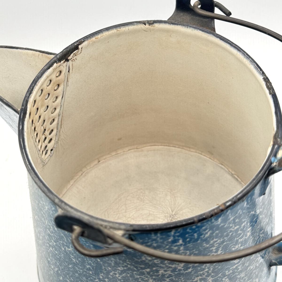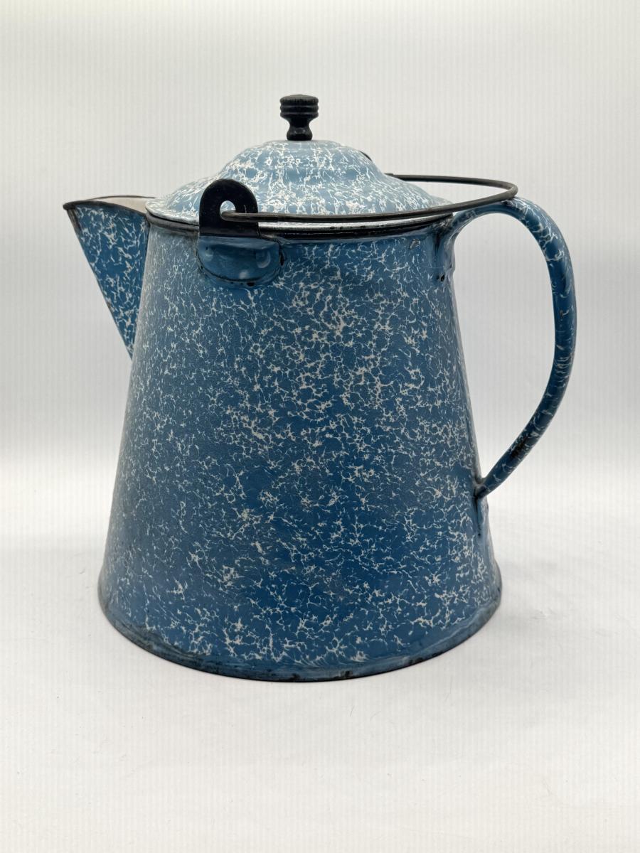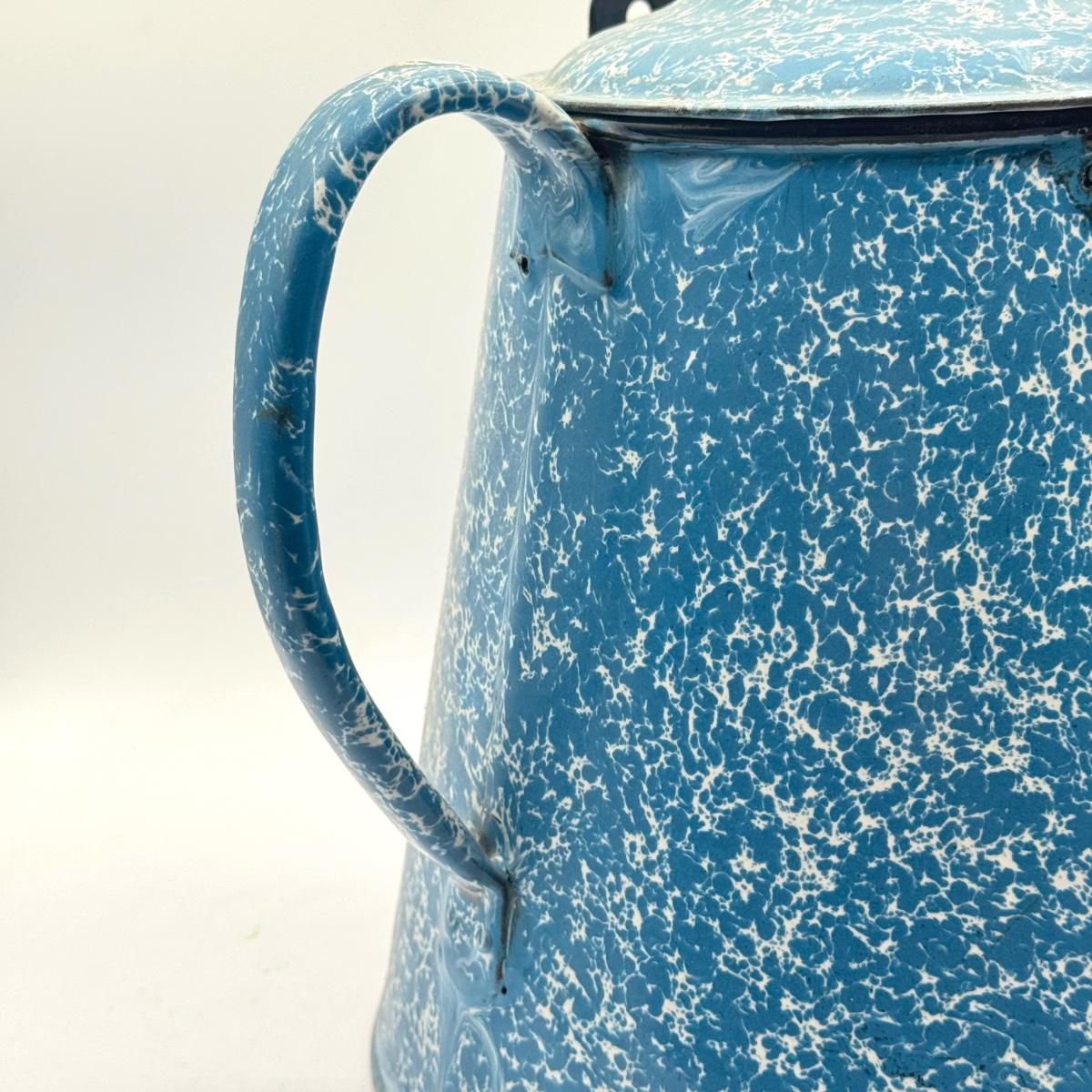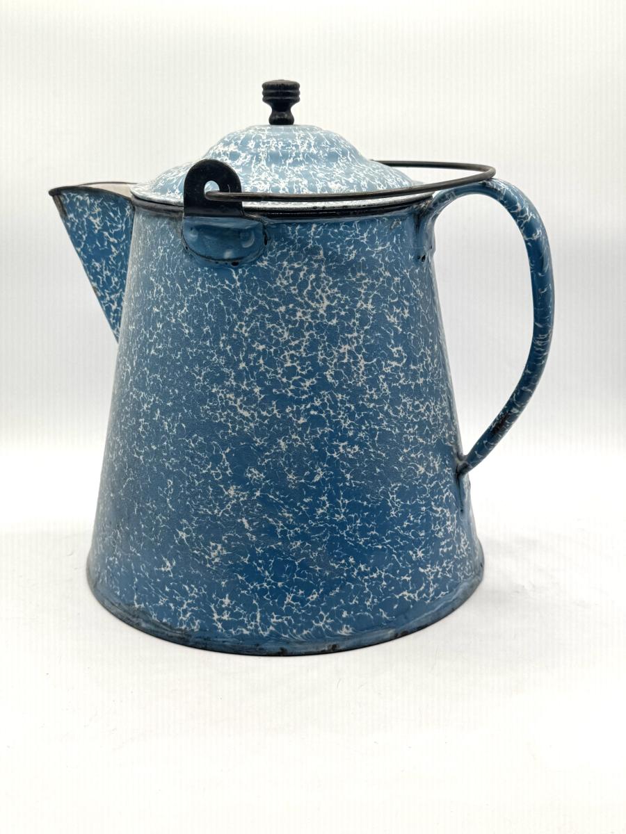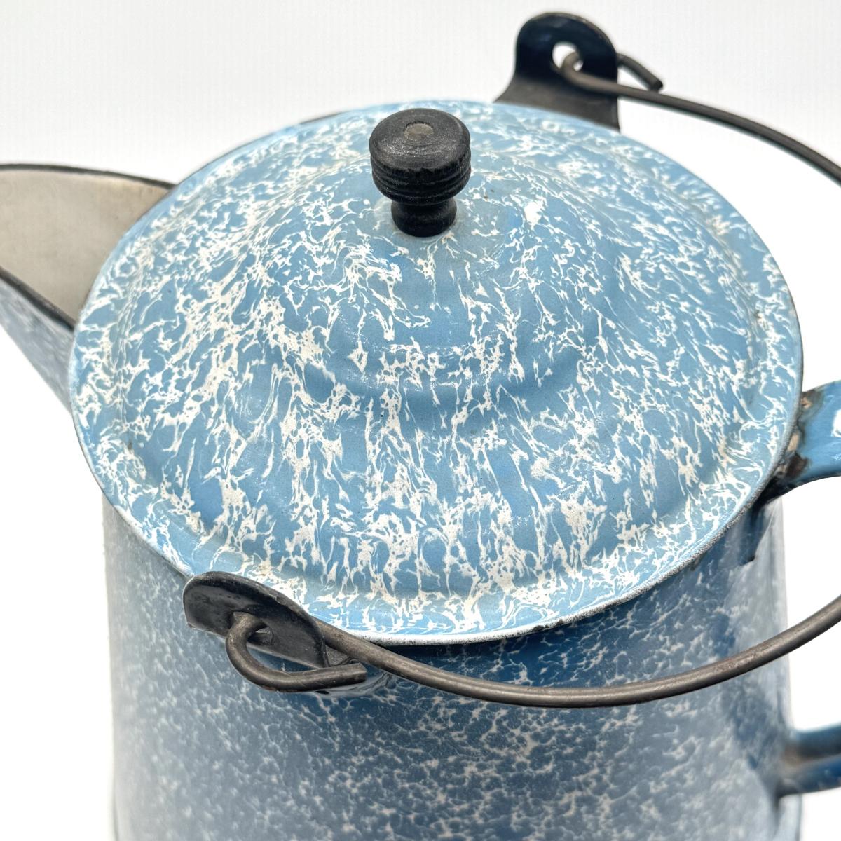 LOT 50K: Vintage Blue Speckled Enamel Coffee Pot and Blue and White Spatterware Bowl
