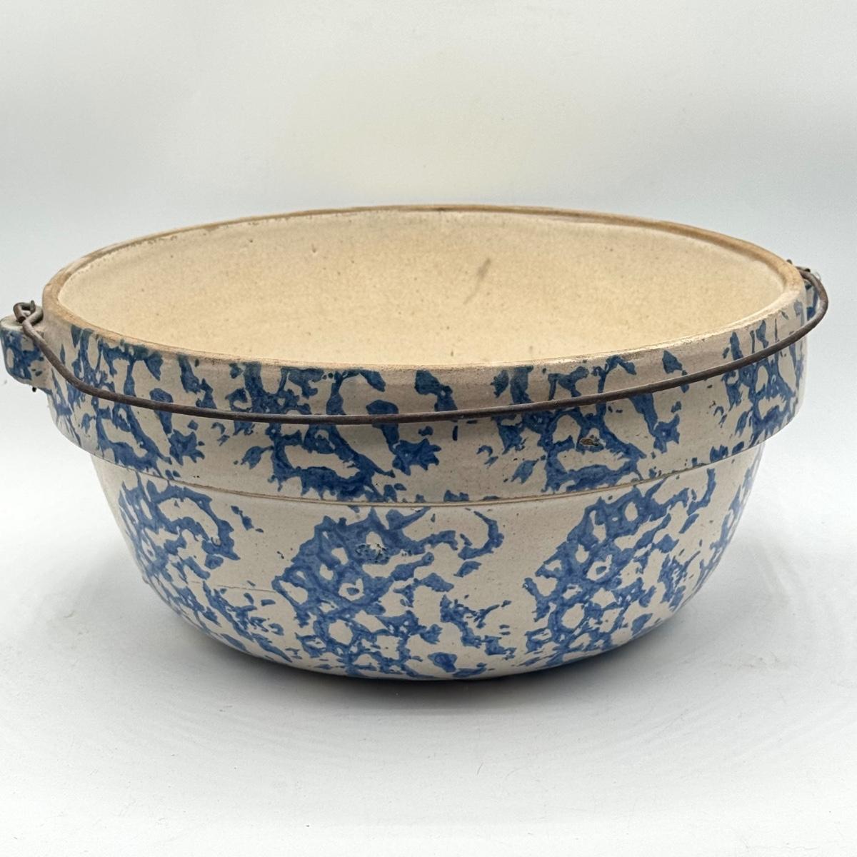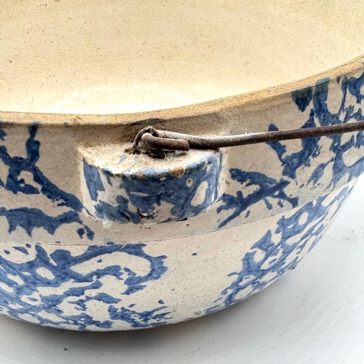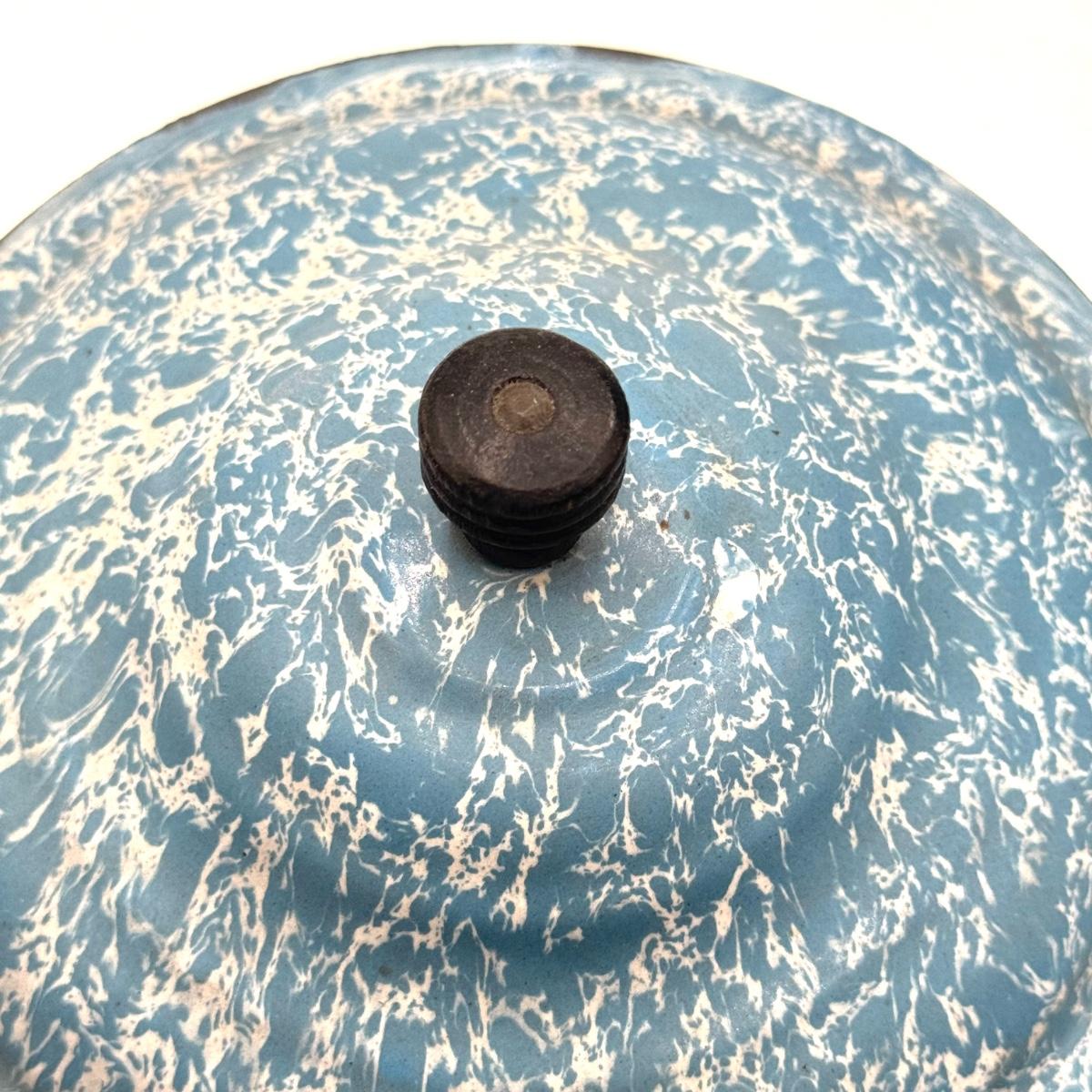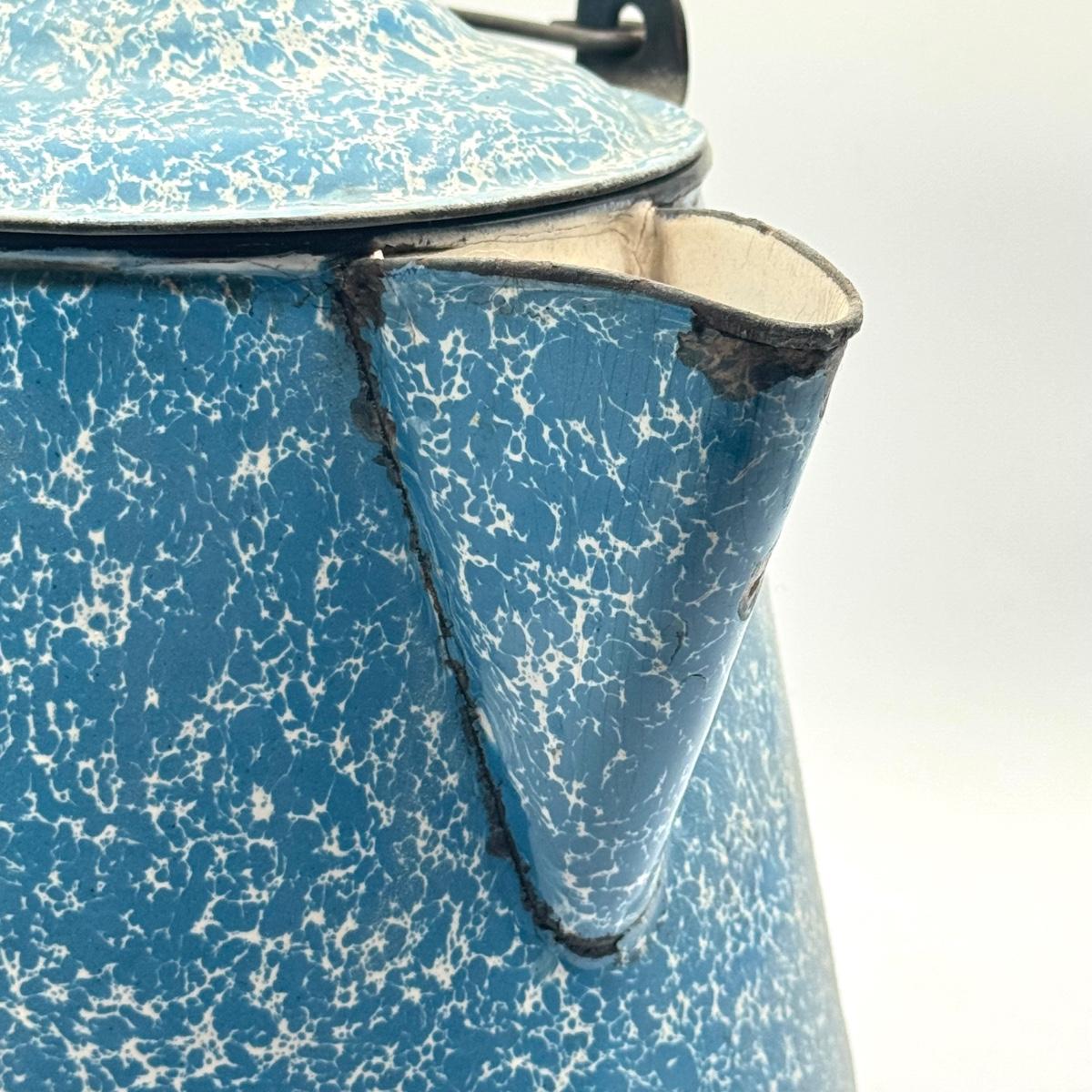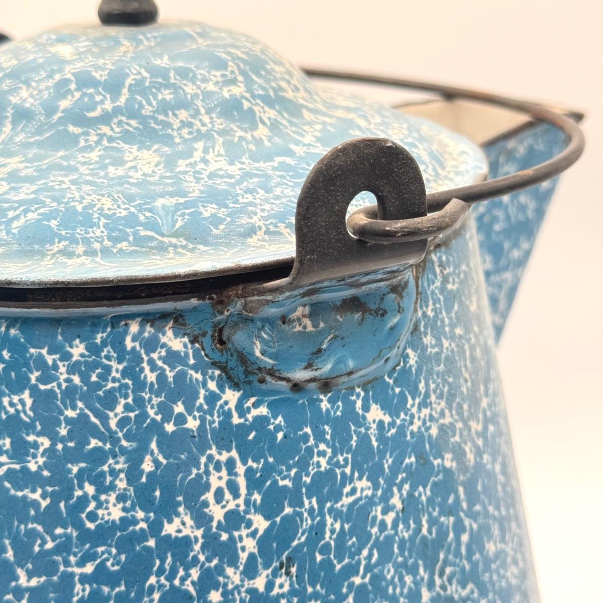 LOT 50K: Vintage Blue Speckled Enamel Coffee Pot and Blue and White Spatterware Bowl