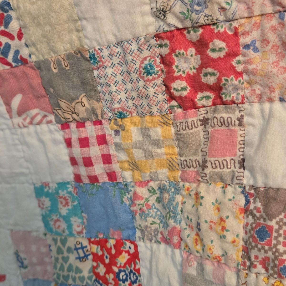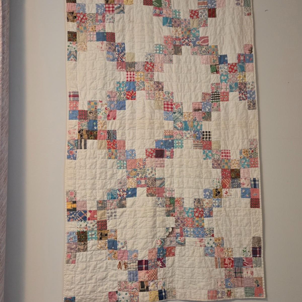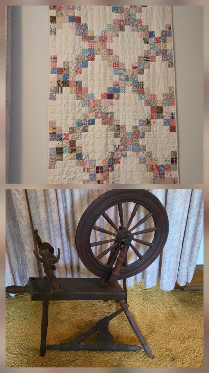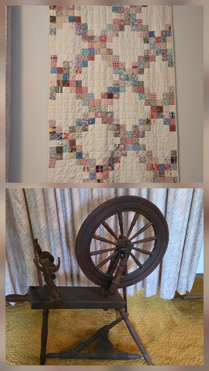 LOT 65L: Antique Spinning Wheel and Triple Irish Chain Baby Quilt