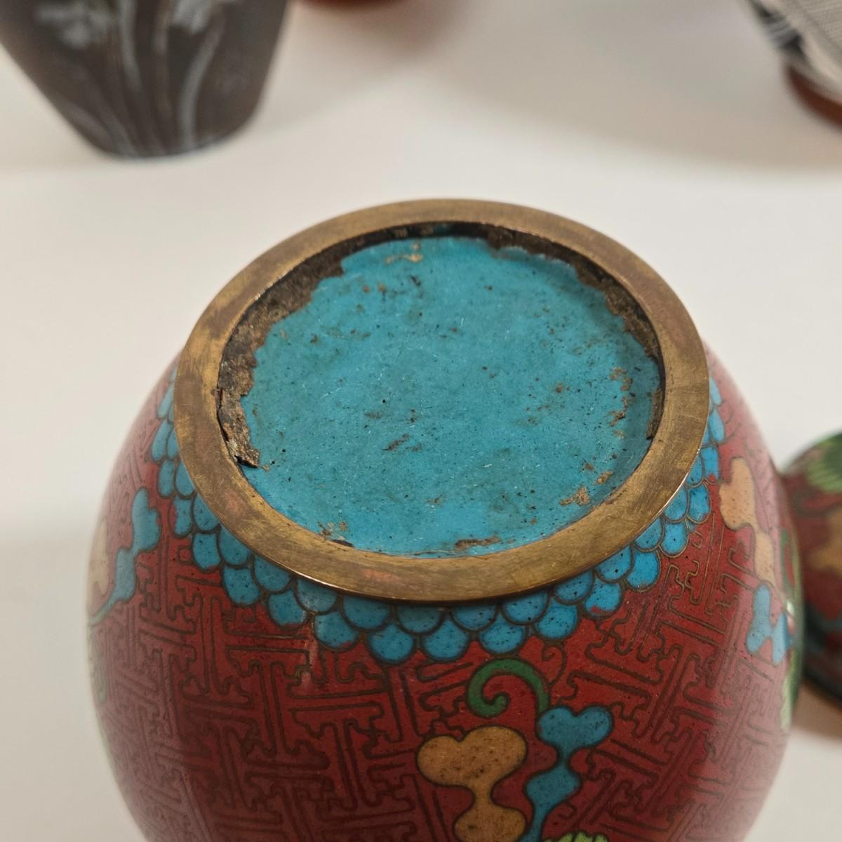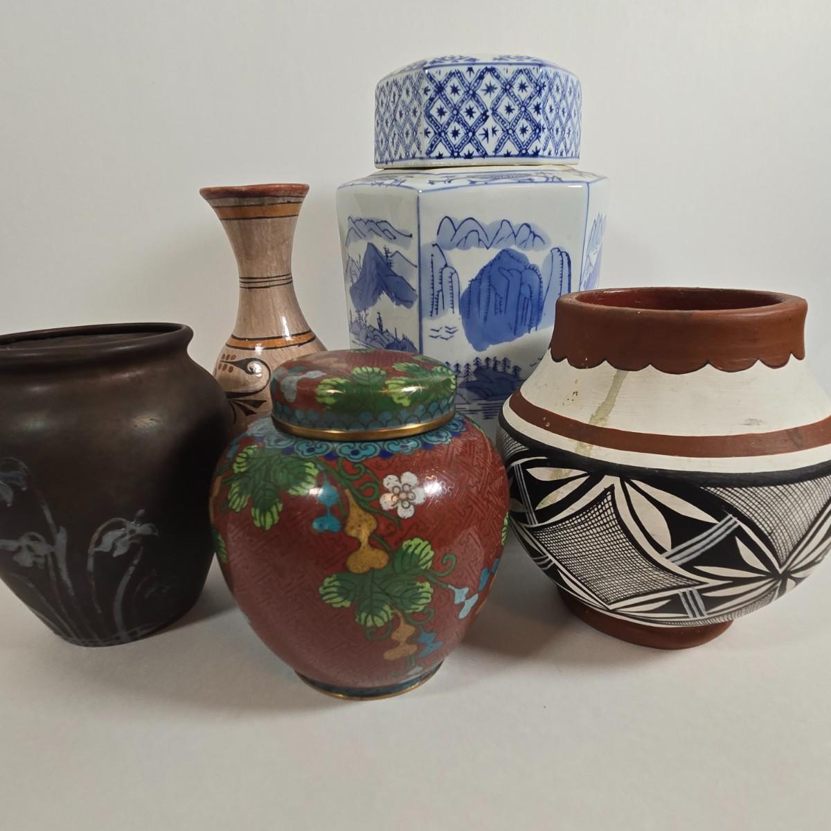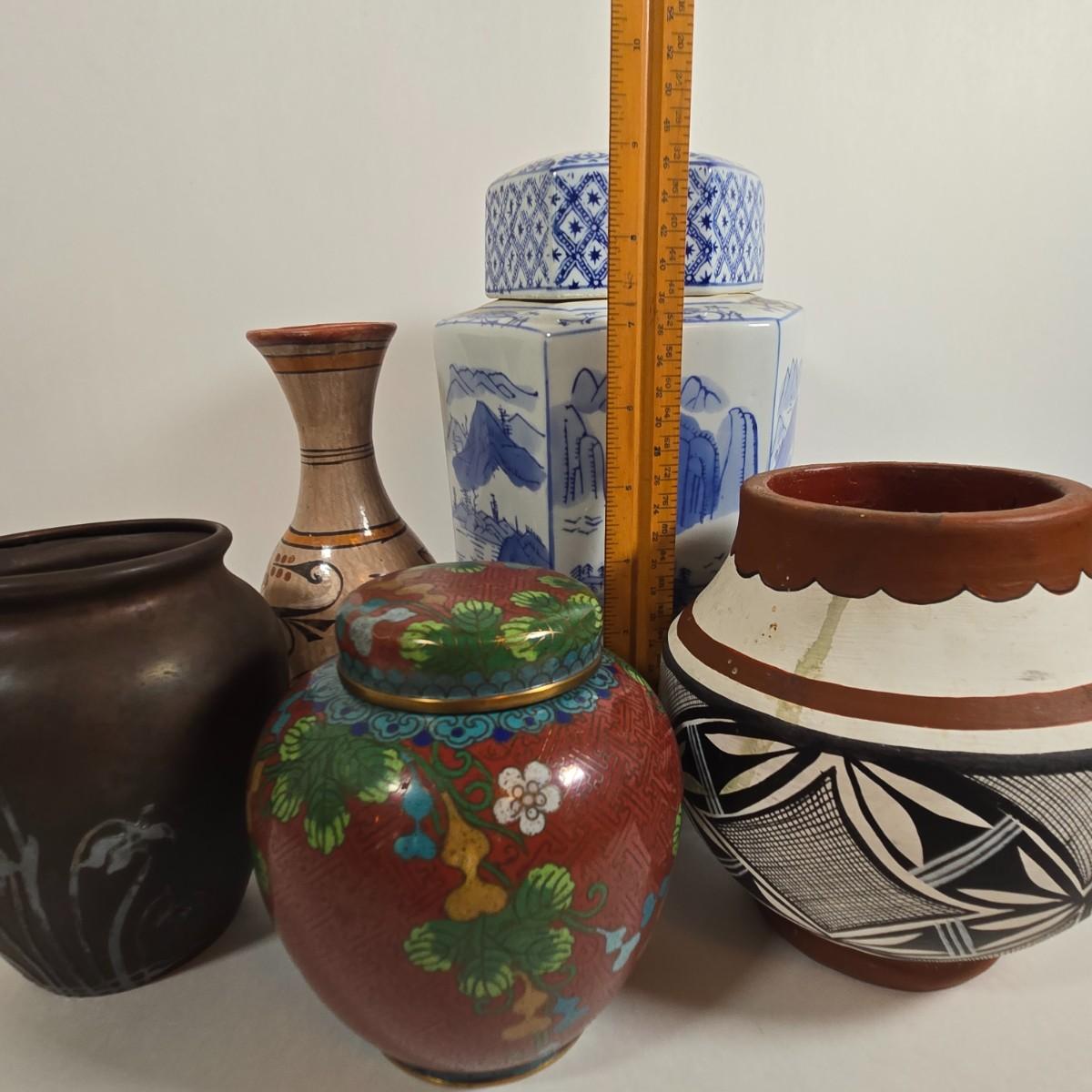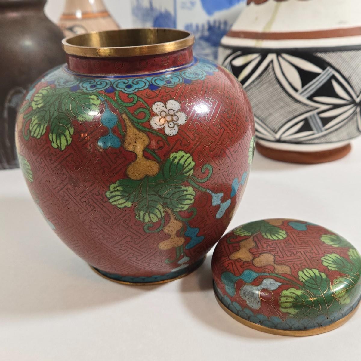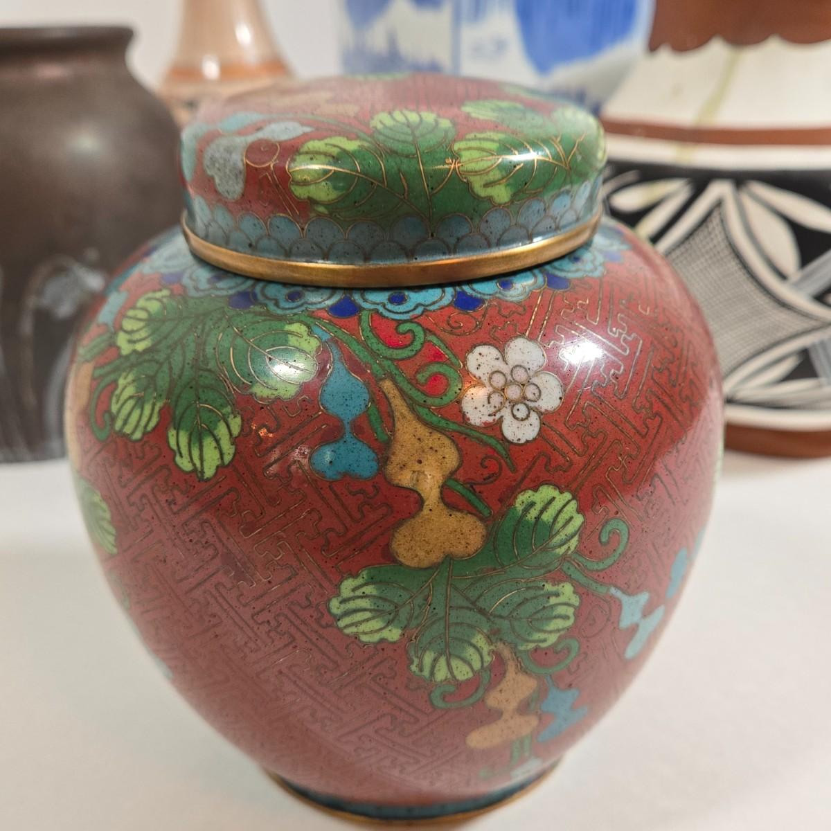 LOT 86L: Asian Cloisonne Lidded Ginger Jar, Native American Pottery, Sterling on Bronze Vase, Mexican Ceramic Art Vase, Traditional Asin Ceramic Lidded Jar