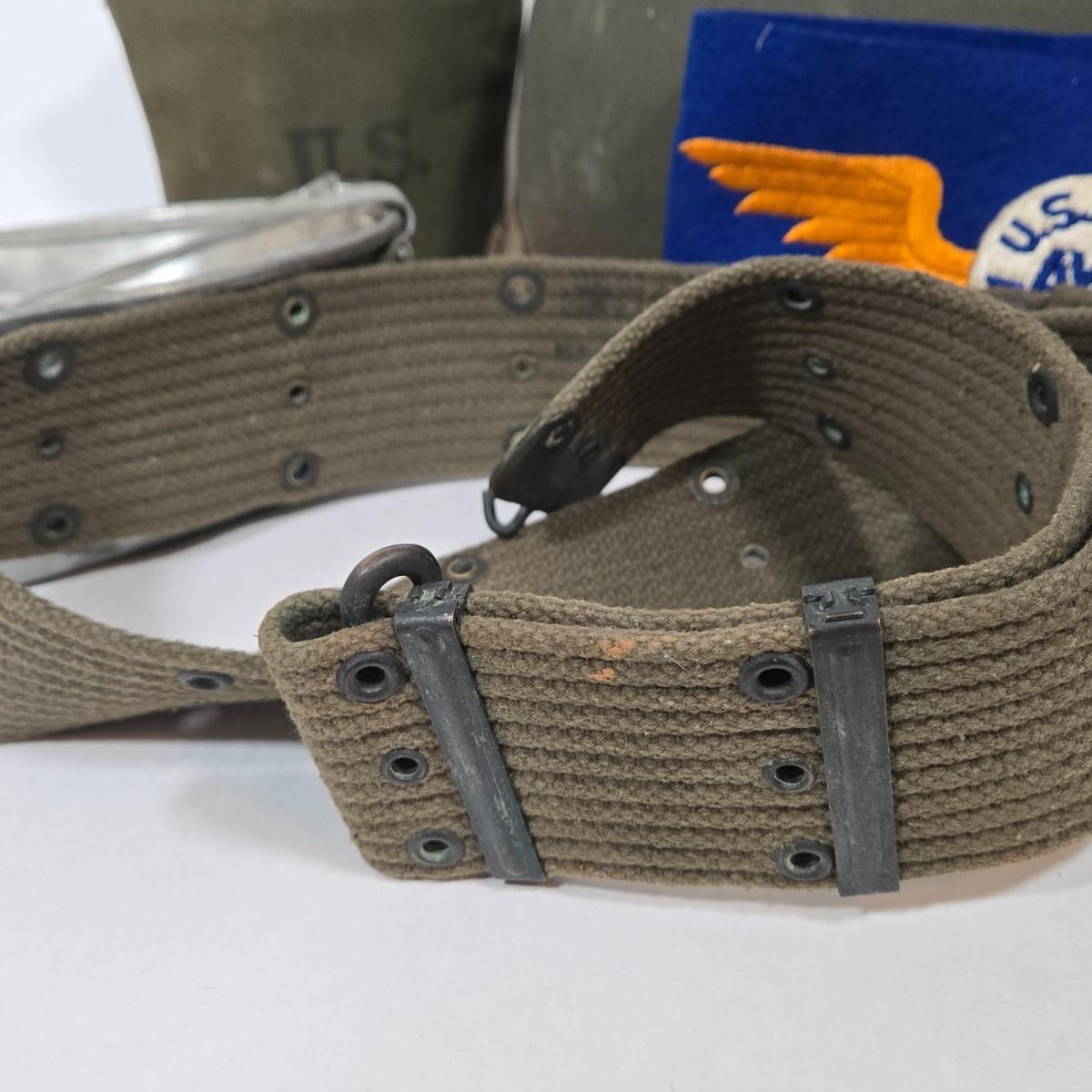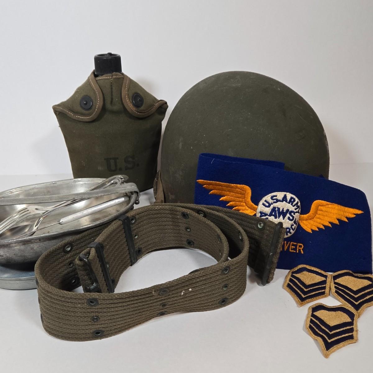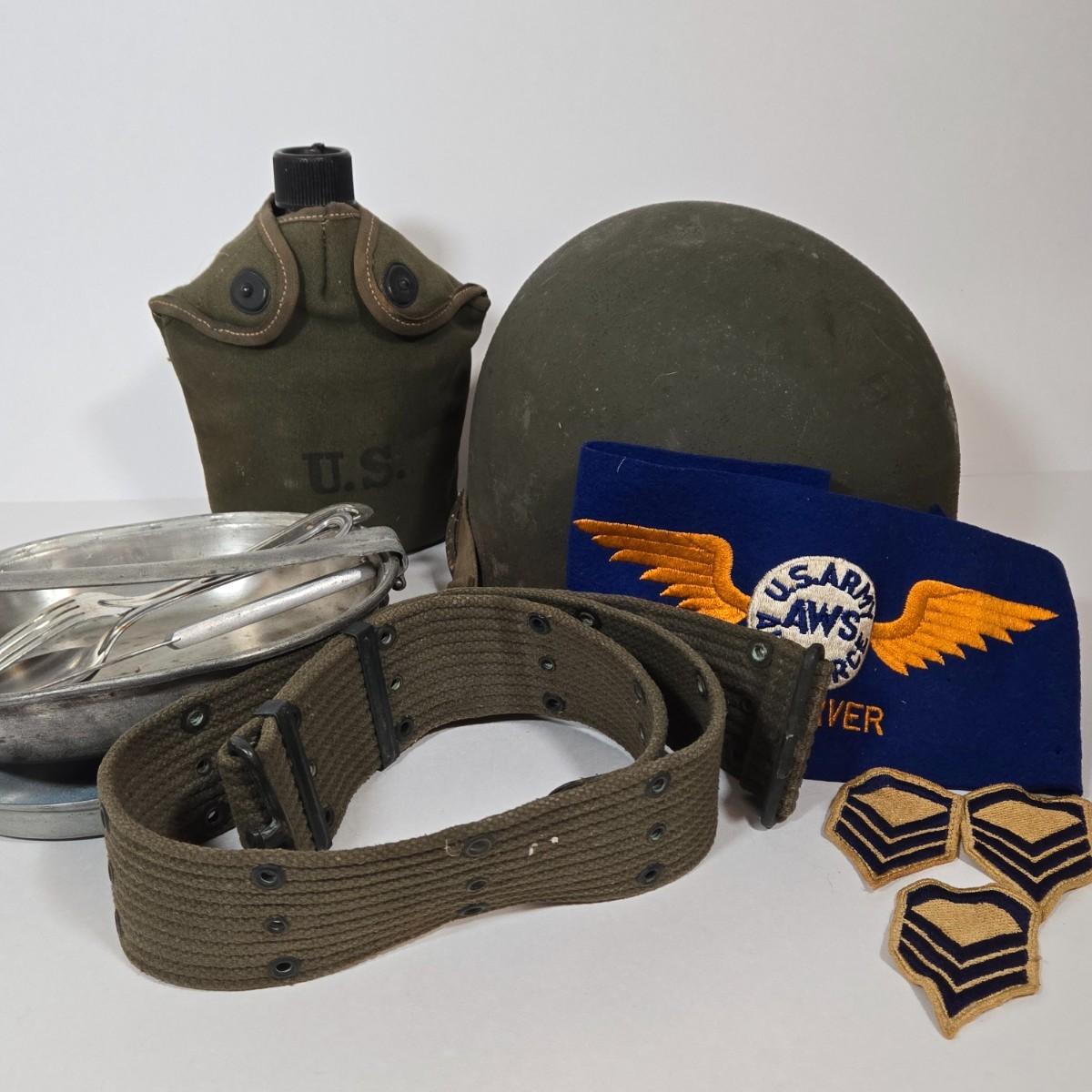 LOT 93L: Vintage U.S. Military Combat Helmet, Belt, Canteen, Mess Kit, Patches, and More