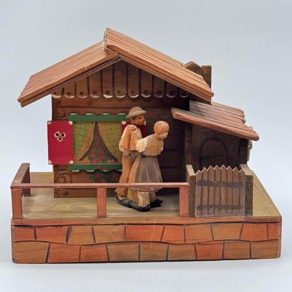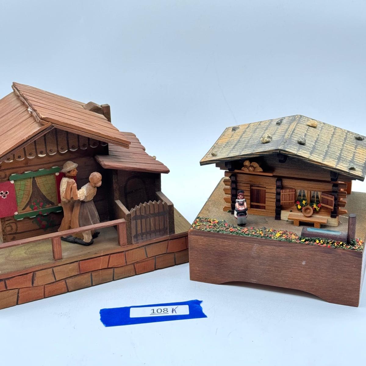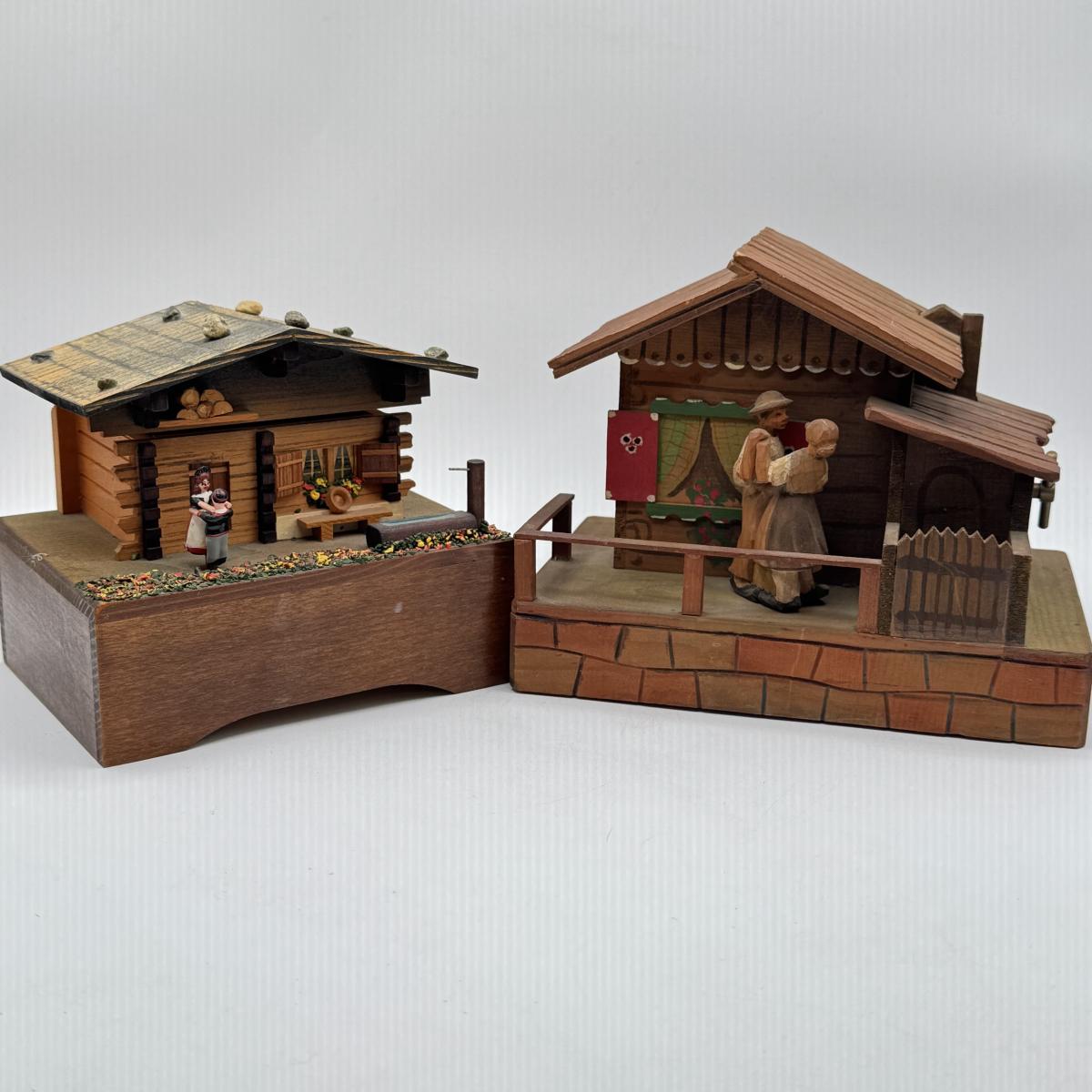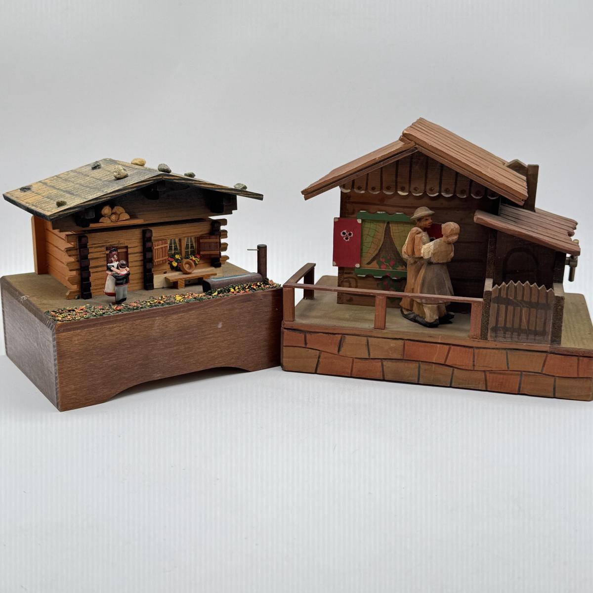 LOT 108K: Two Vintage Swiss Chalet-Styled Music and Jewelry Boxes Hand-Carved and Hand-Painted Pine