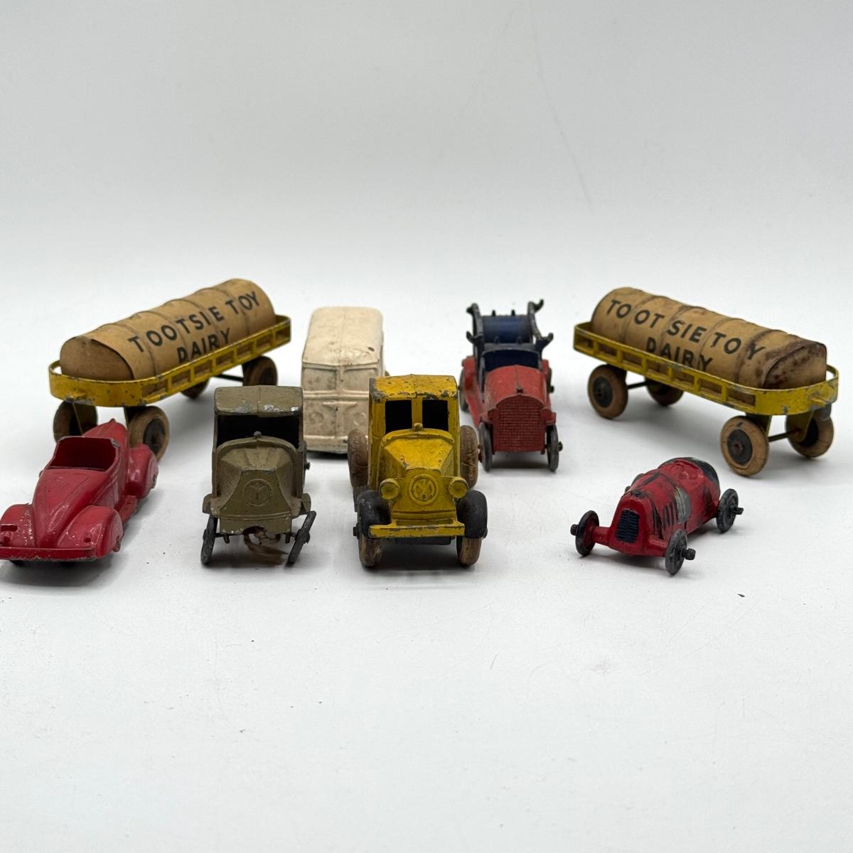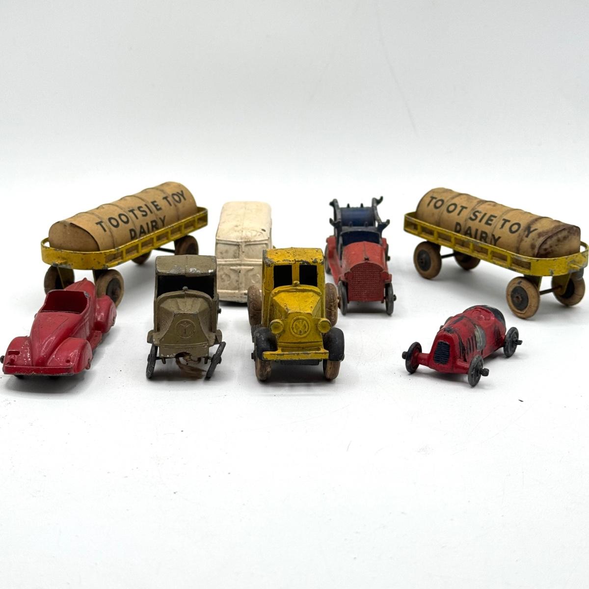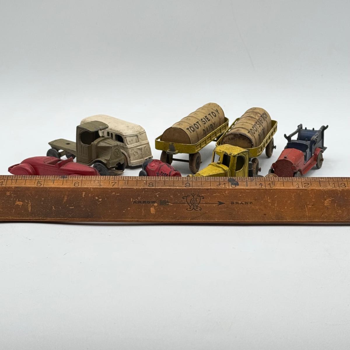 LOT 110K: Vintage Collection of Die Cast, Slush Cast Cast Iron Toy Cars, Featuring Tootsietoys Mack Truck with 2 Dairy Tankers, a Hubley Fishtail Model Car and More from the 20s through 40s
