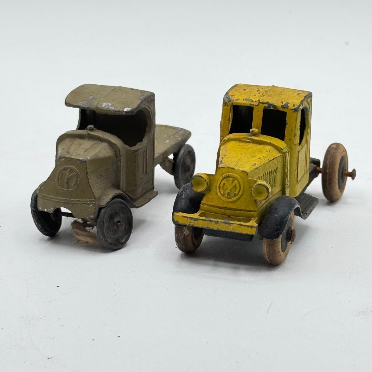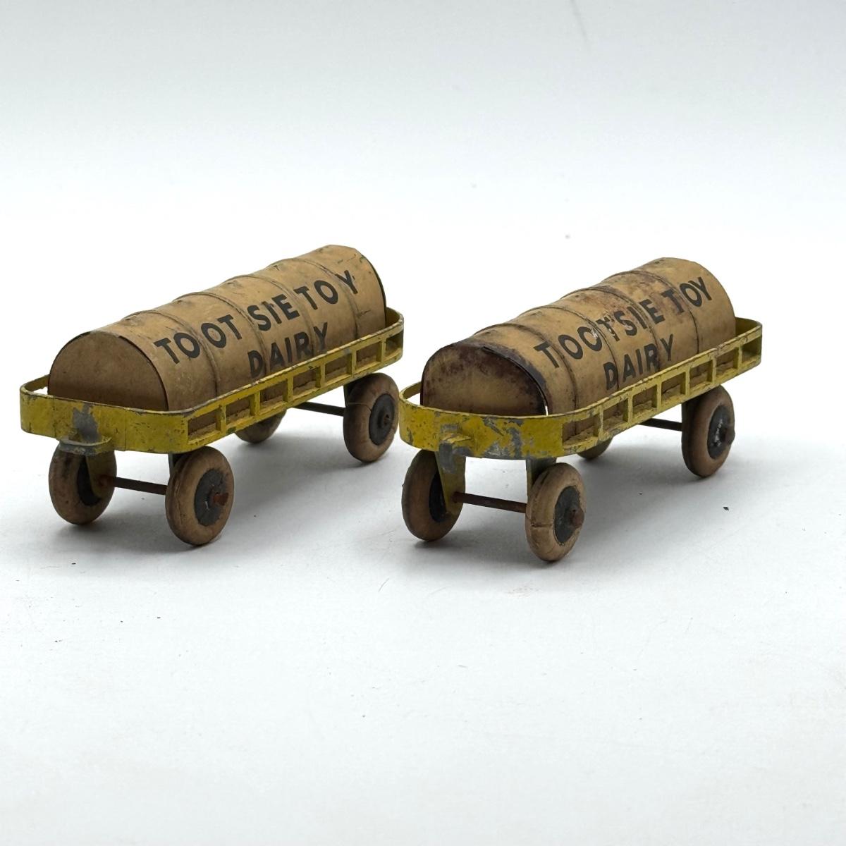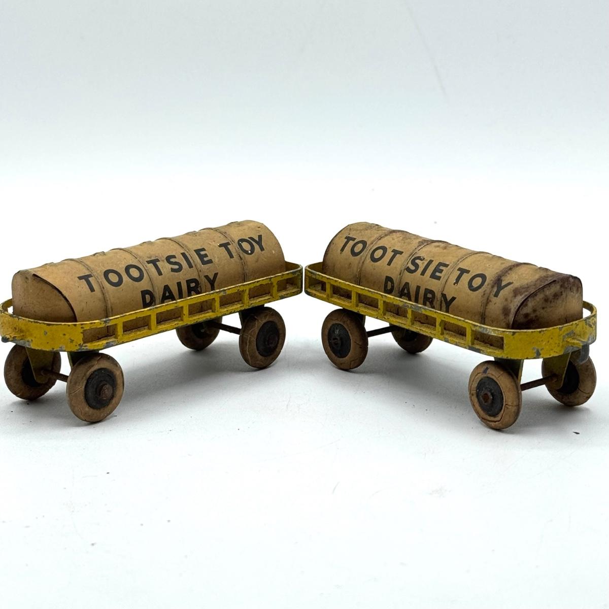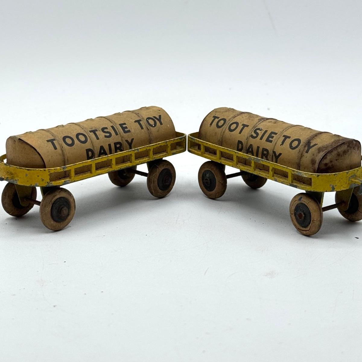 LOT 110K: Vintage Collection of Die Cast, Slush Cast Cast Iron Toy Cars, Featuring Tootsietoys Mack Truck with 2 Dairy Tankers, a Hubley Fishtail Model Car and More from the 20s through 40s