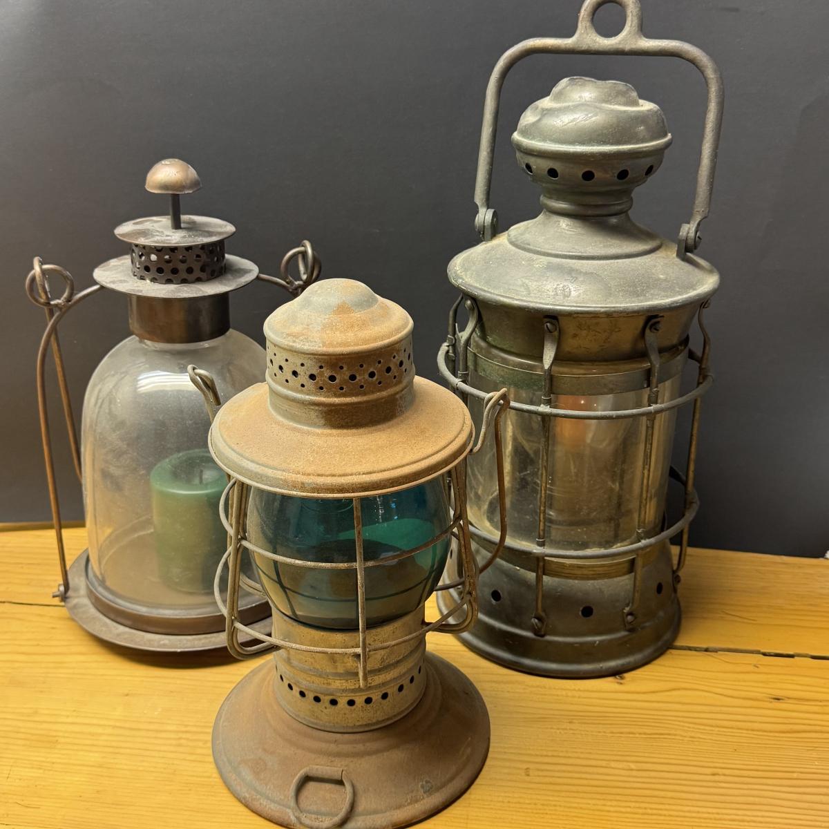 LOT 124B: Vintage Erie RR CT Ham #39 Railroad Lantern, Antique Brass Ship Lantern and Vintage Candle Lantern