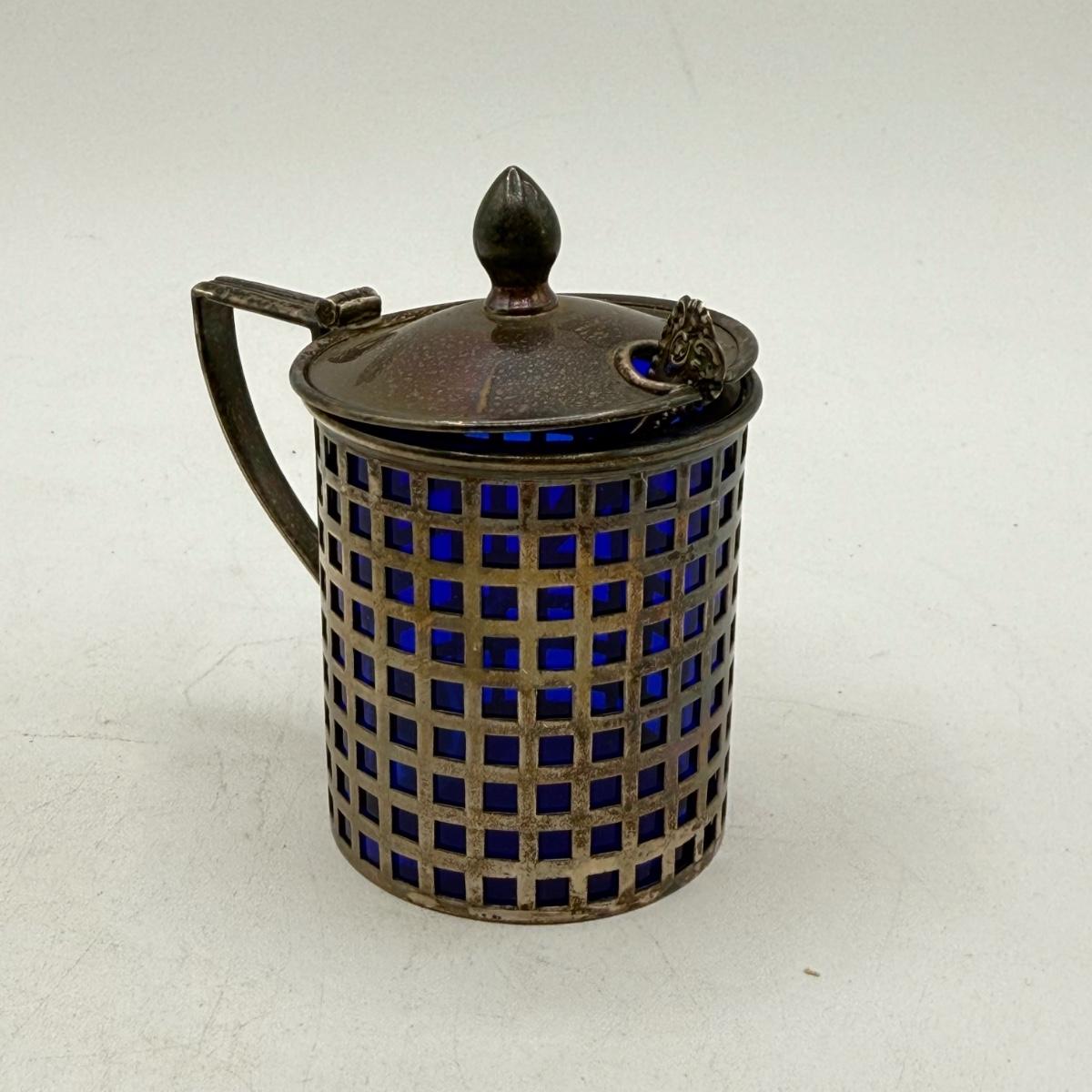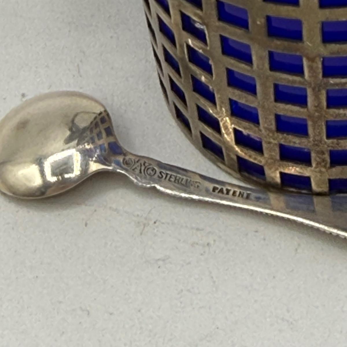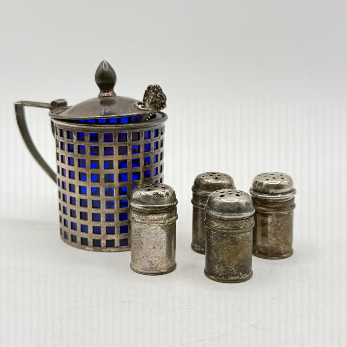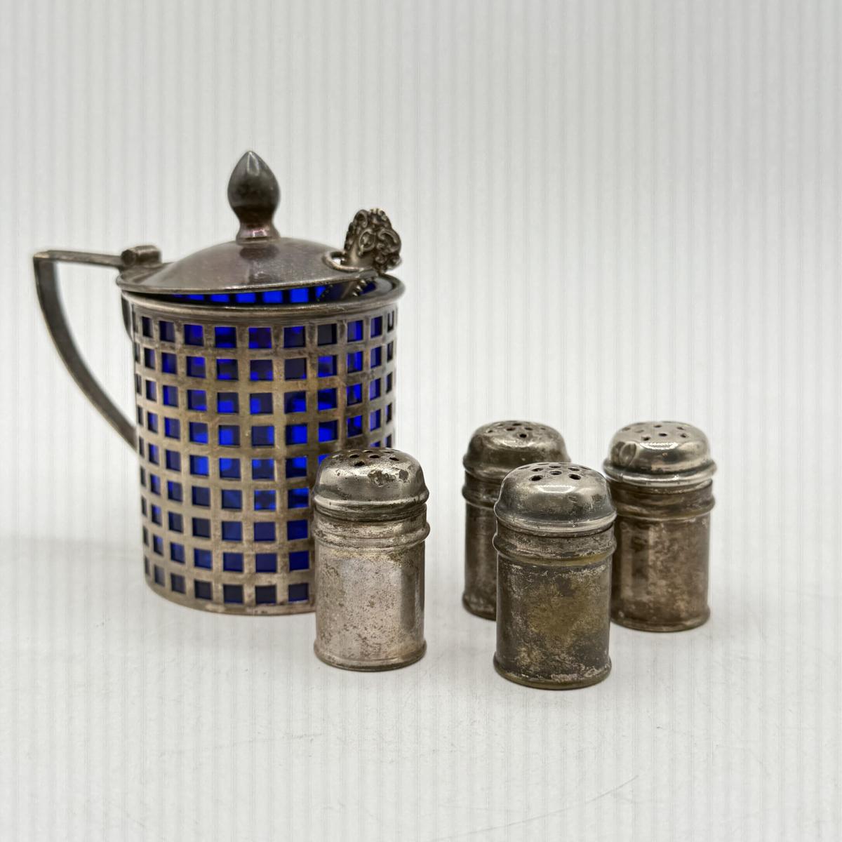 LOT 183K: Antique Cobalt Glass and Sterling Silver Condiment Pot w/ Spoon & Sterling Salt Shakers