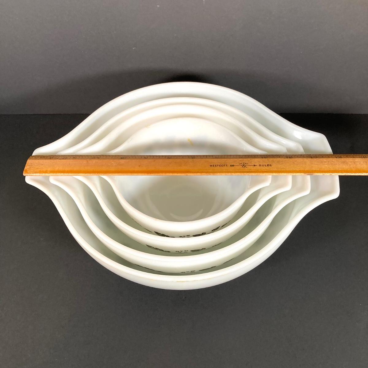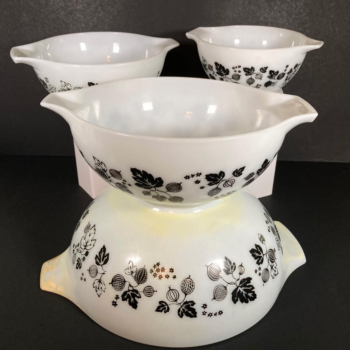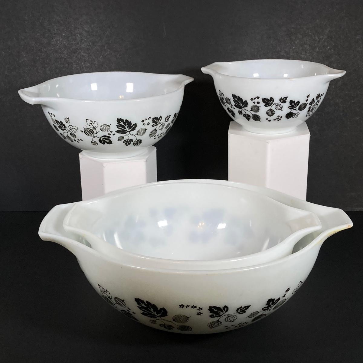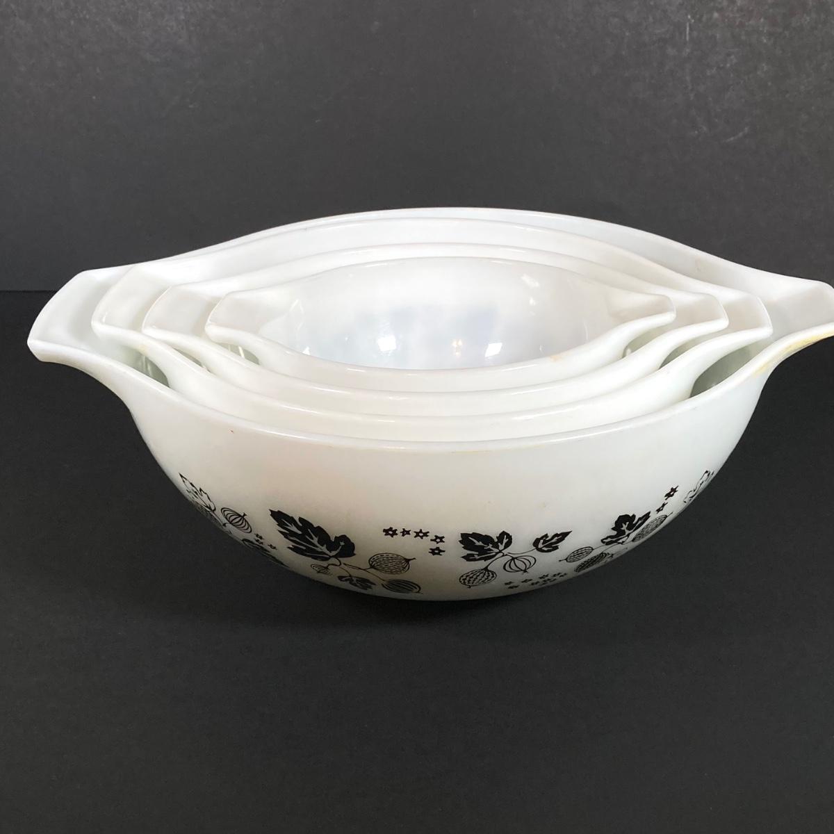 LOT 245: Vintage Pyrex Gooseberry Cinderella Mixing Bowl Four Piece Set (White / Black)