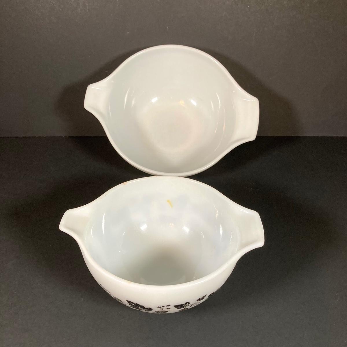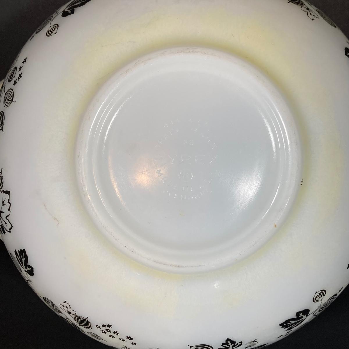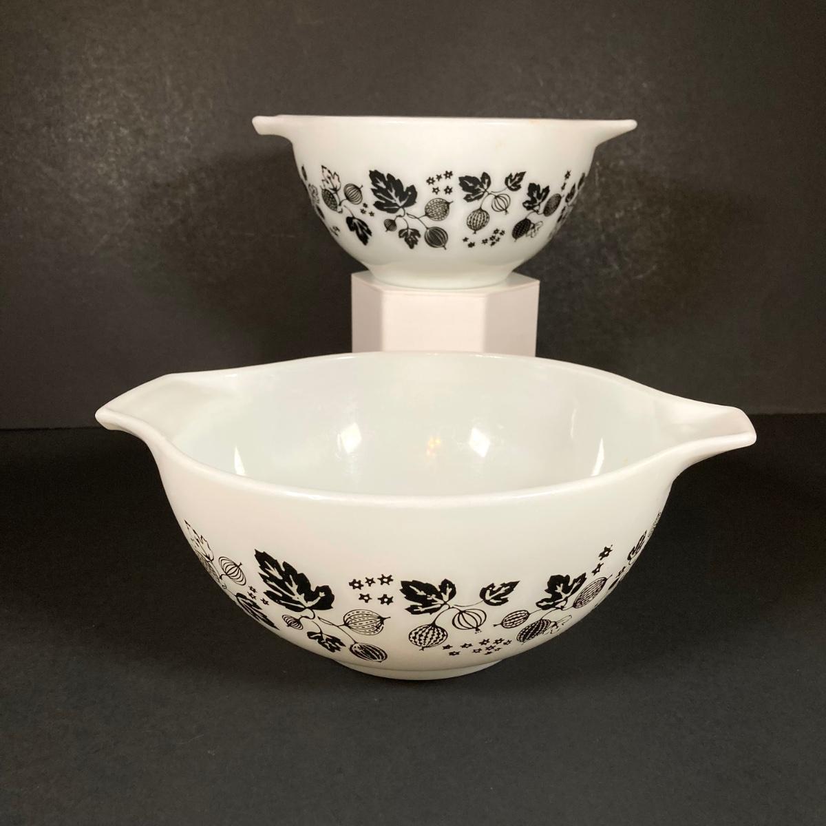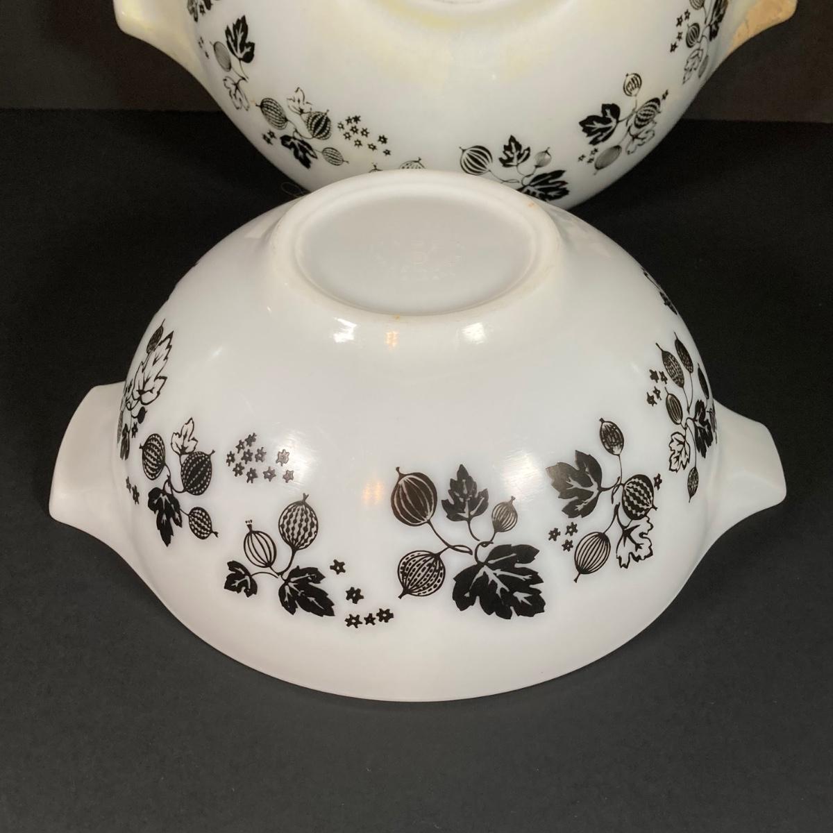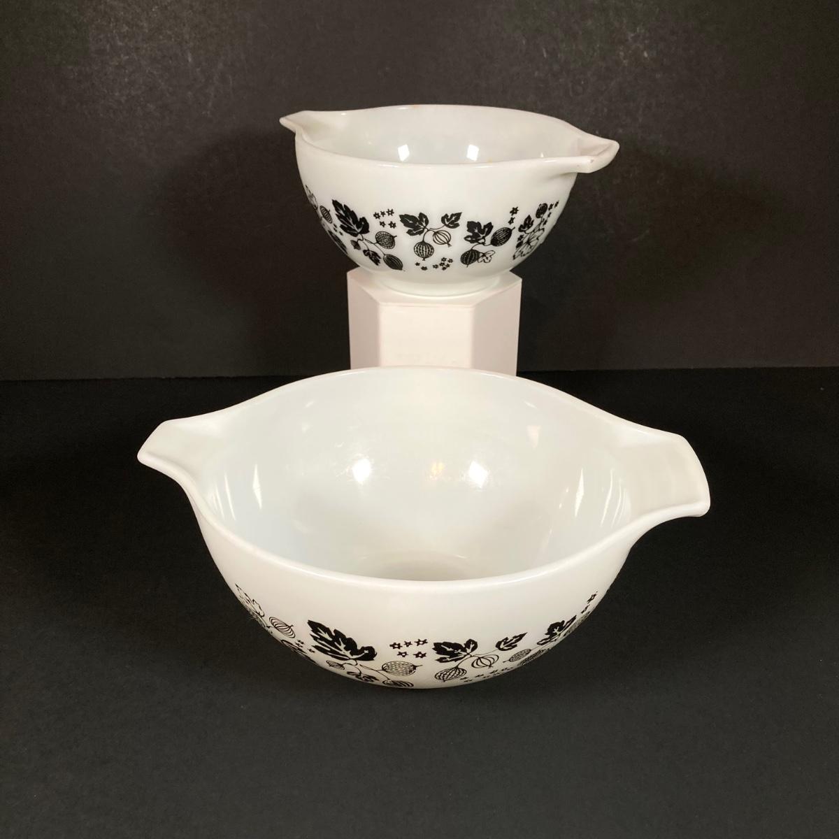 LOT 245: Vintage Pyrex Gooseberry Cinderella Mixing Bowl Four Piece Set (White / Black)