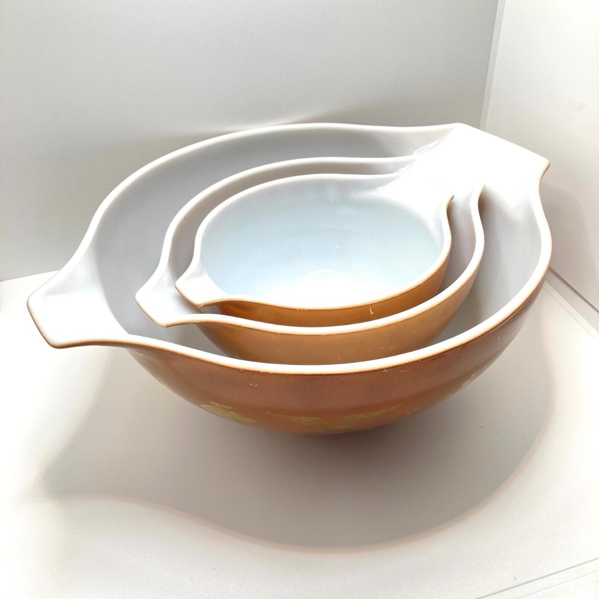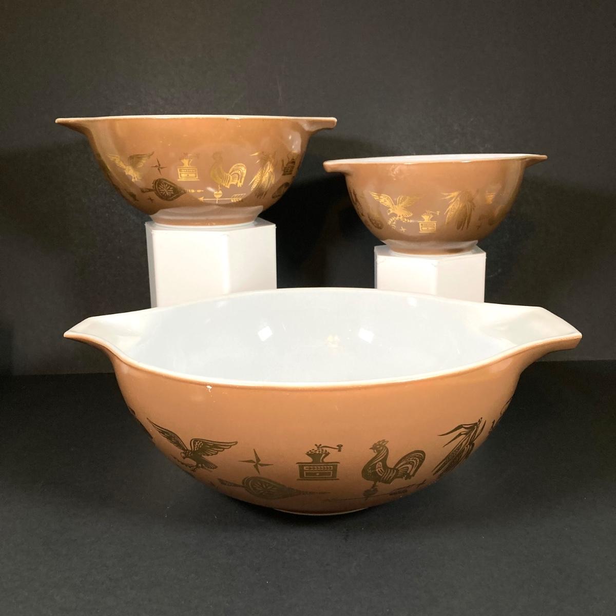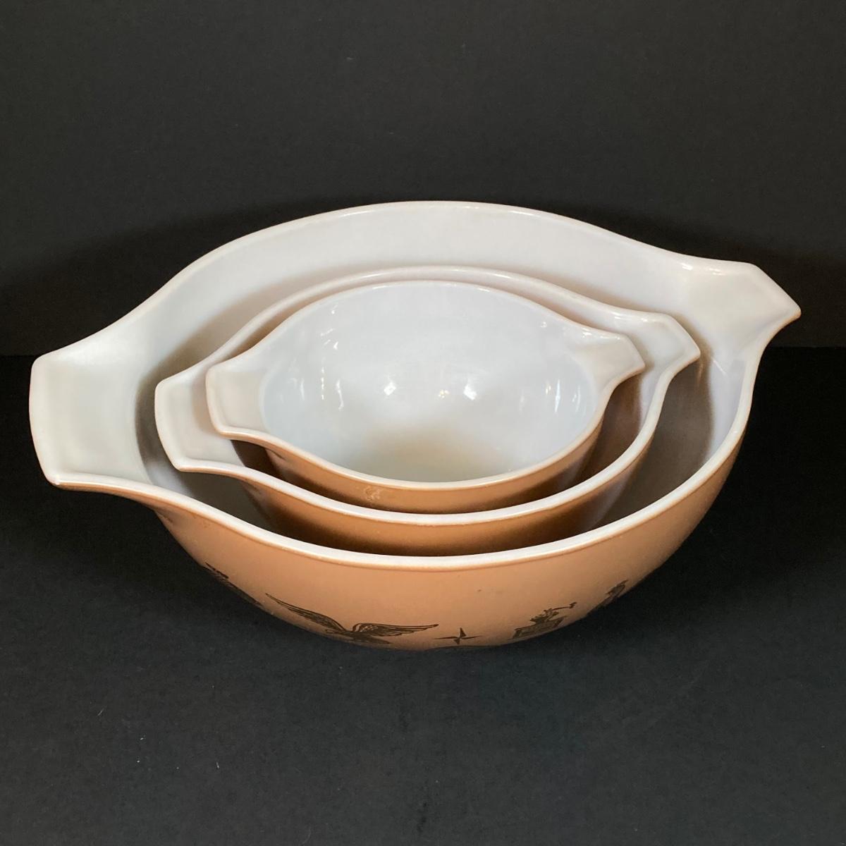 LOT 252: Three Piece Early American Pyrex Cinderella Mixing Bowl Set