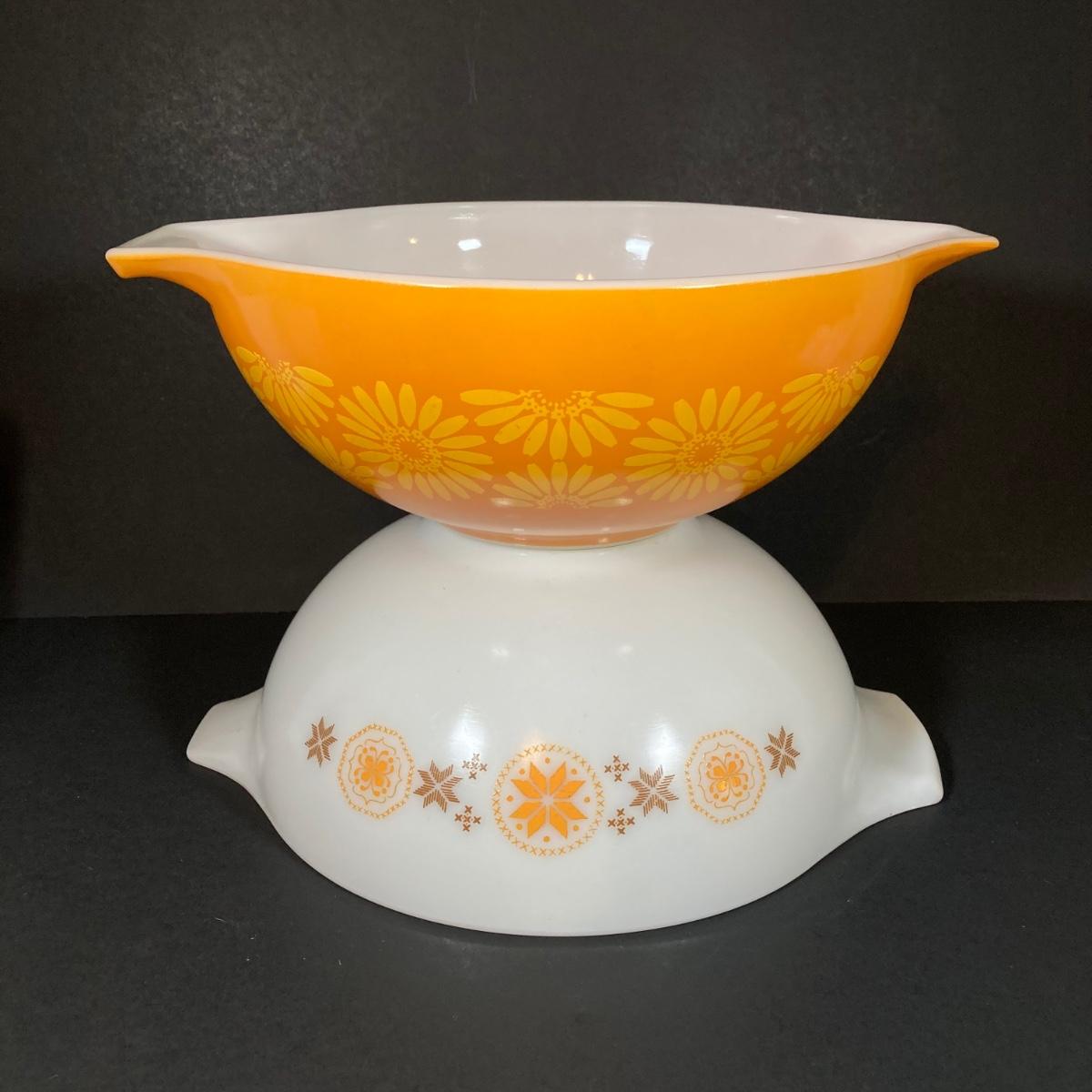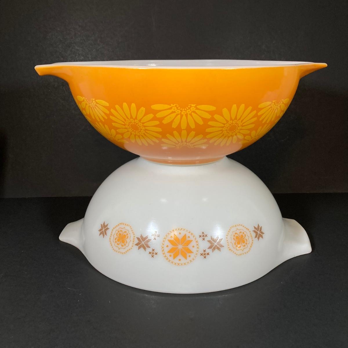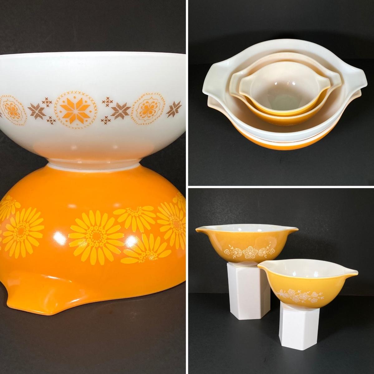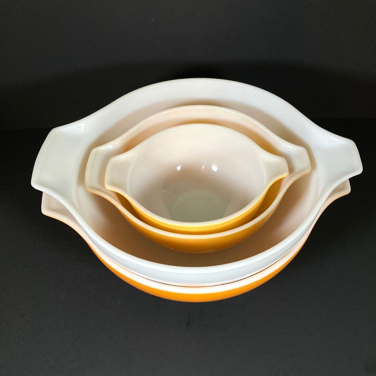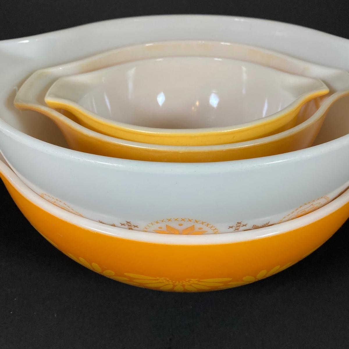 LOT 253: Four Pyrex Cinderella Mixing Bowls - Sunflower Daisy Citrus, Town and Country and Butterfly Gold