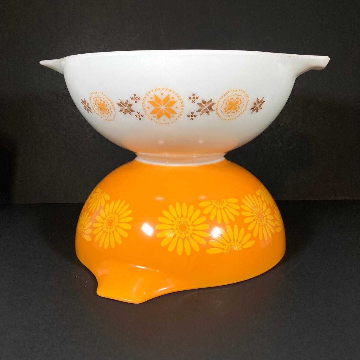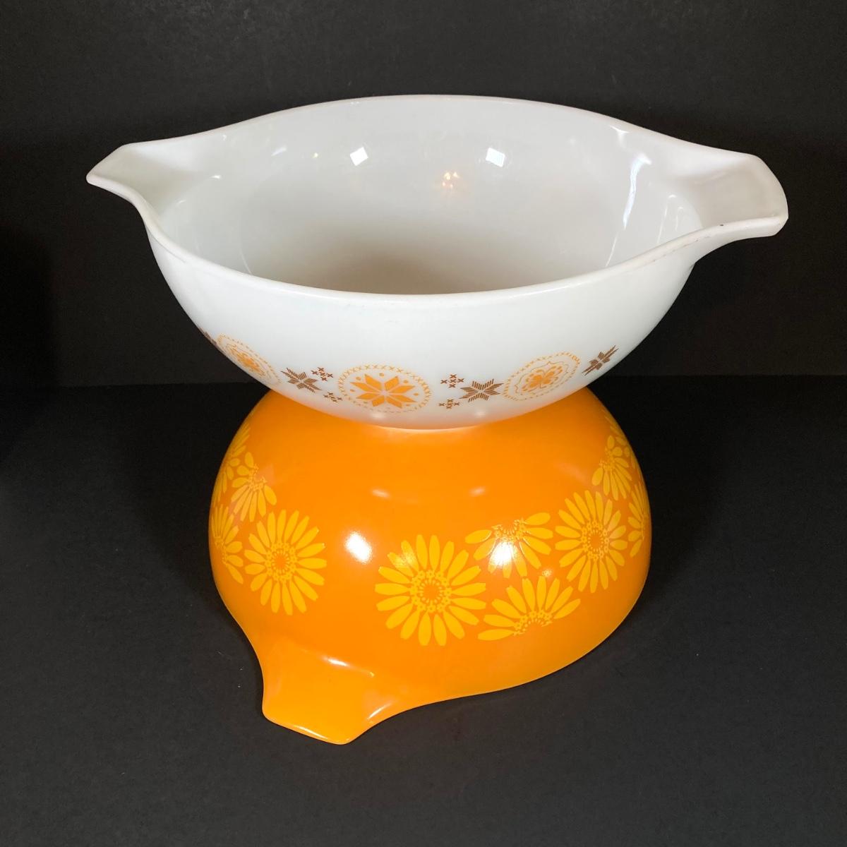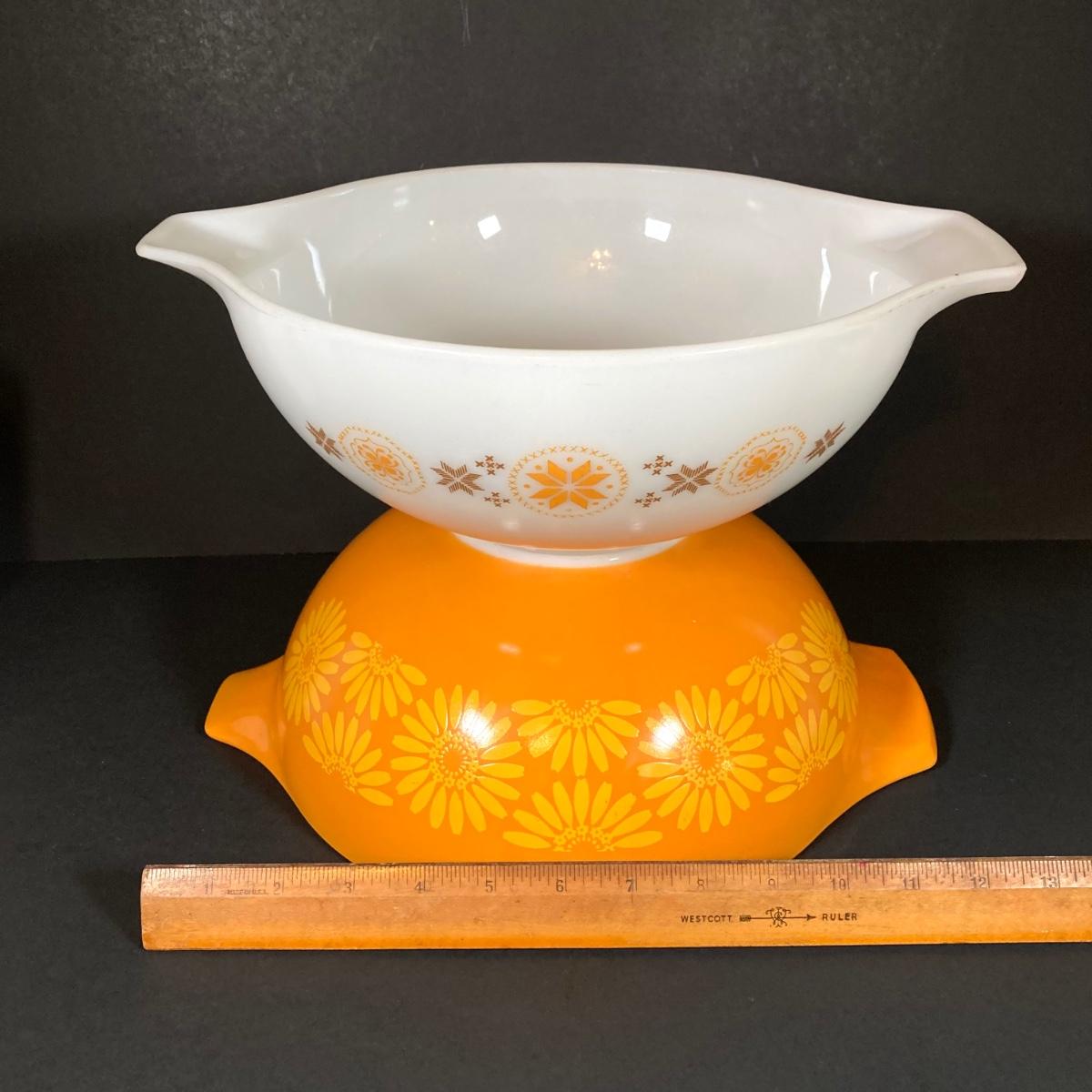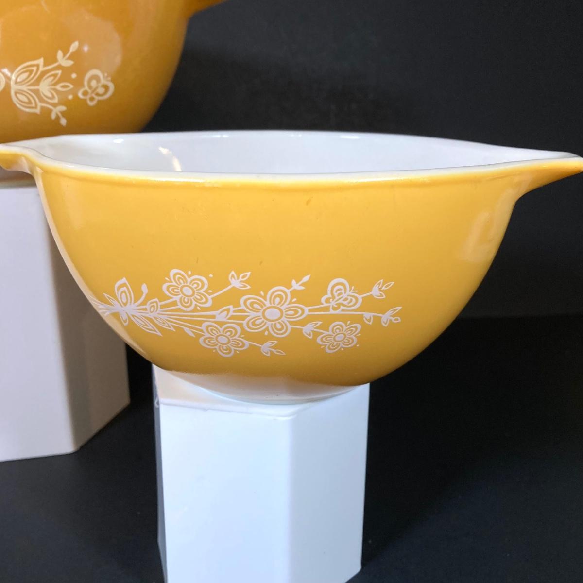 LOT 253: Four Pyrex Cinderella Mixing Bowls - Sunflower Daisy Citrus, Town and Country and Butterfly Gold