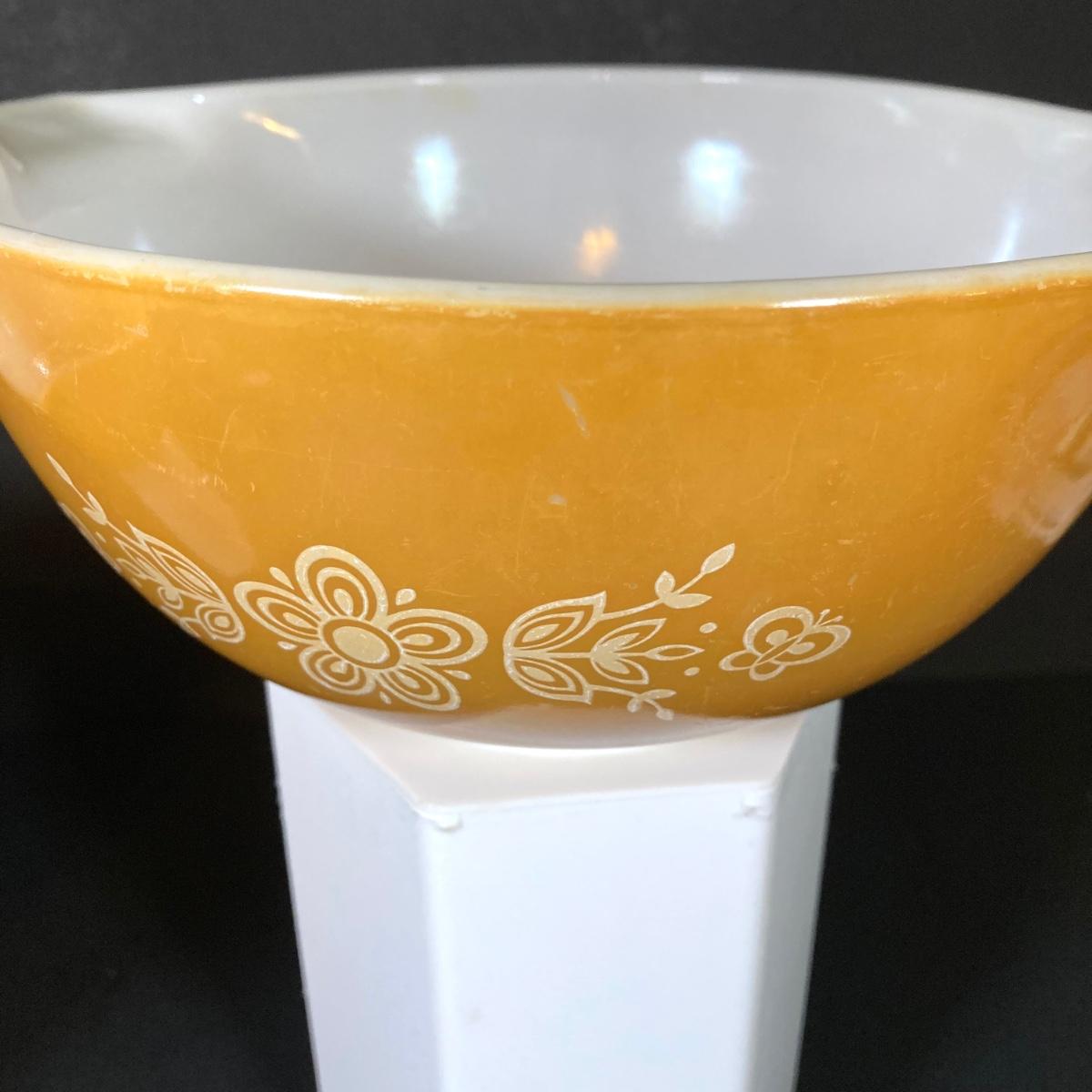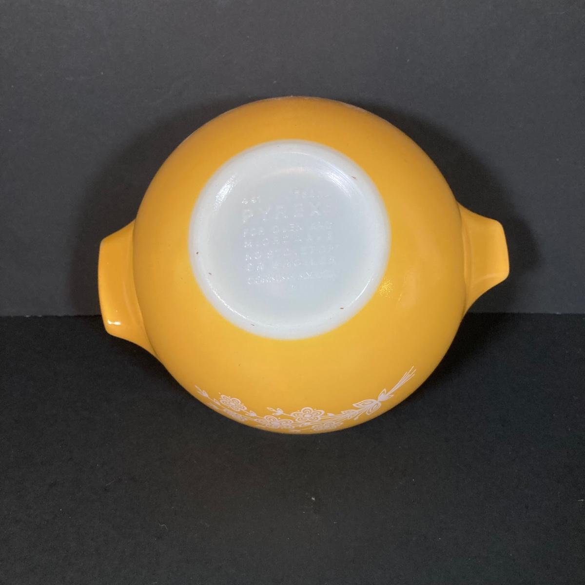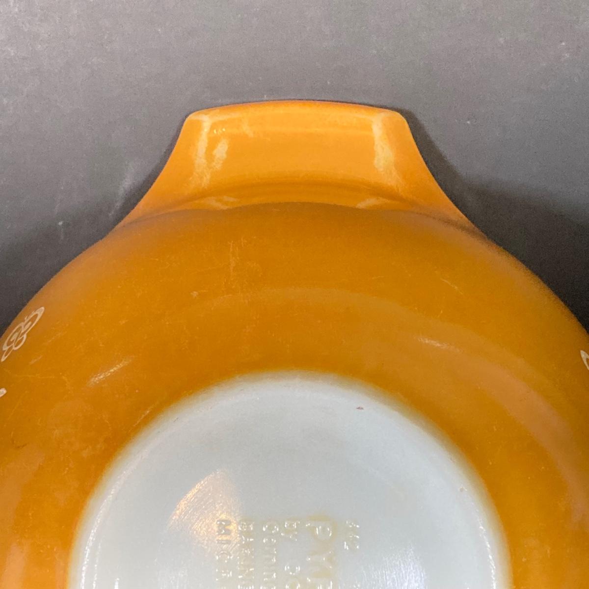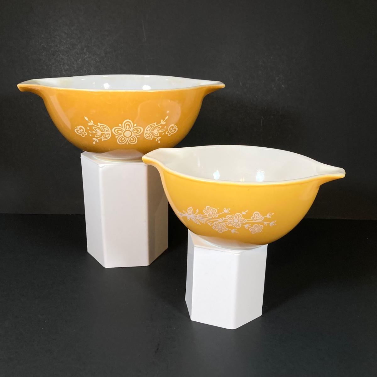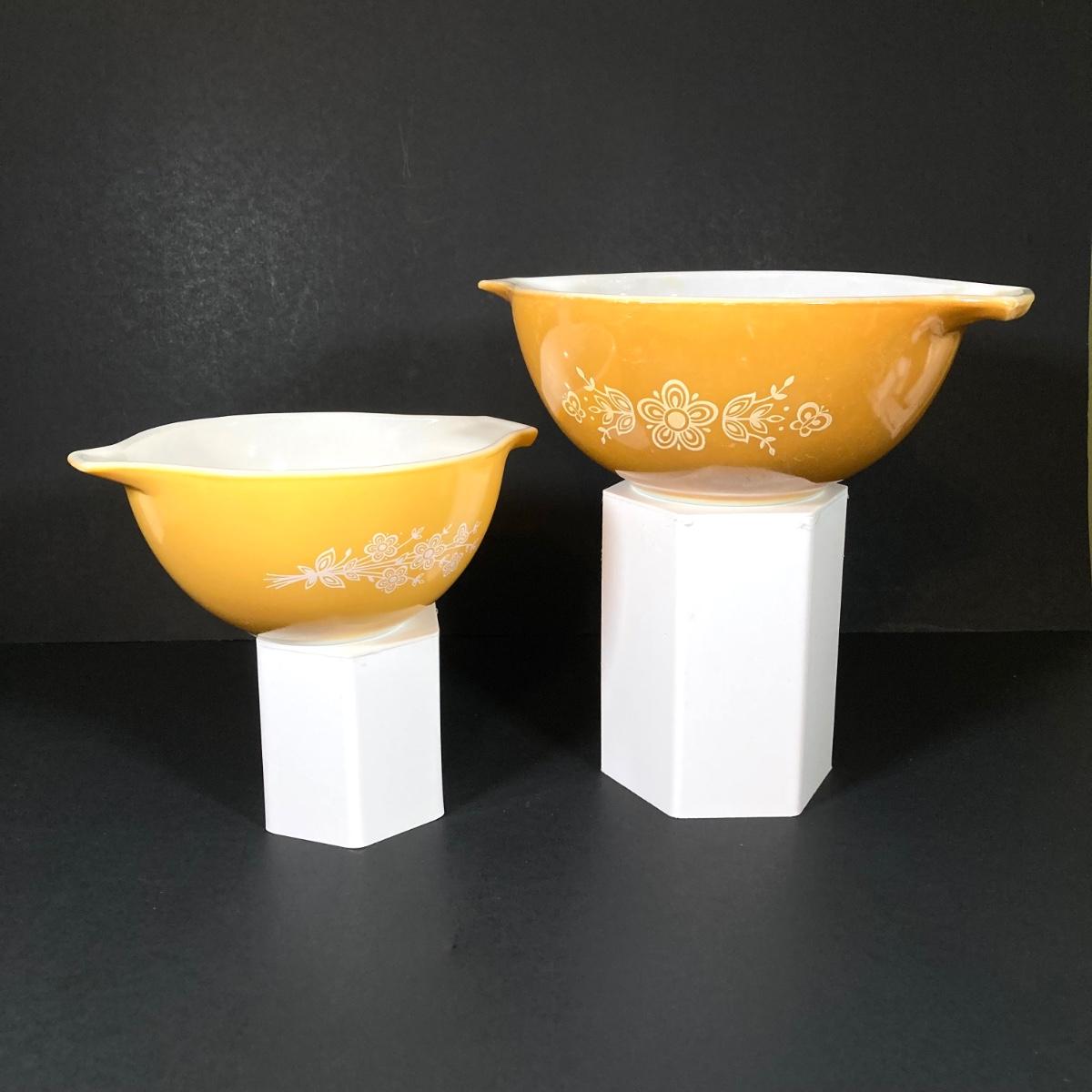 LOT 253: Four Pyrex Cinderella Mixing Bowls - Sunflower Daisy Citrus, Town and Country and Butterfly Gold