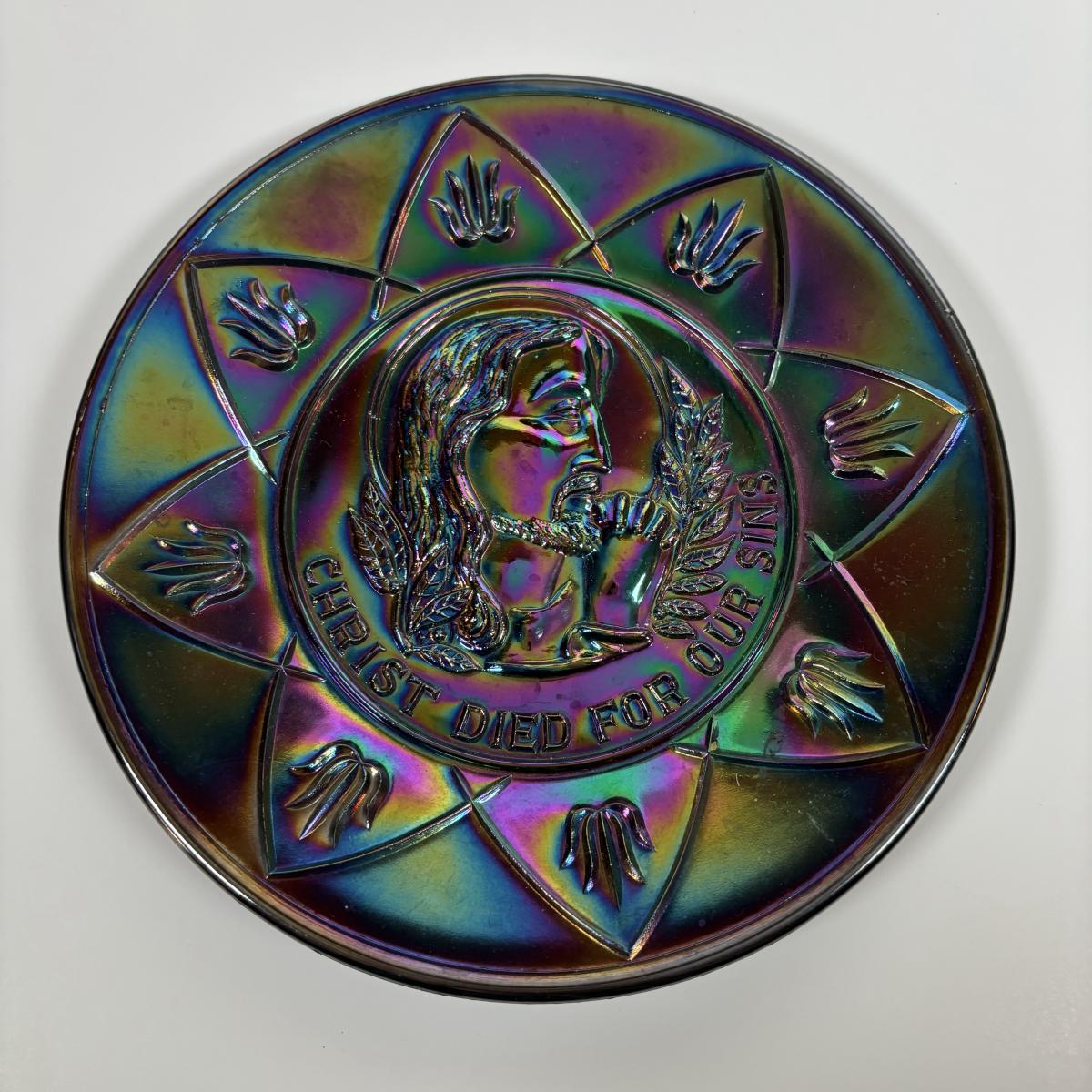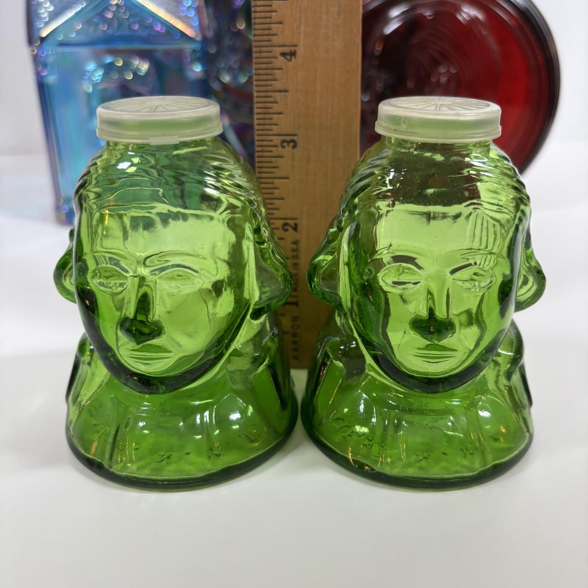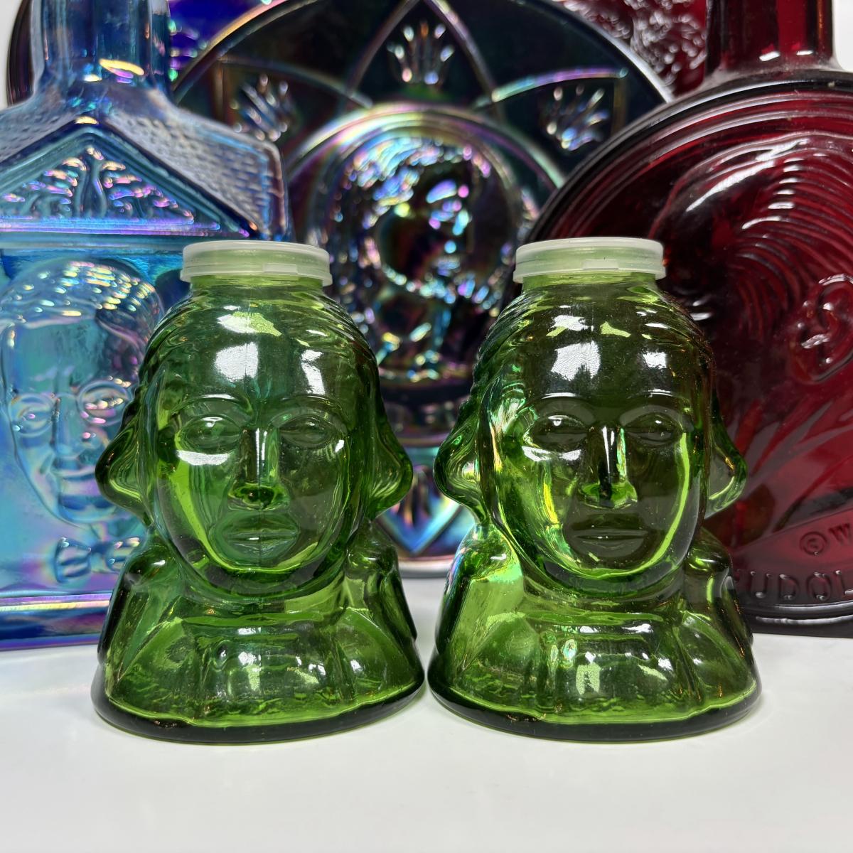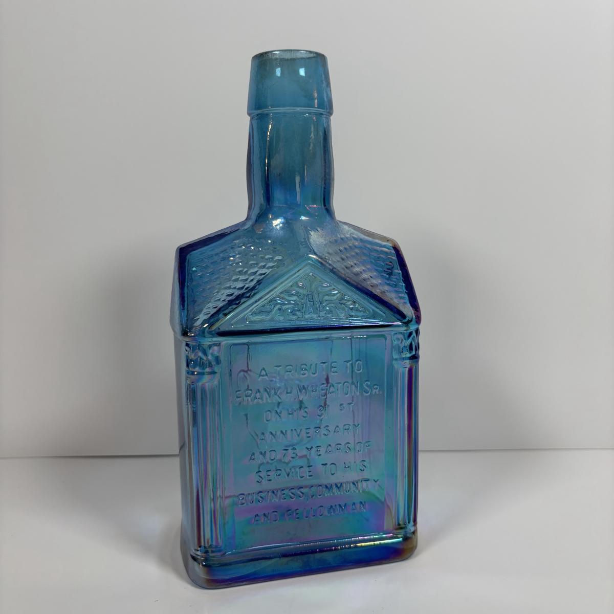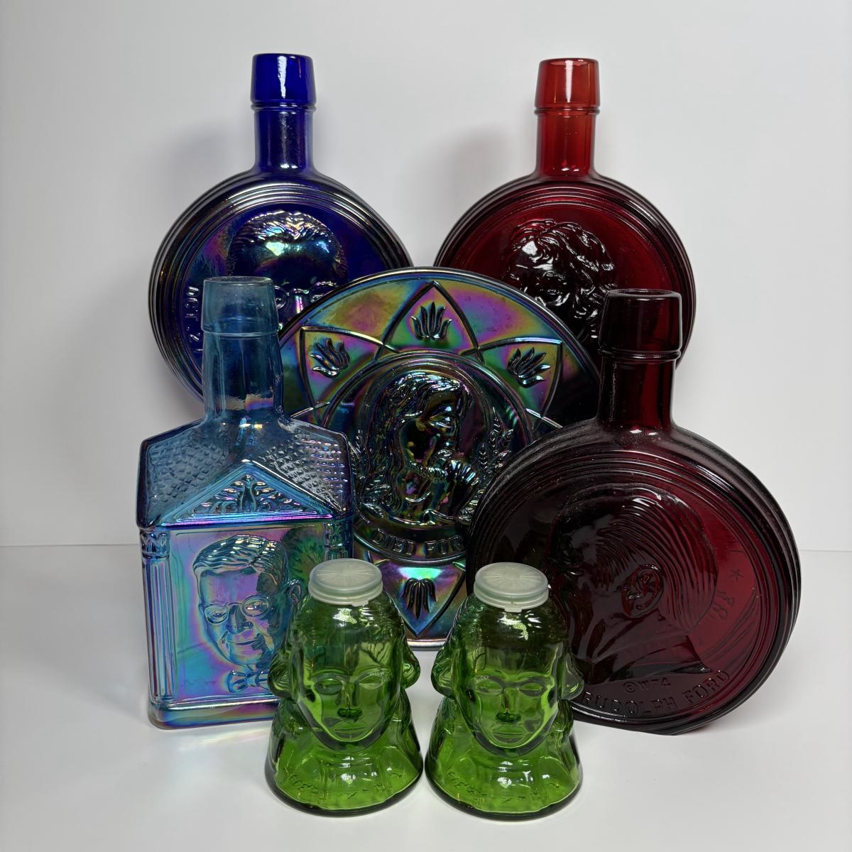 LOT 279: Vintage Wheaton Decanters/Bottles including a "Religious" Plate w/Iridescent Finish, George Washington Salt/Pepper Shakers