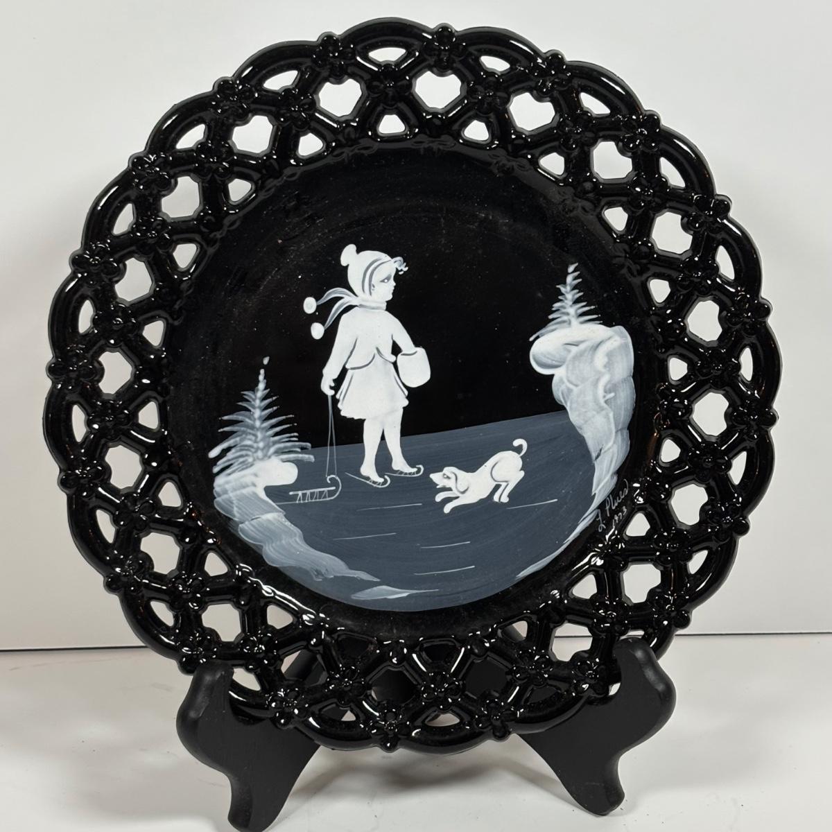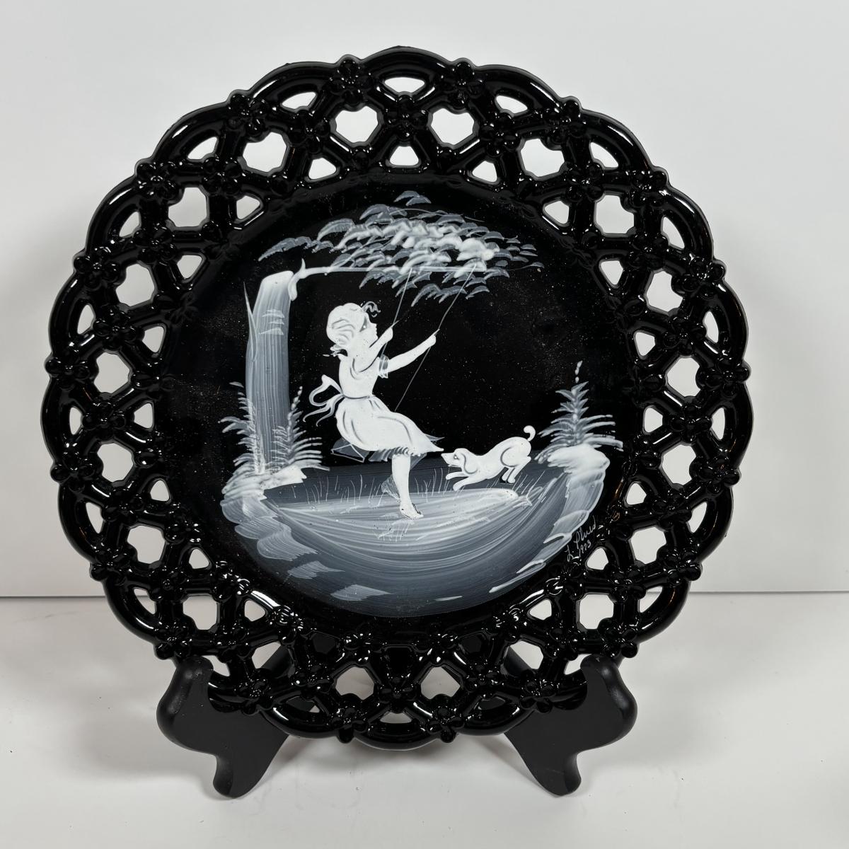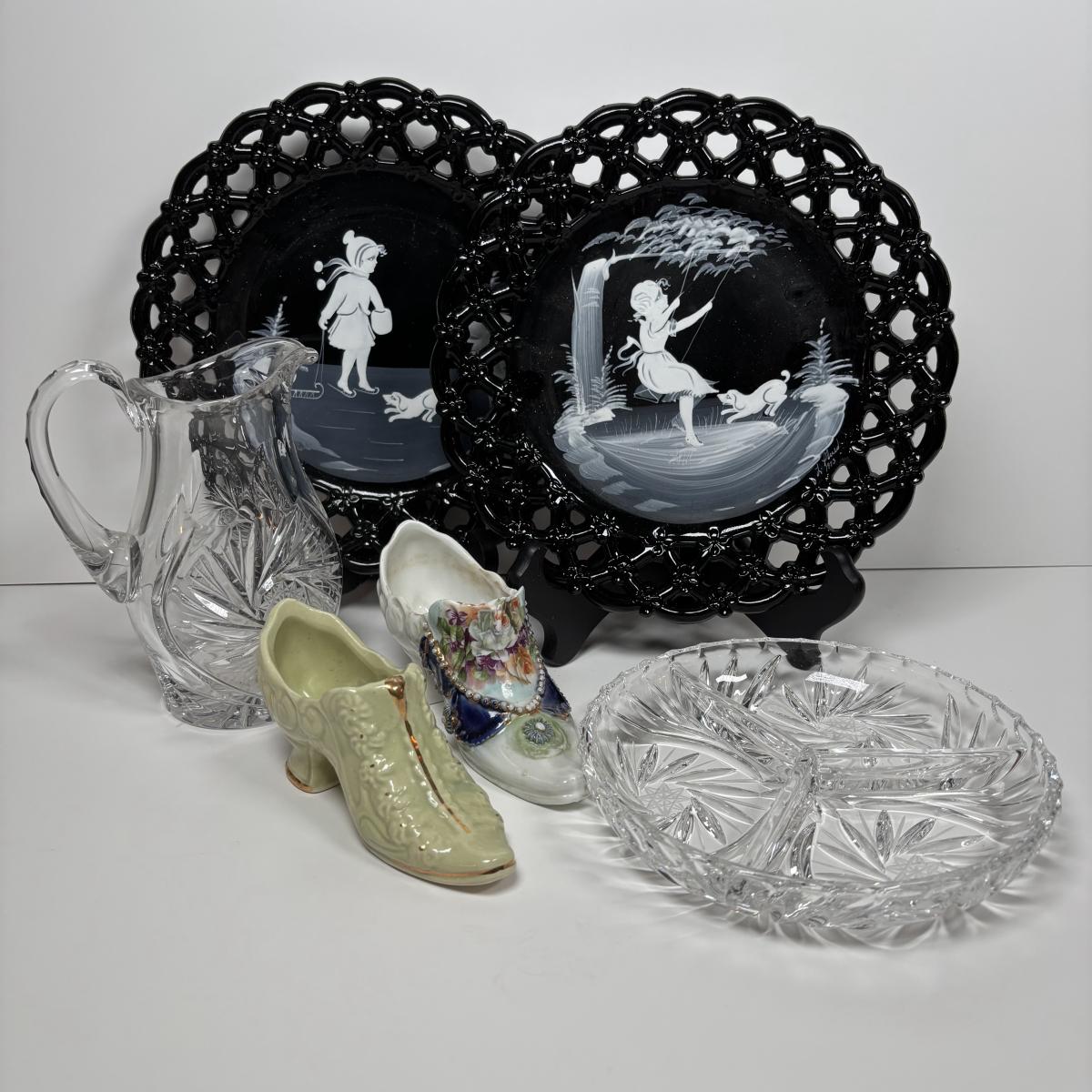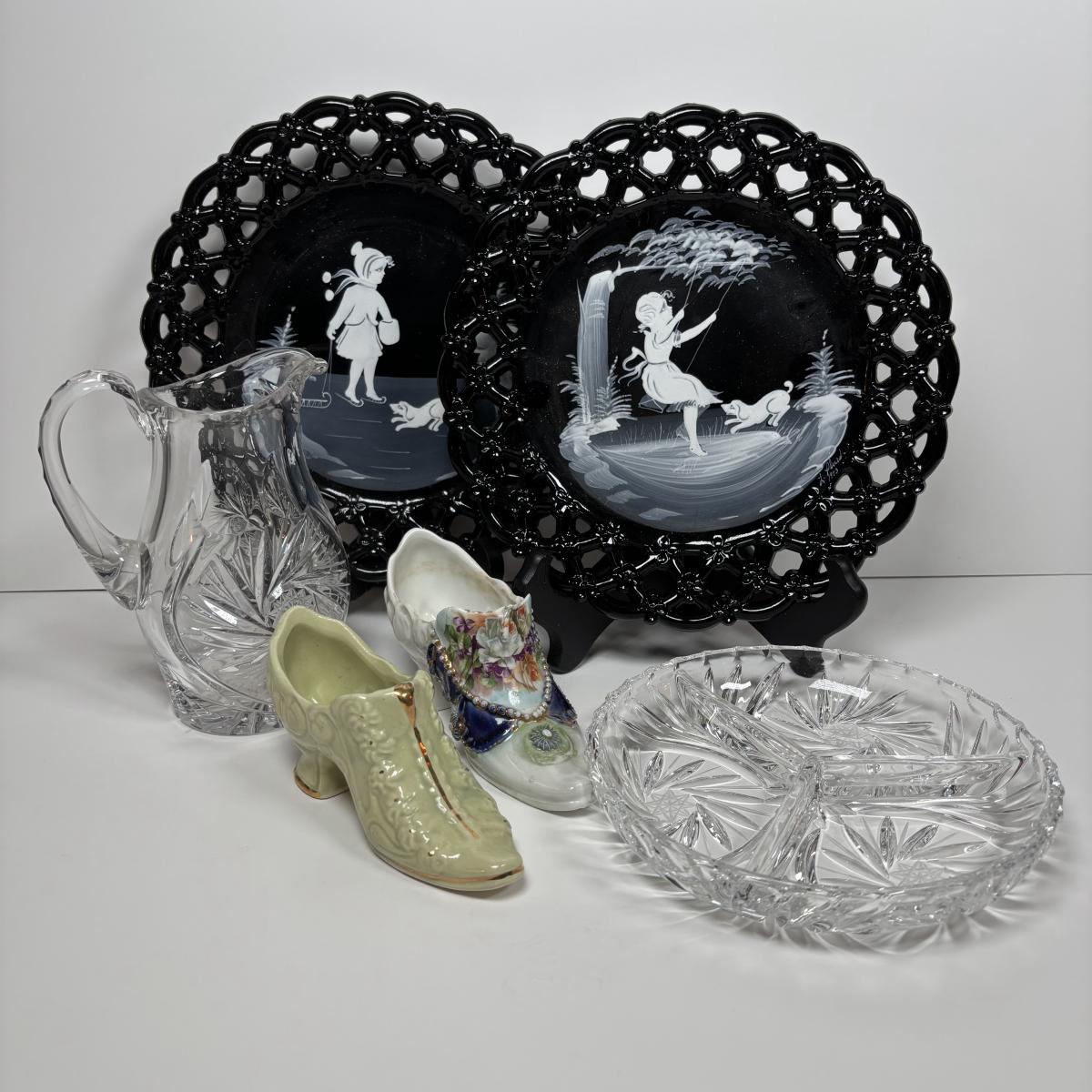 LOT 280: Westmoreland Hand Painted by Artist Mary Gregory L. Plues 1973 Black Glass Lattice Plates, Brillant Cut Crystal Pitcher & Divided Dish & More