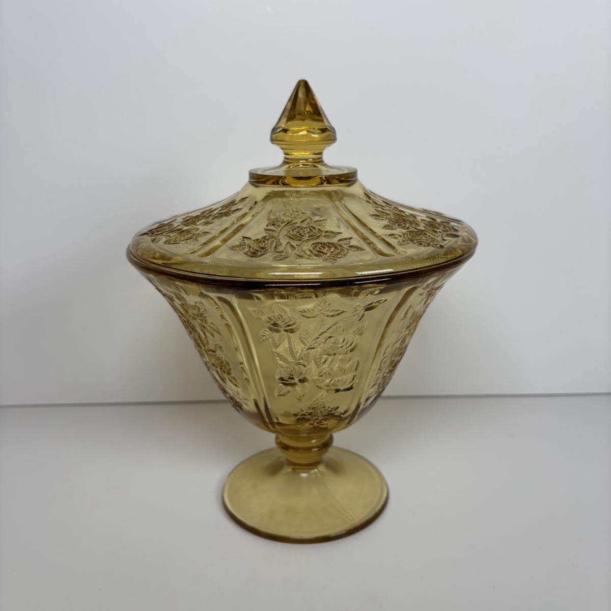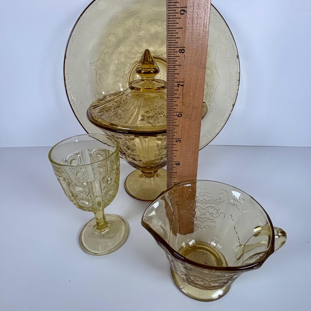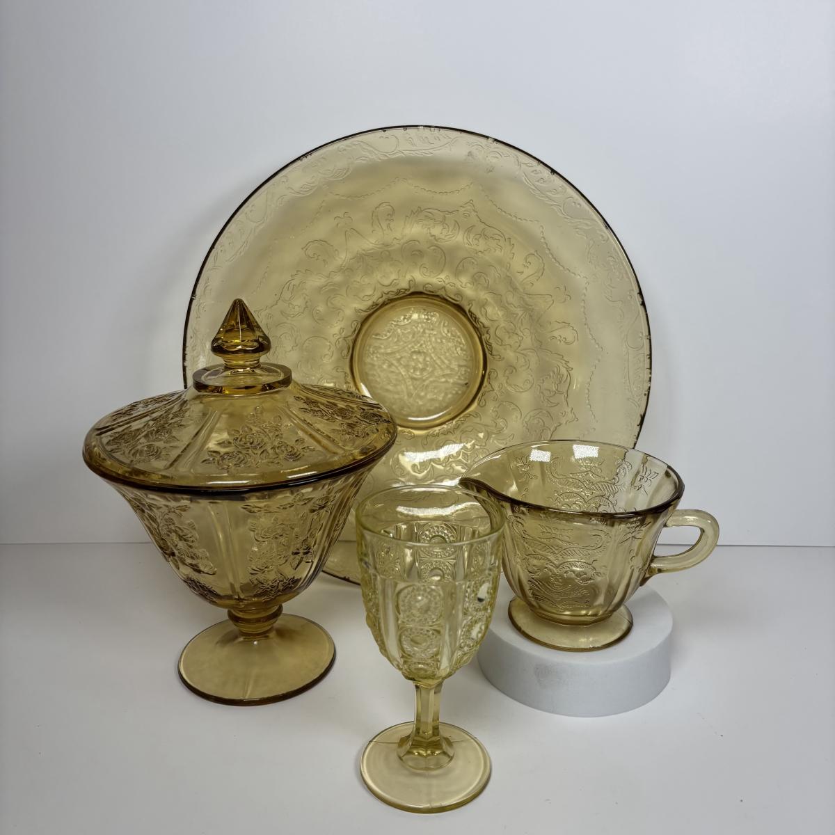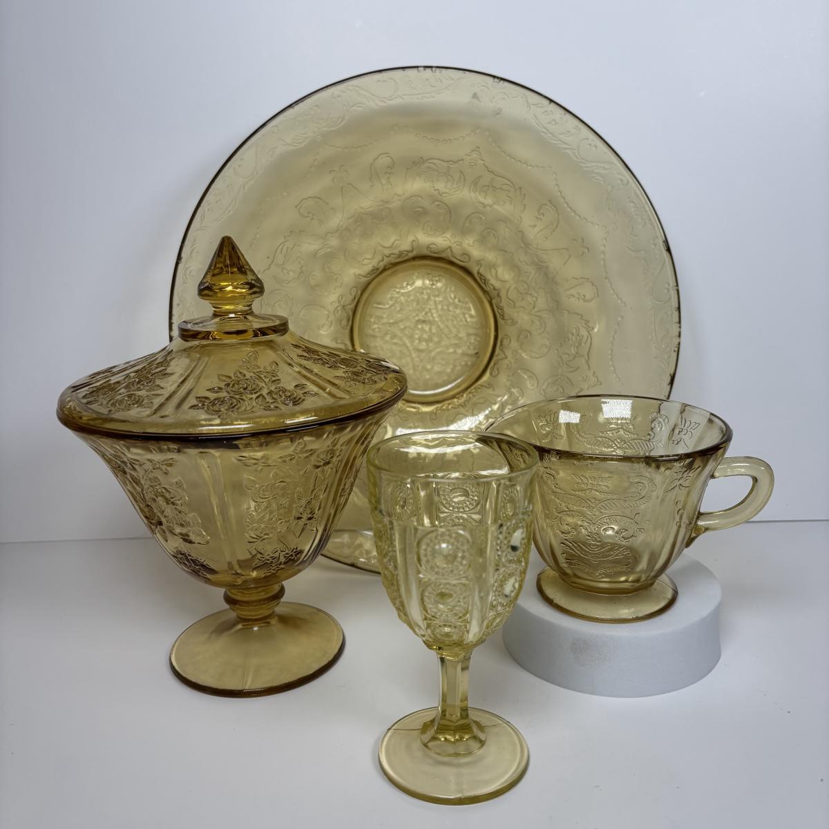 LOT 284: Amber Depression Glass Collection: Uranium Glass Wine Glass, Covered Candy Bowl, Sugar/Creamers, Console Bowl