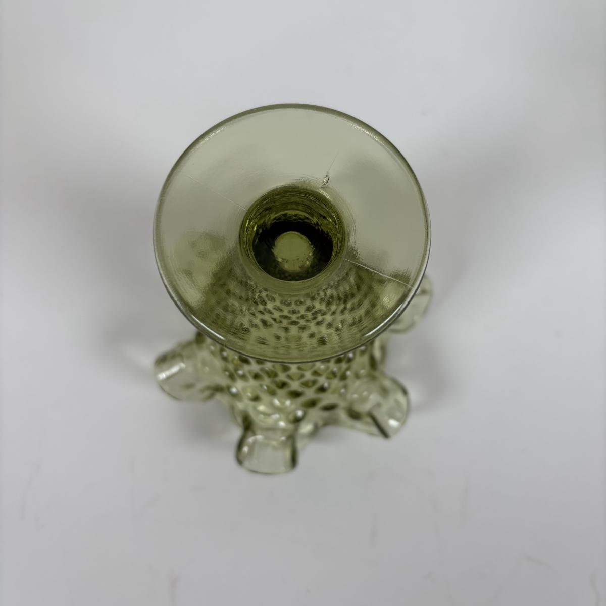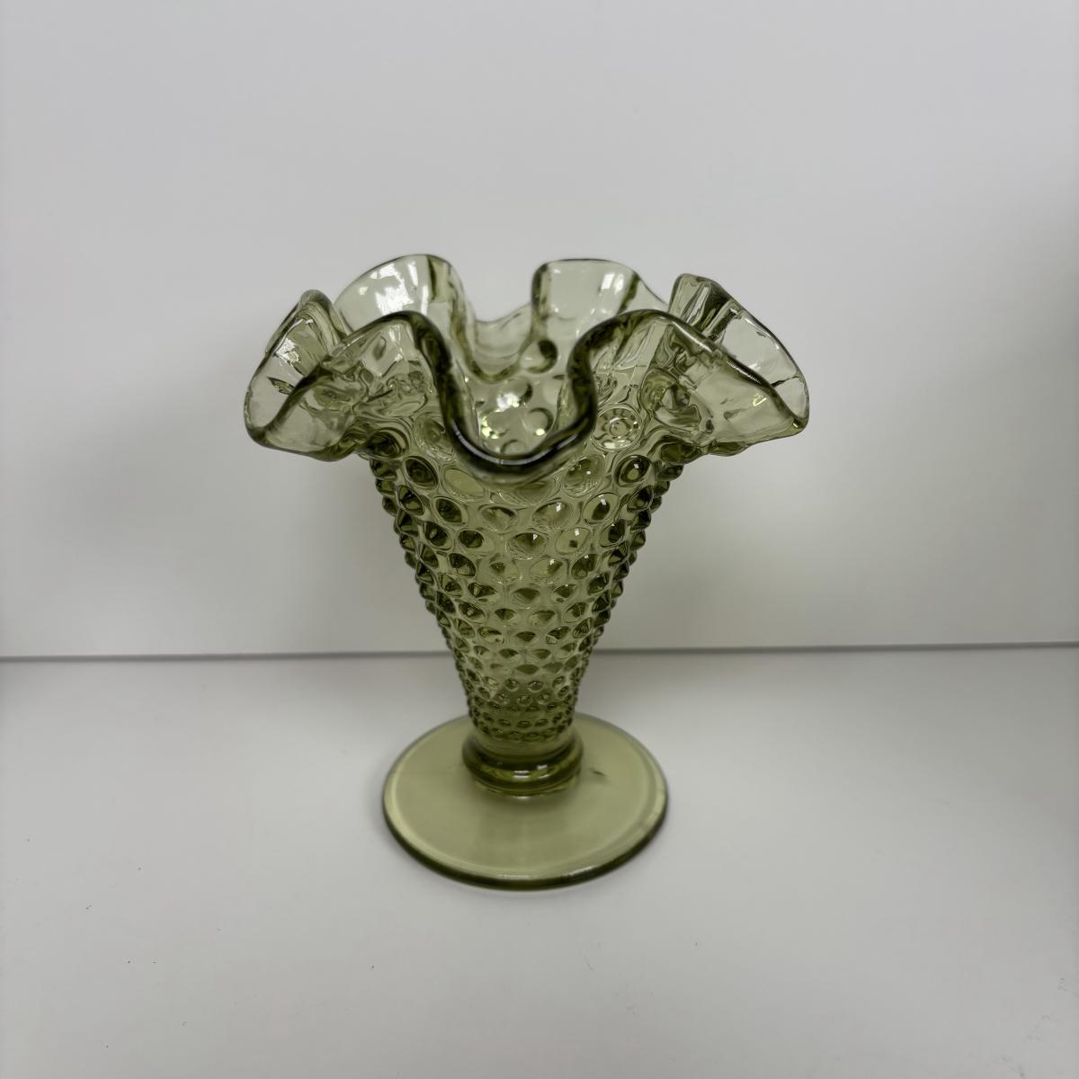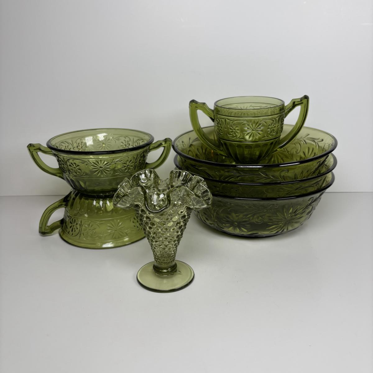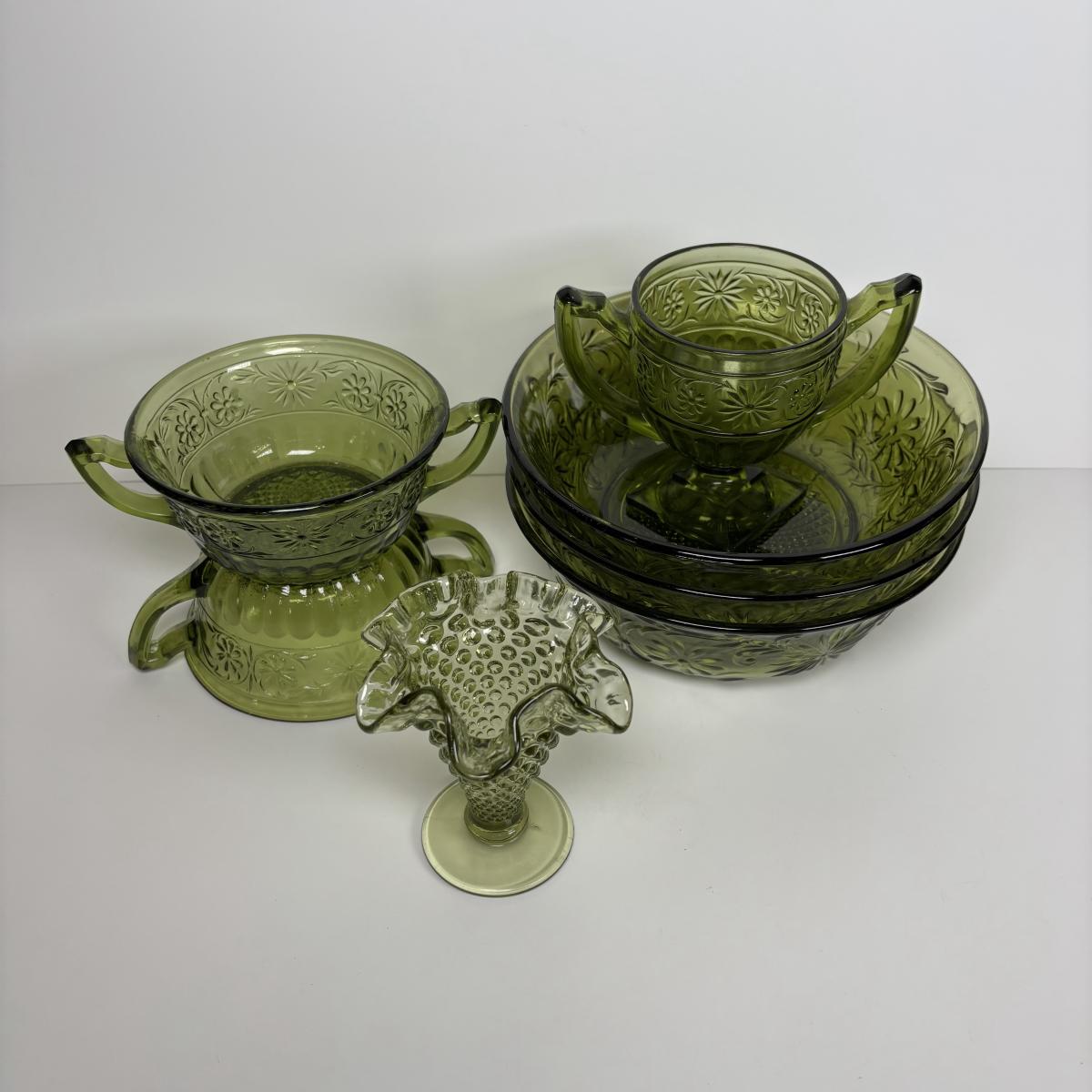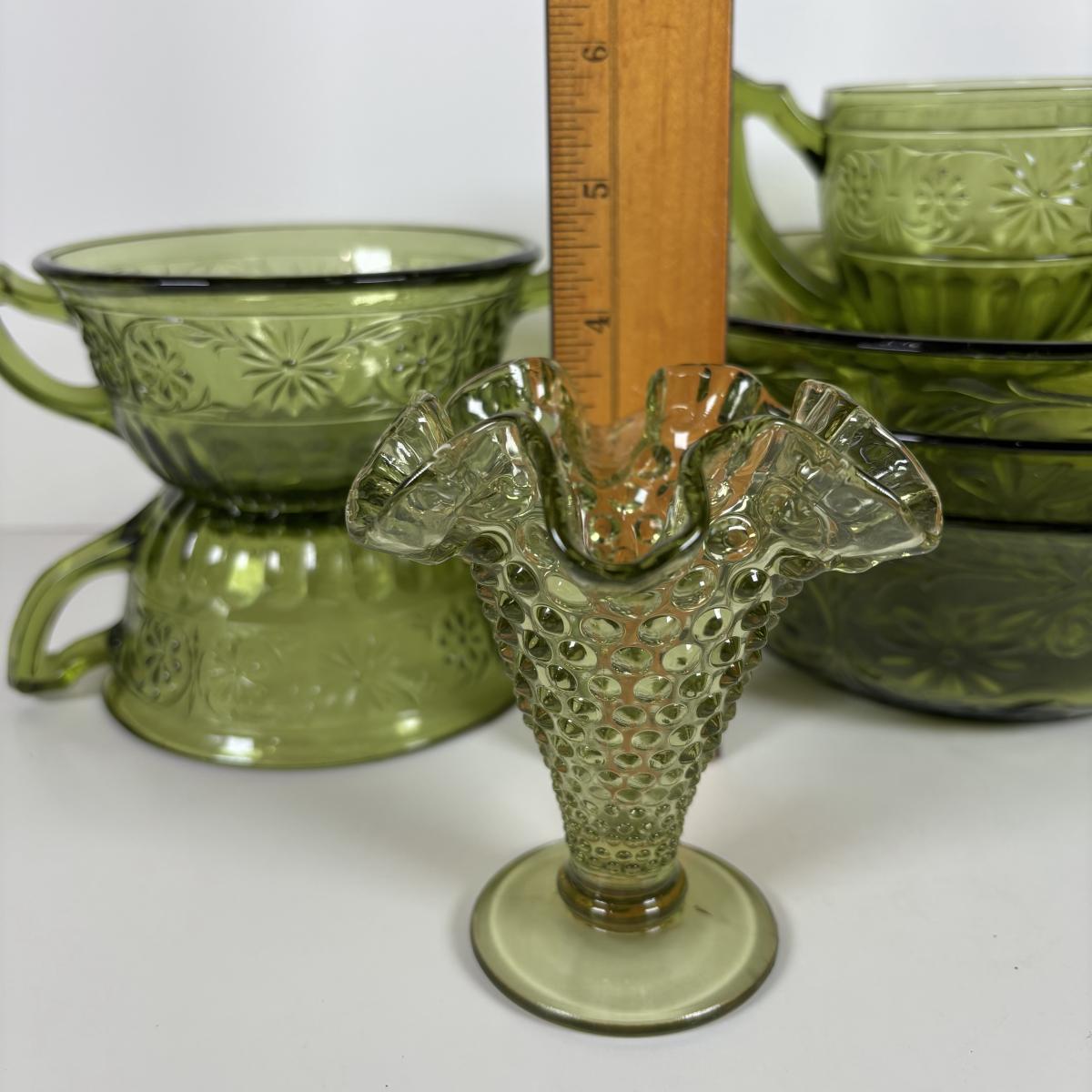 LOT 285: Vintage Colonial Green Hobnail Trumpet Vase and Avocado Green Glassware