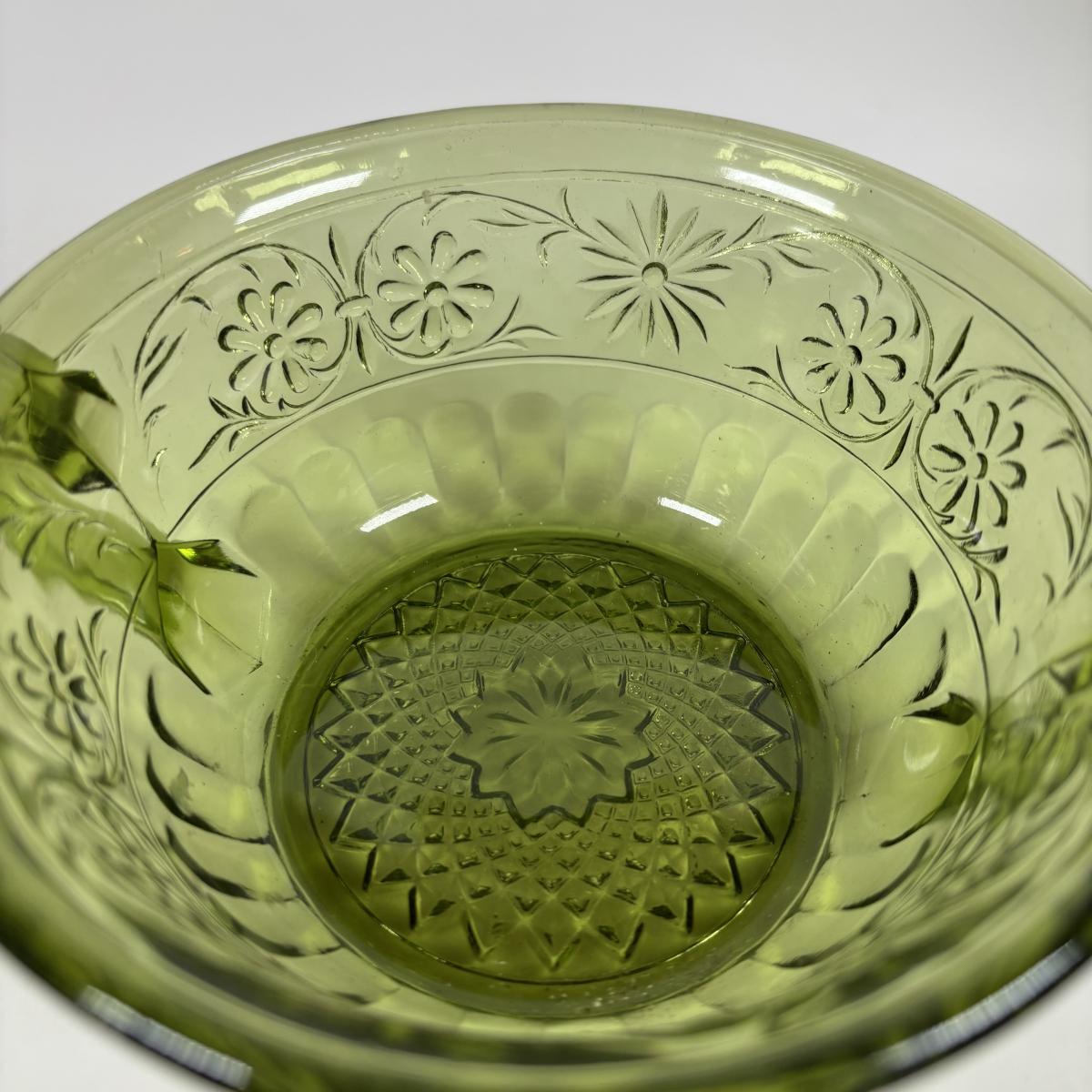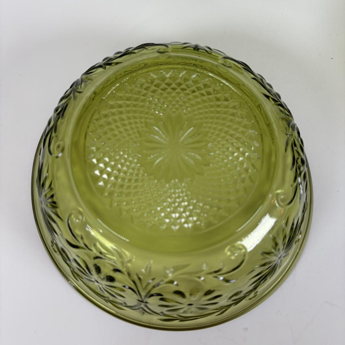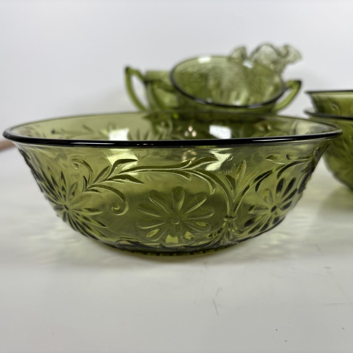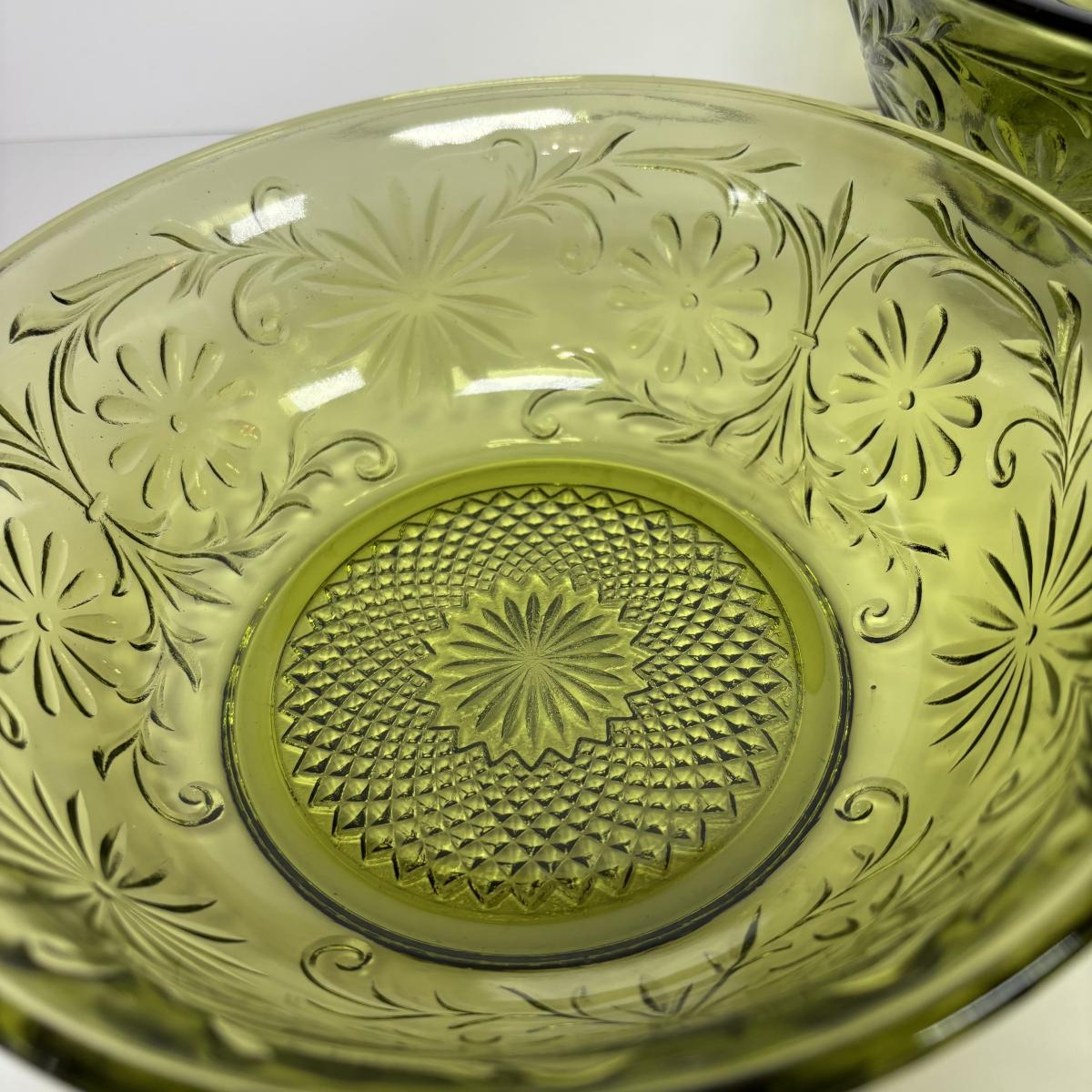 LOT 285: Vintage Colonial Green Hobnail Trumpet Vase and Avocado Green Glassware