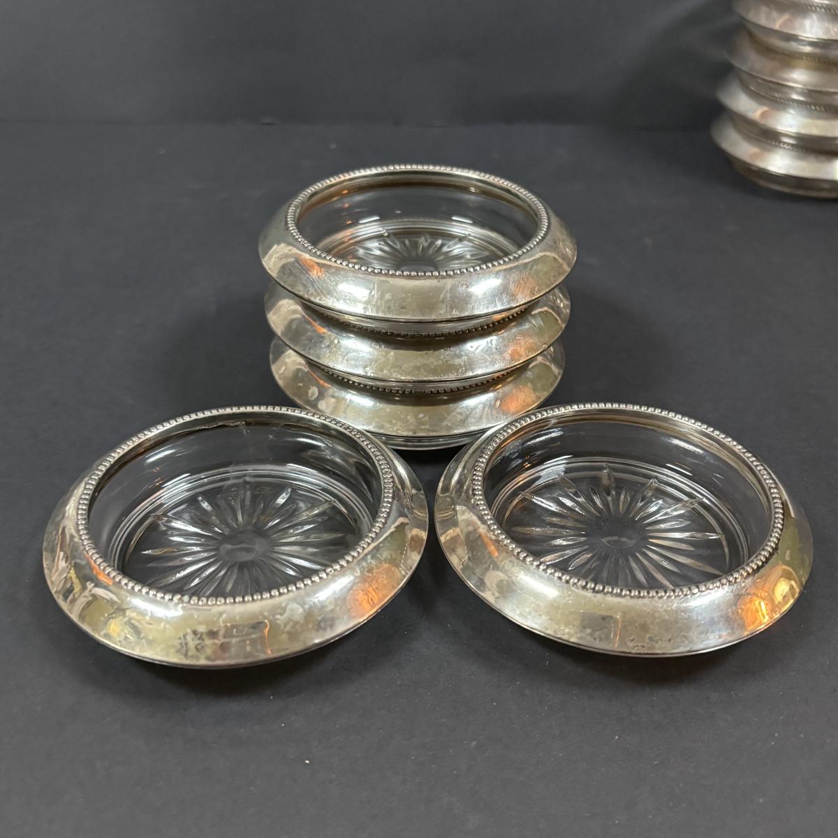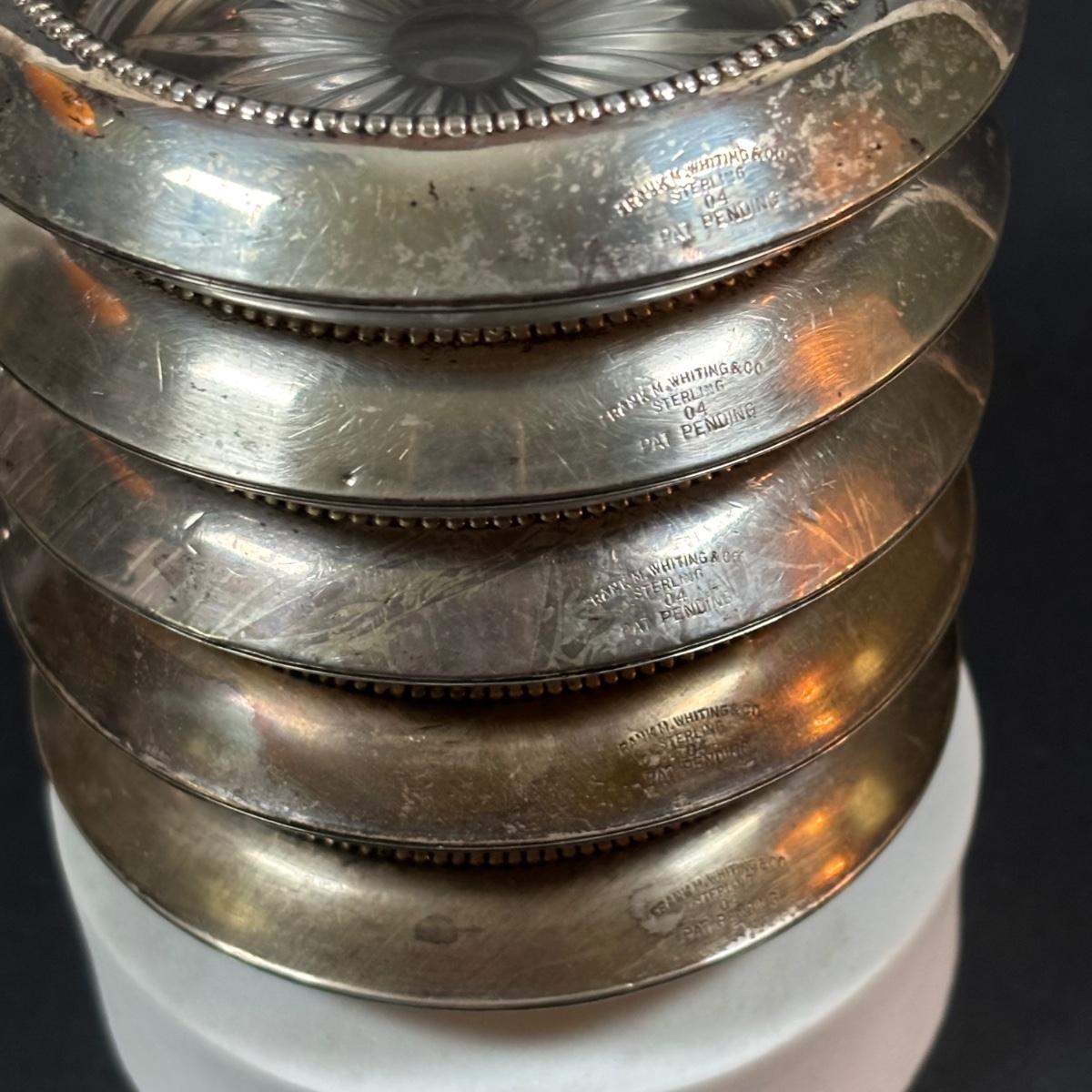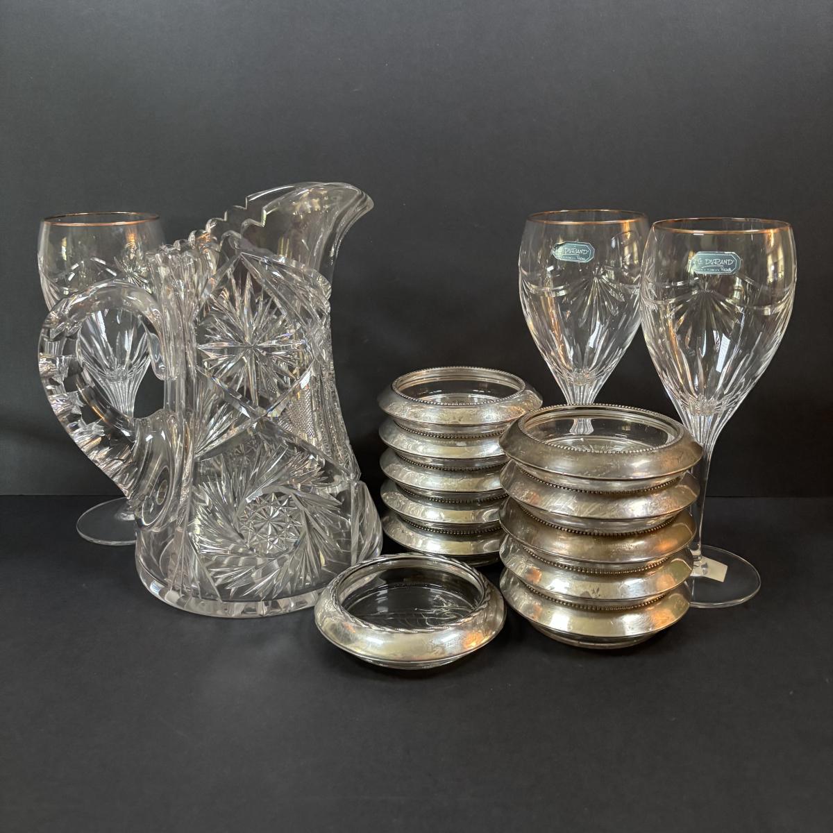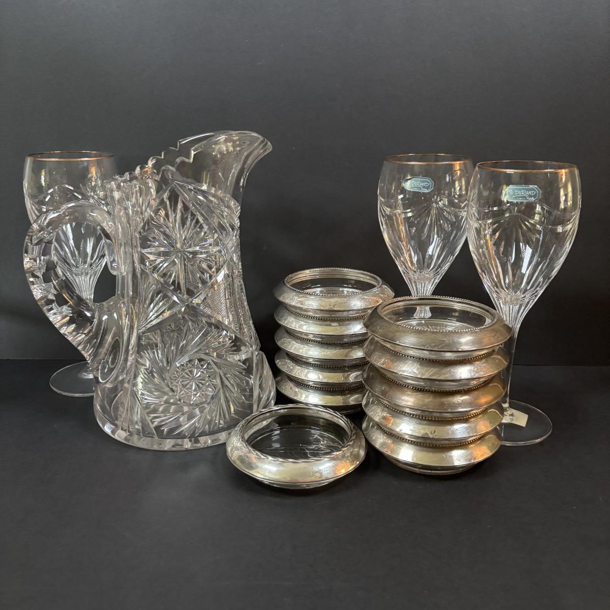 LOT 289: Sterling Silver & Crystal Coasters (11) JG Durand Glasses (3), Beautiful Cut Glass Pitcher