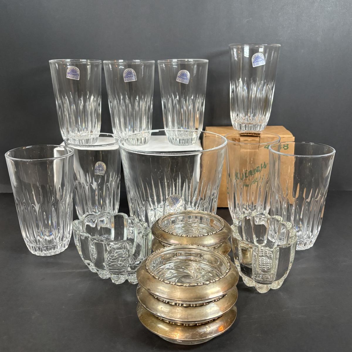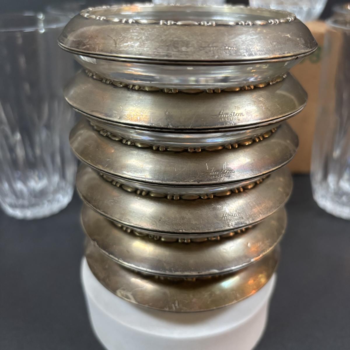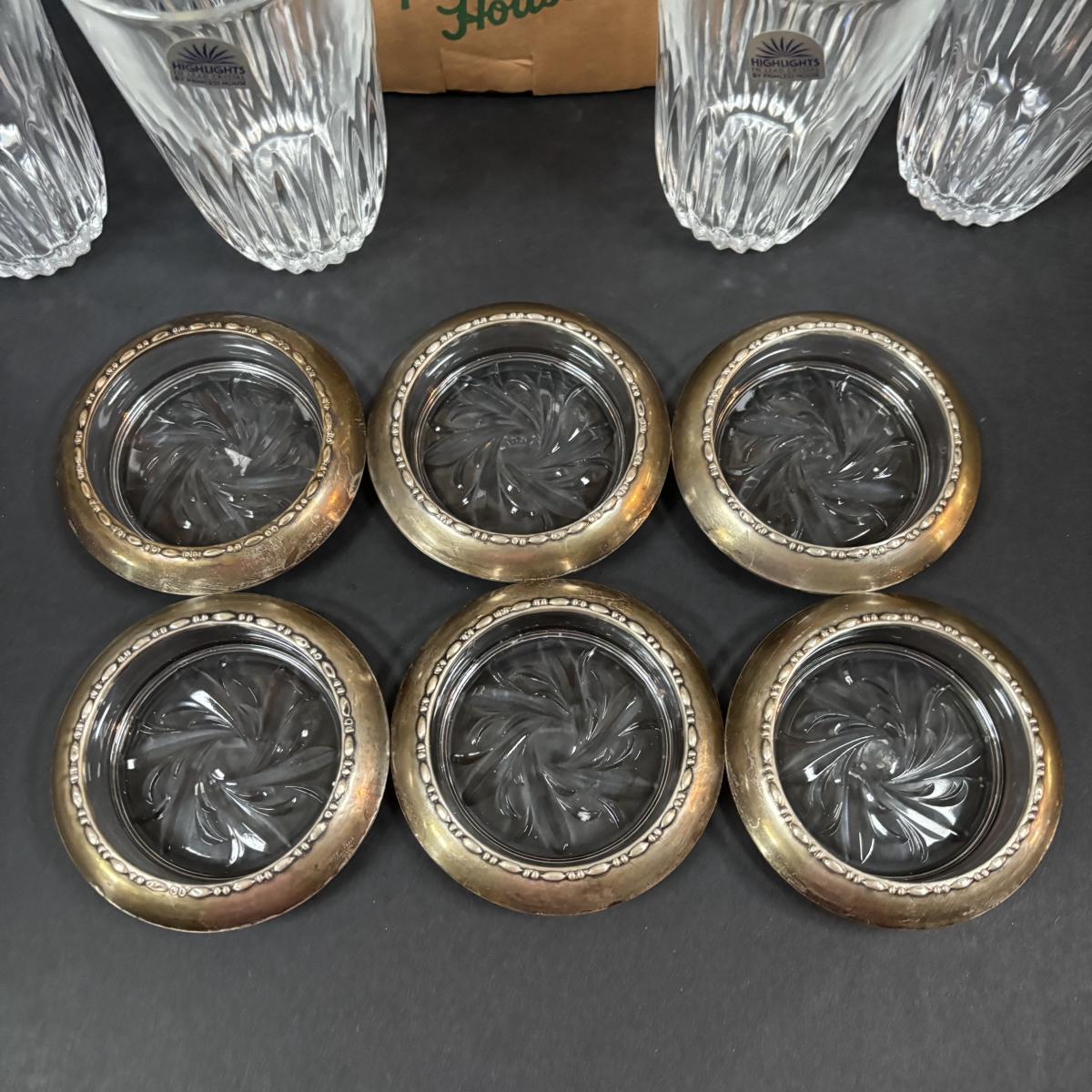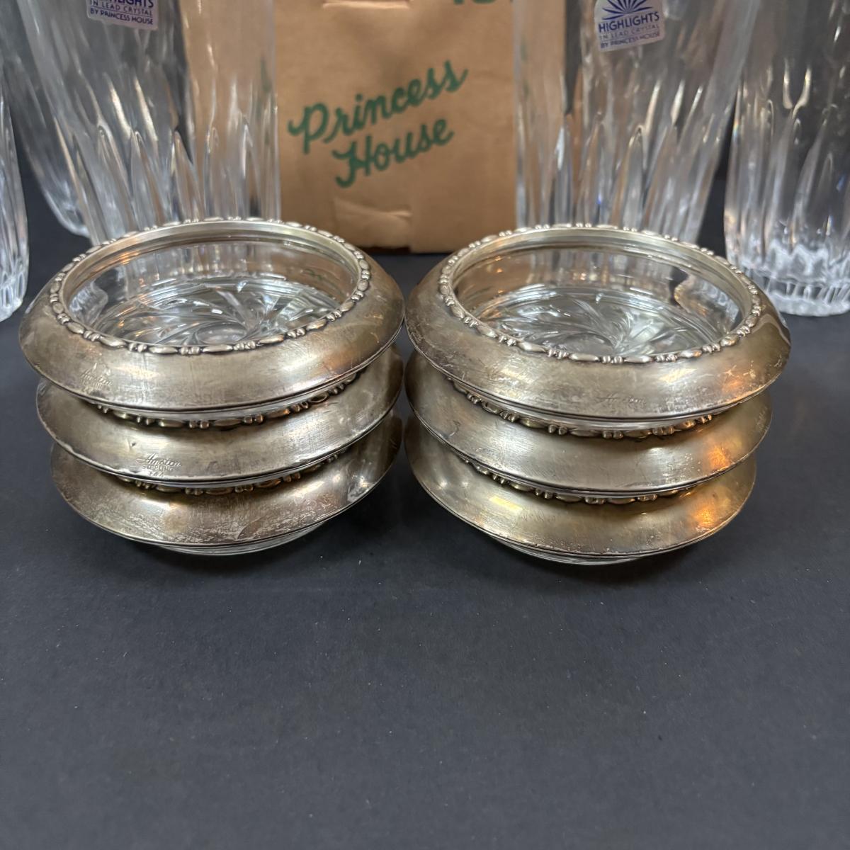 LOT 290: MCM Amston Sterling Silver & Crystal Coasters (6) along with Princess House Ice Bucket, Glasses, Flatware Holders
