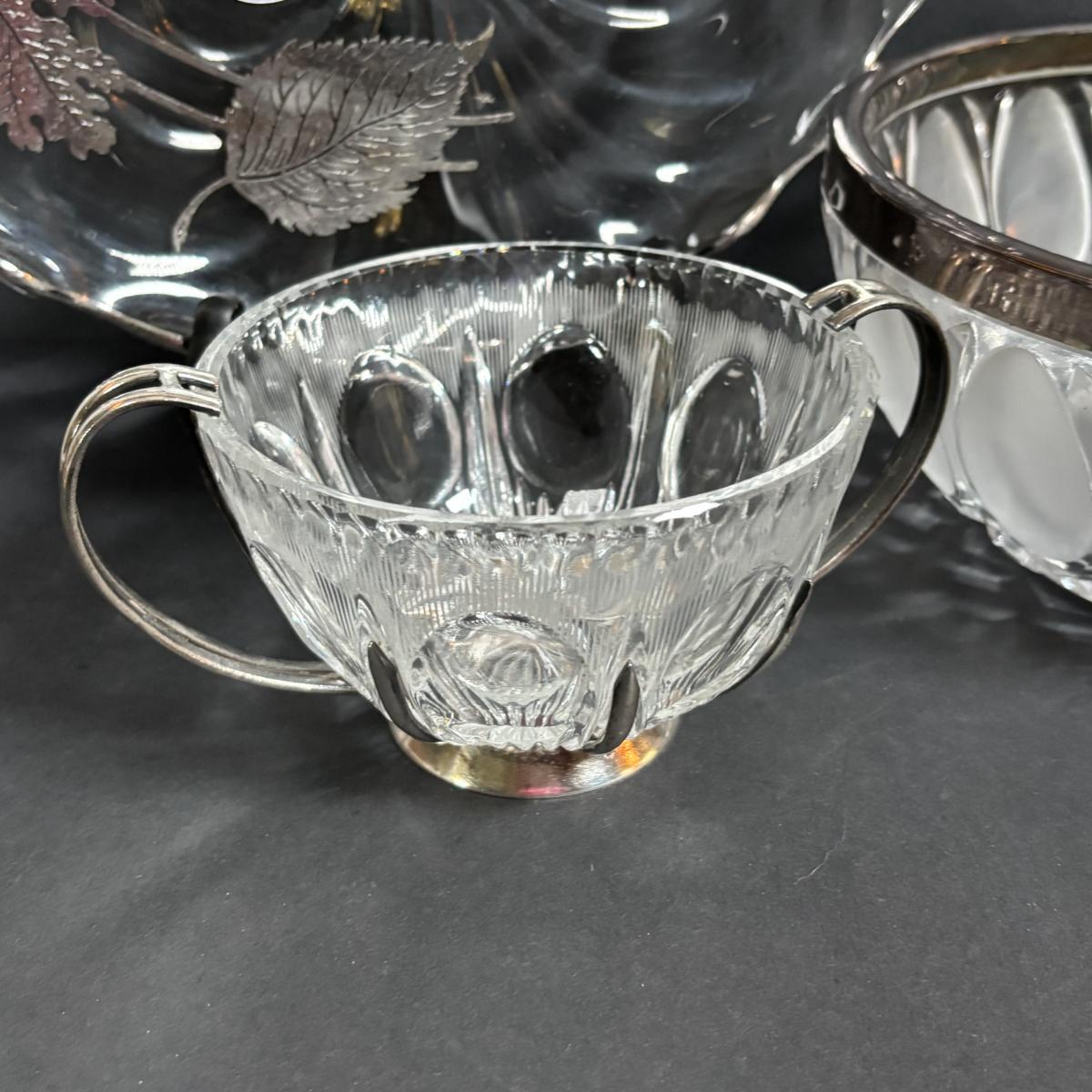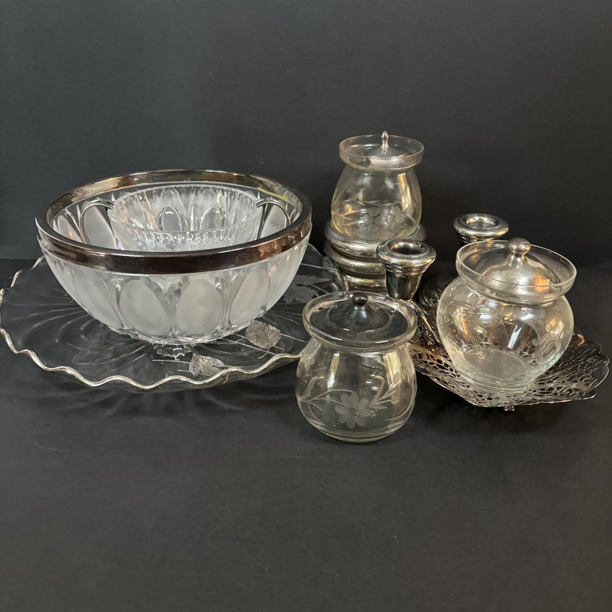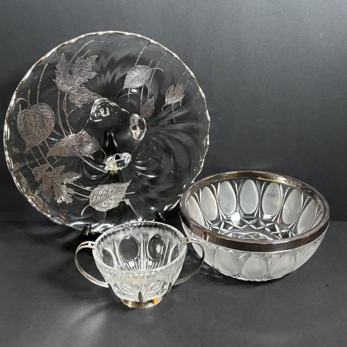 LOT 294: Vintage Sugar Bowls w/Sterling Silver Lids (3), Footed Cake Plate w/Silver Overlay Autumn Leaves, FB Rodgers Candle Holders & More