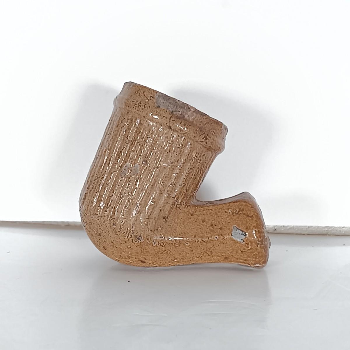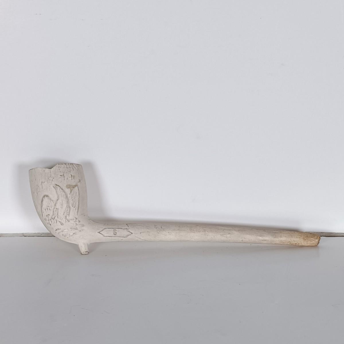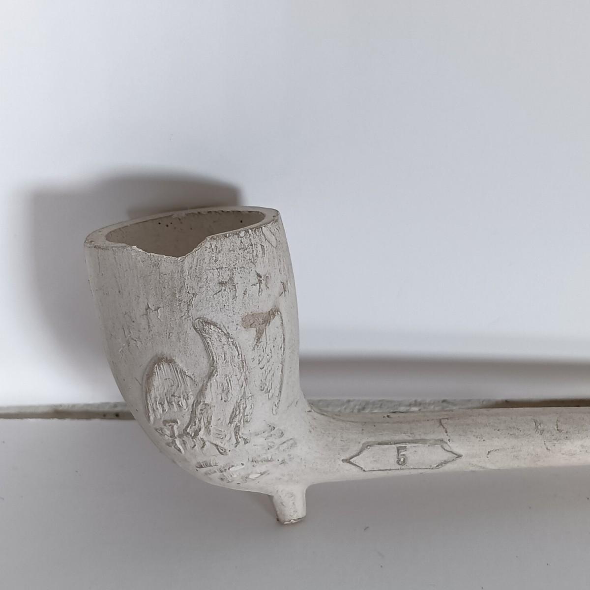 The bowl of the white pipe is chipped, and the tip of the stem is chipped.