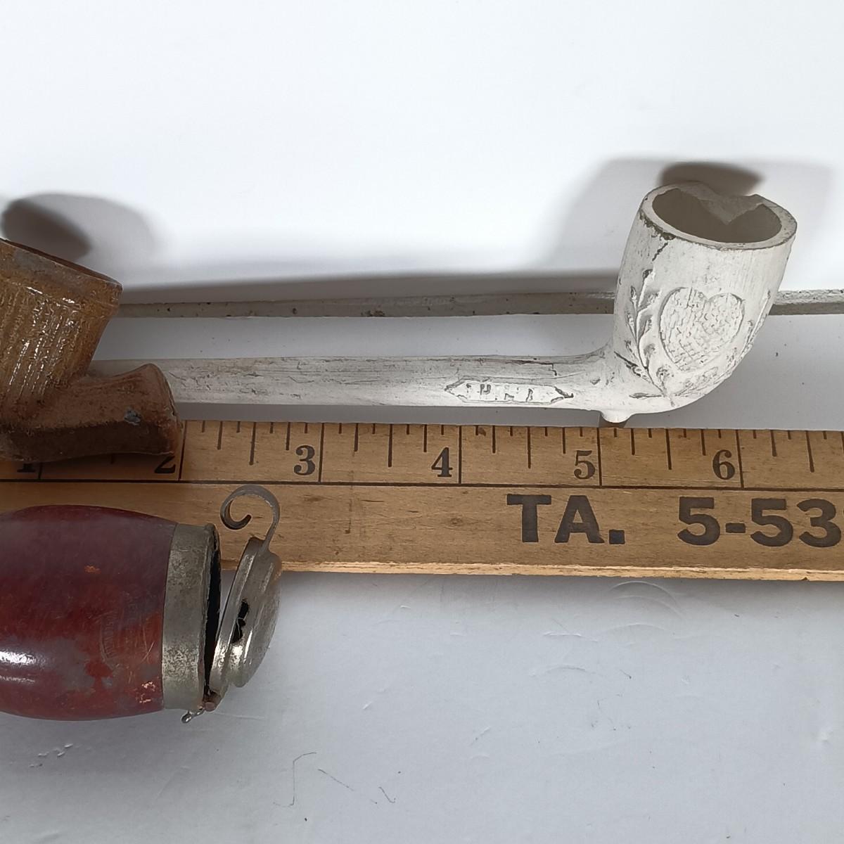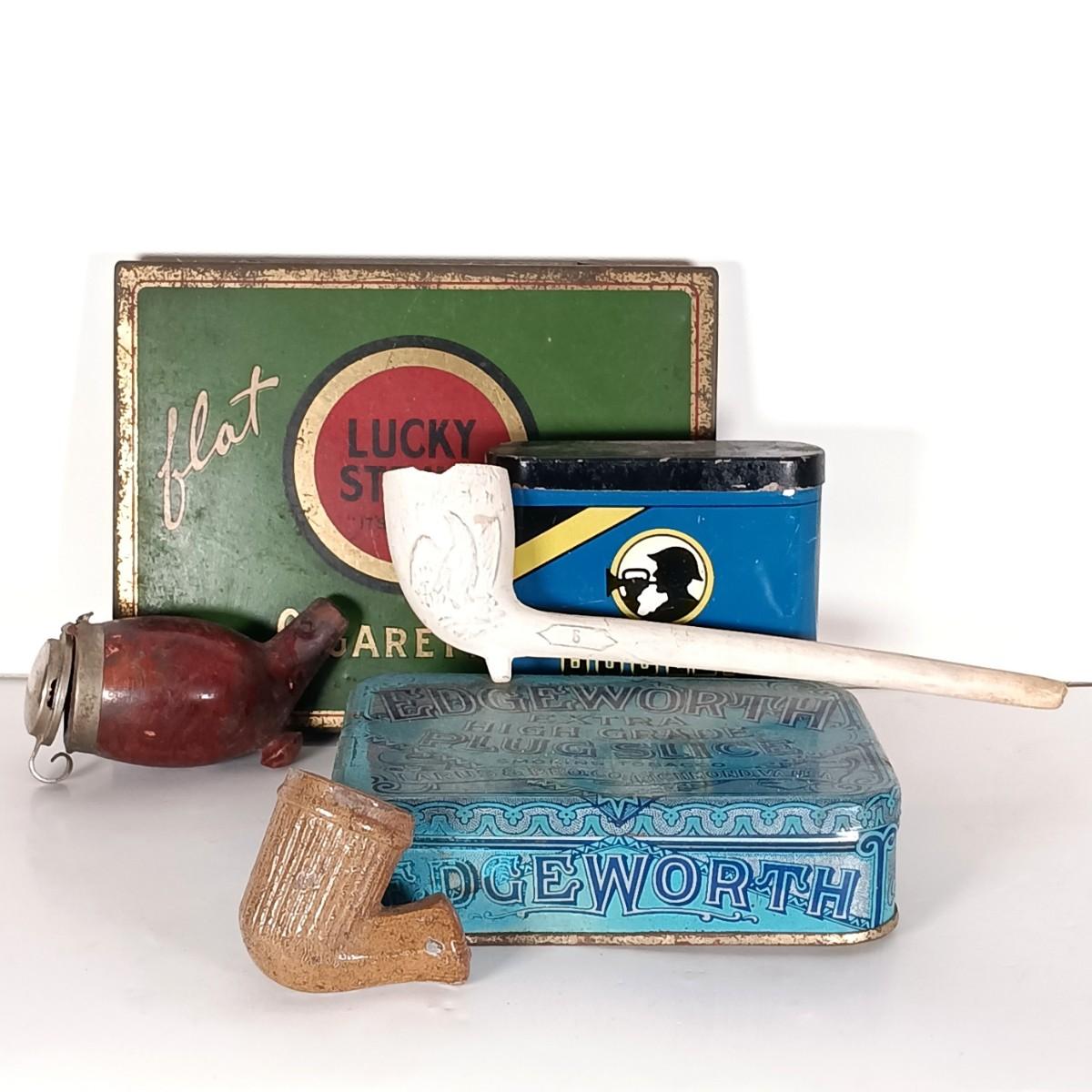 LOT 308: Civil War-Style Clay Pipe, Lidded Wooden Pipe Bowl, White Clay Pipe & Vintage Tobacco Tins