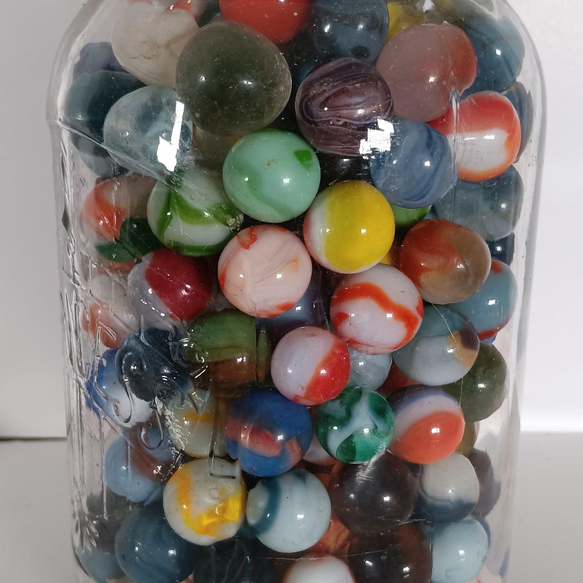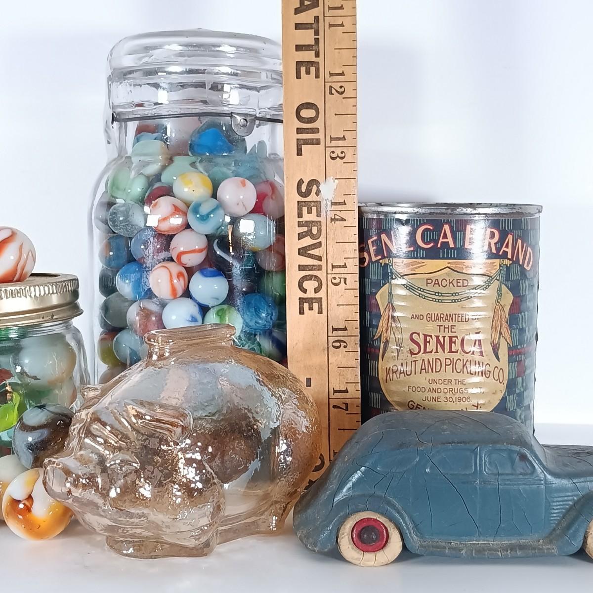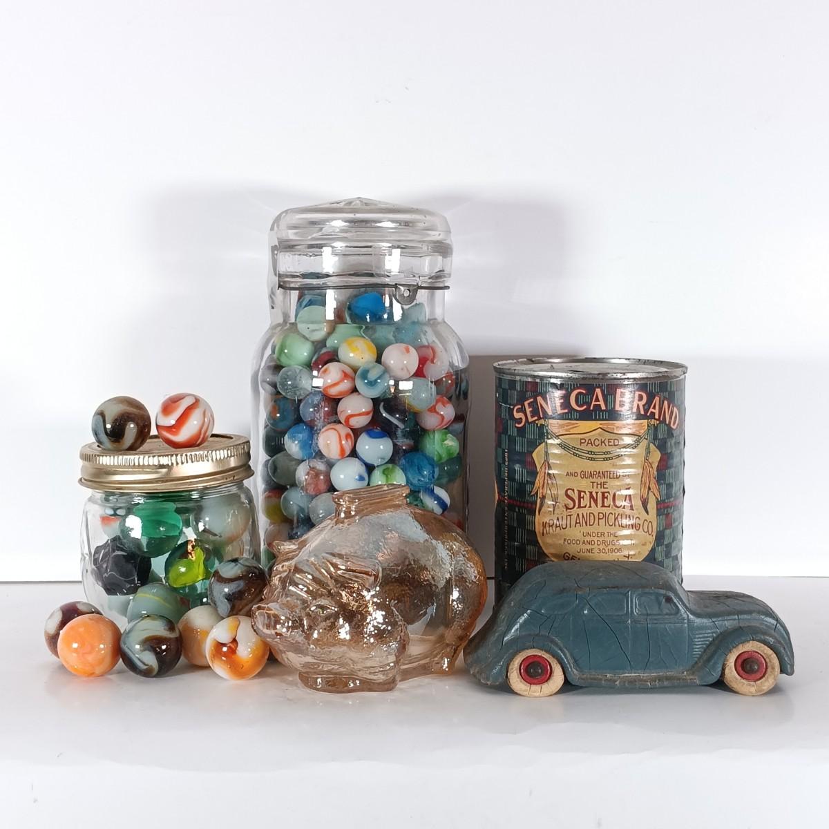 LOT 314: Vintage Marbles, Rubber DeSoto AirFlow Toy Car, Carnival Glass Piggy Bank & Seneca Sauerkraut Coin Bank