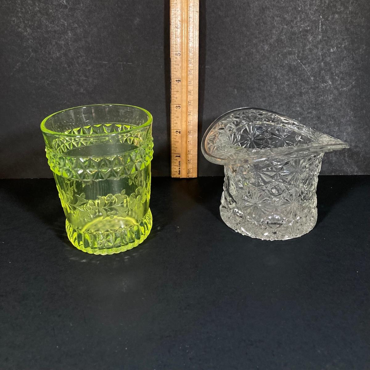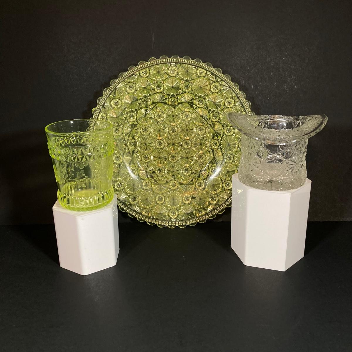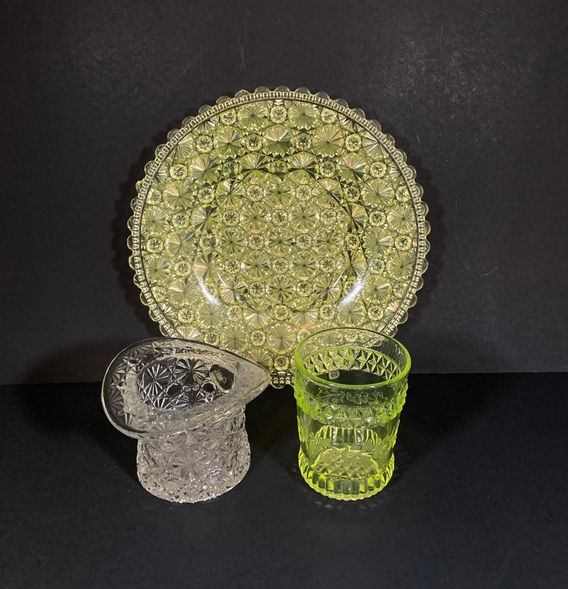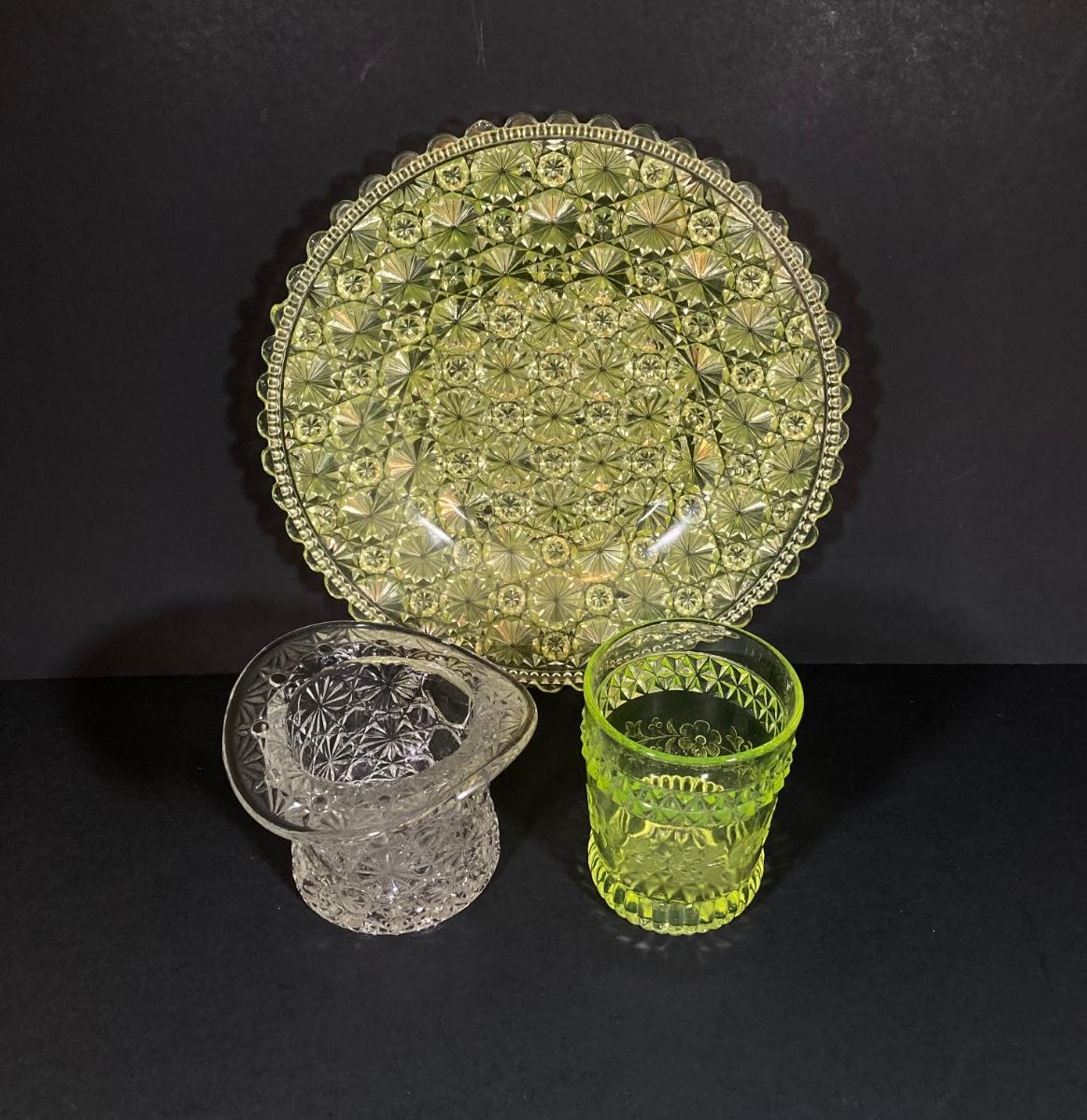 LOT 328: Beautiful Daisy & Button Glass and More - EAPN - Early American Patterned Glass Plate, Glass Top Hat and Vaseline Glowing Drinking Glass
