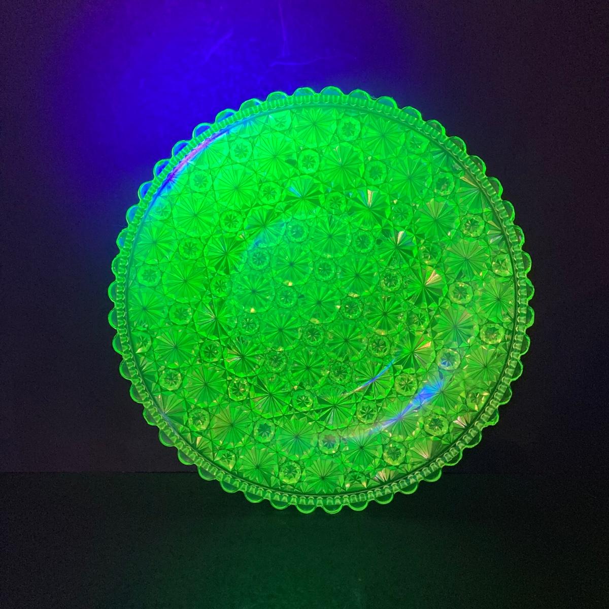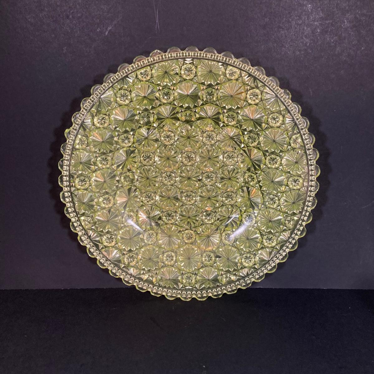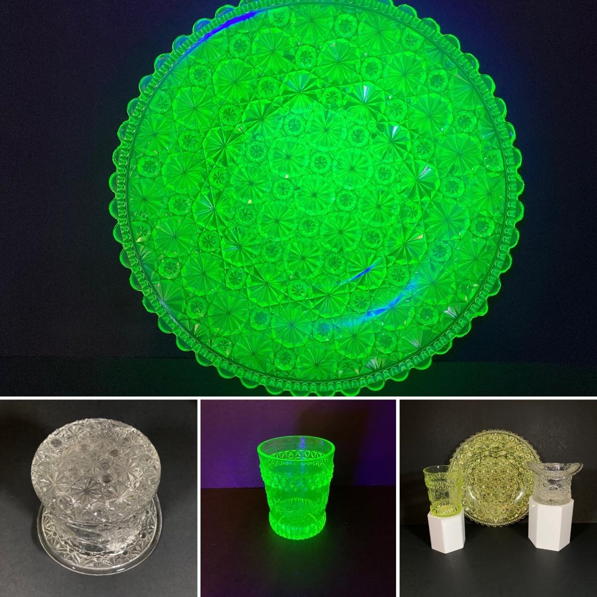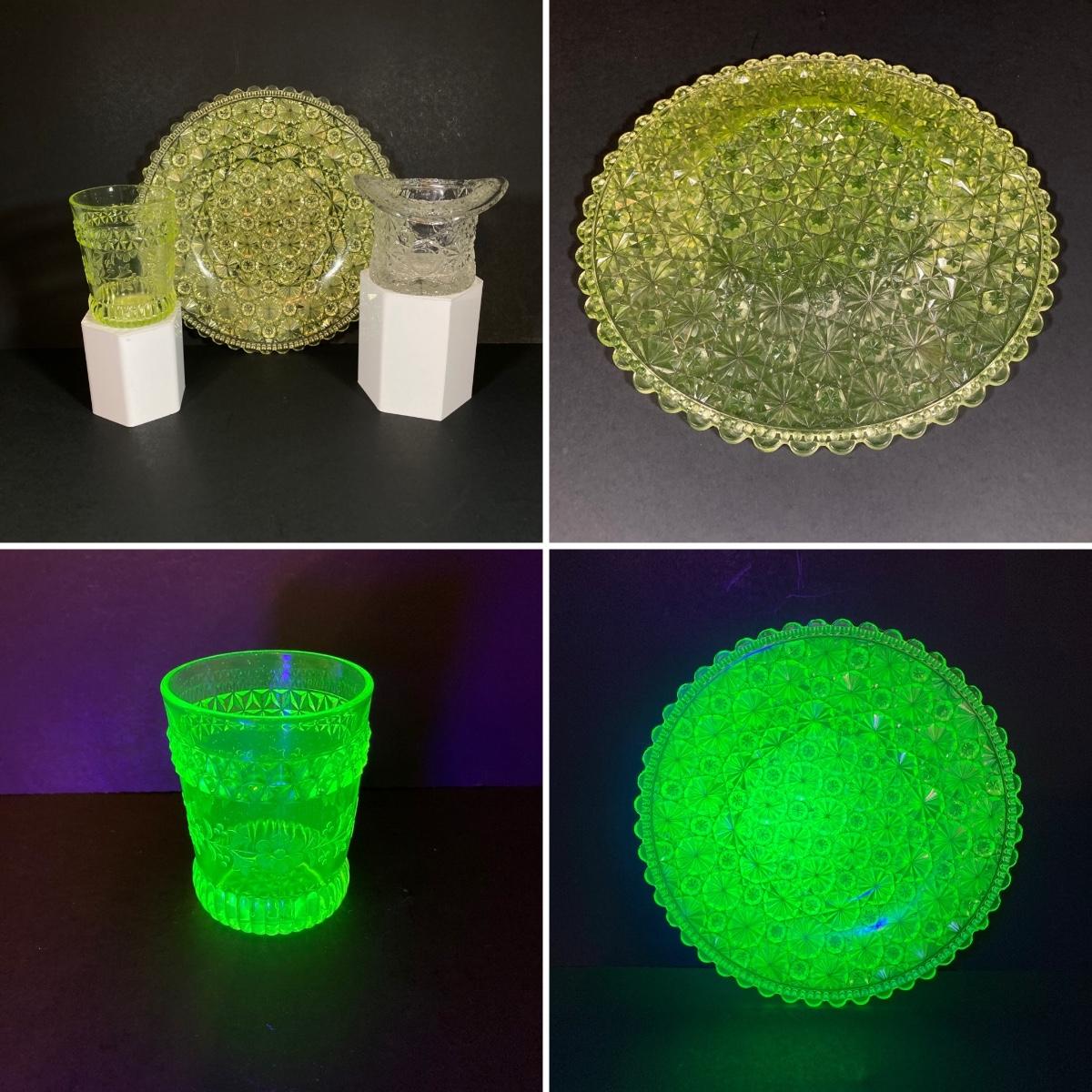 LOT 328: Beautiful Daisy & Button Glass and More - EAPN - Early American Patterned Glass Plate, Glass Top Hat and Vaseline Glowing Drinking Glass
