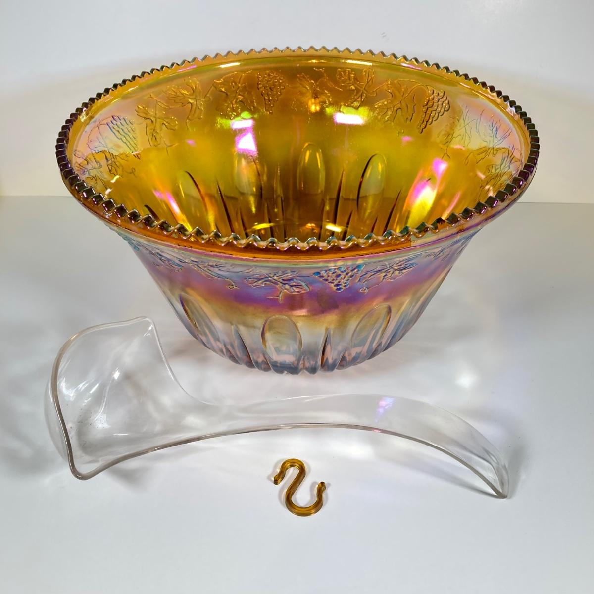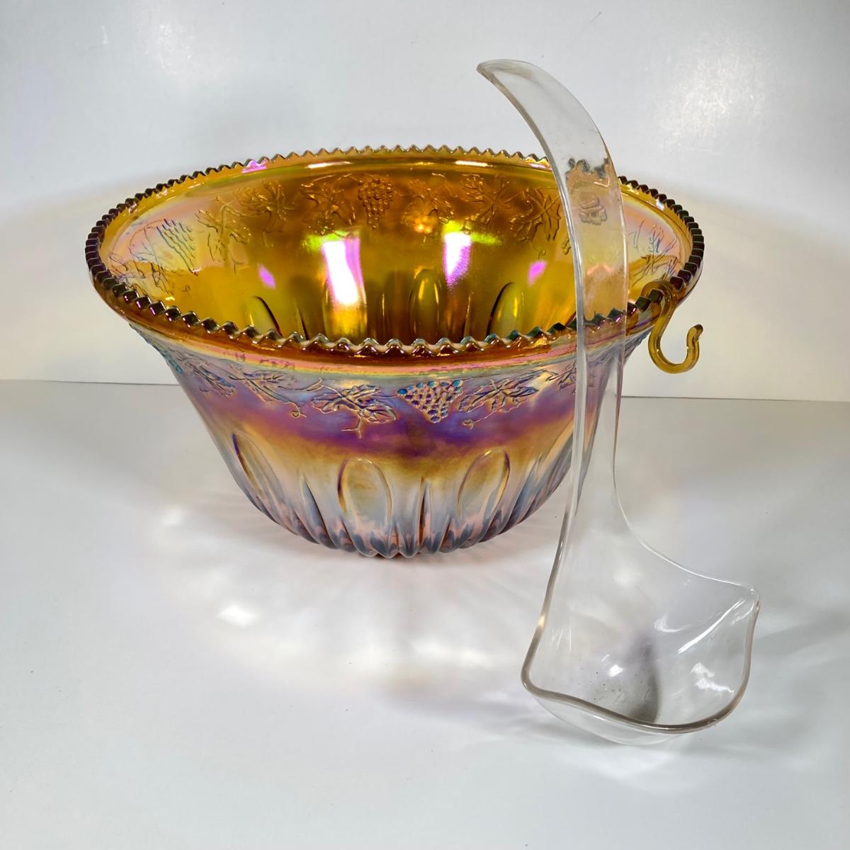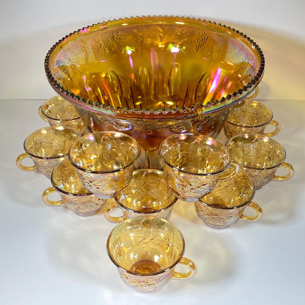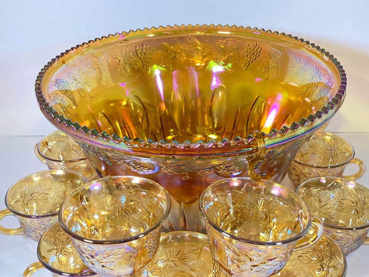 LOT 337: Dazzling Carnival Glass Punch Bowl with Twelve Cups