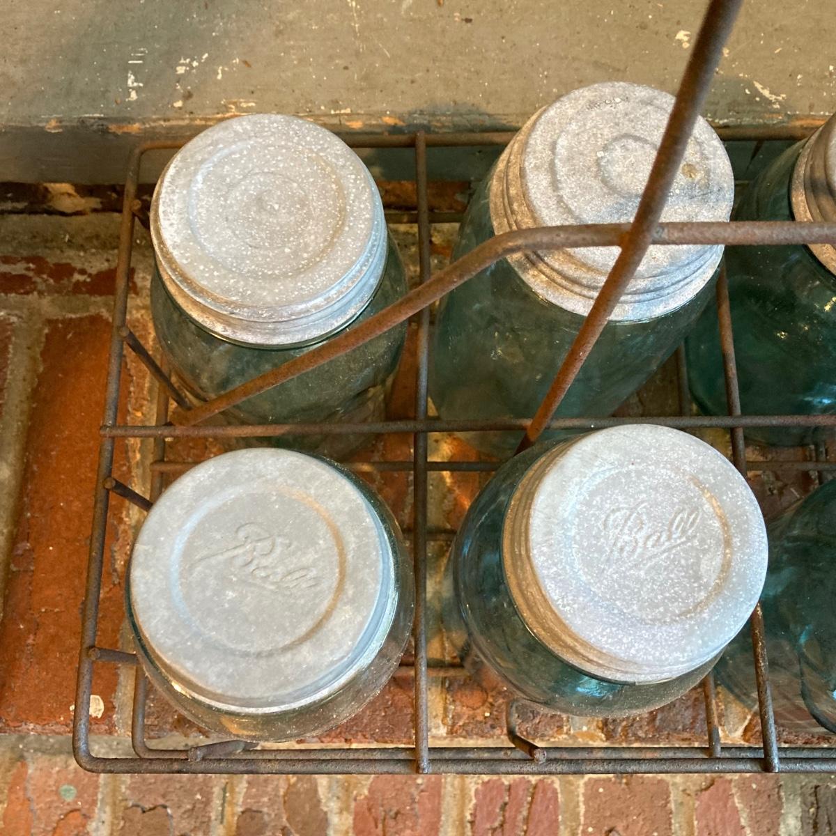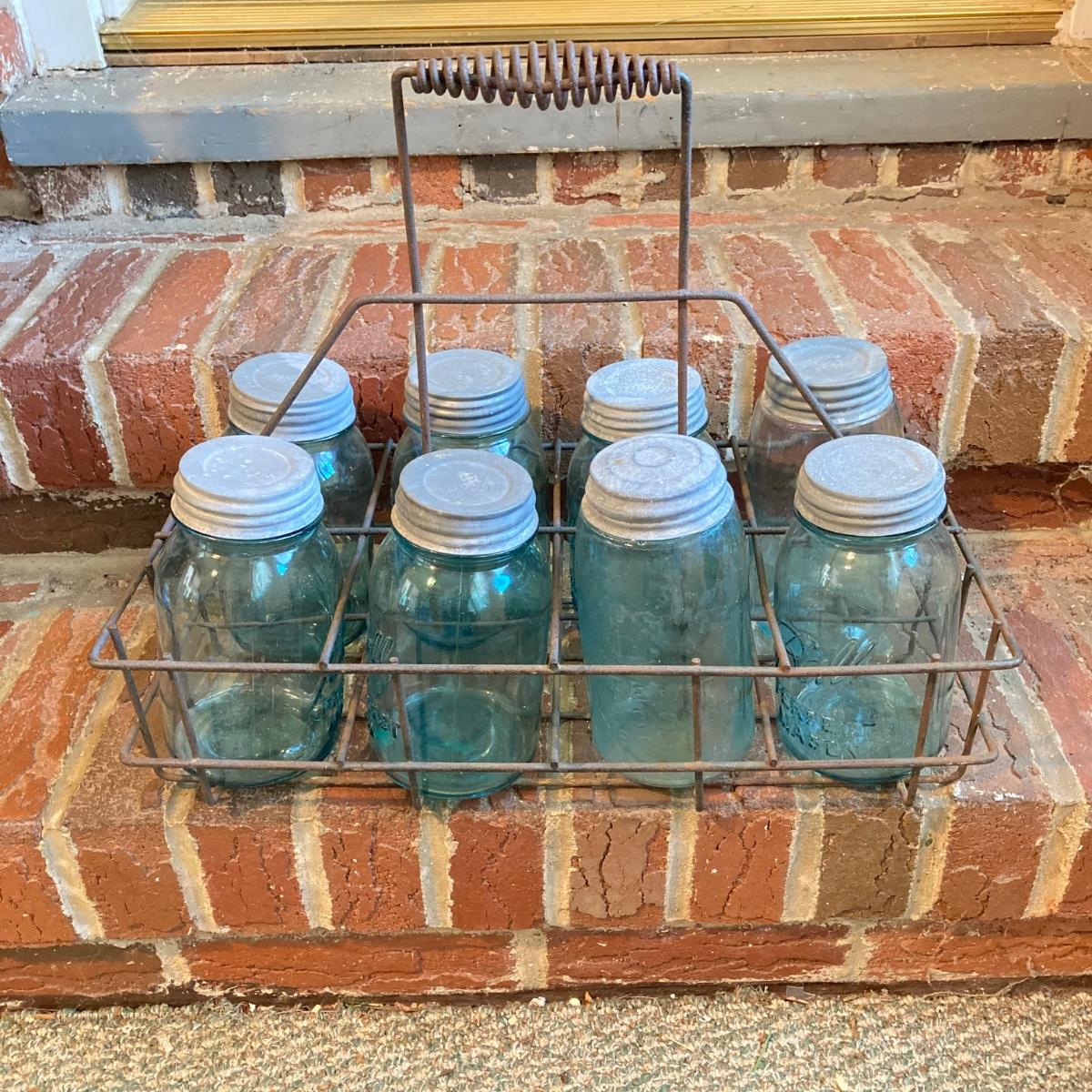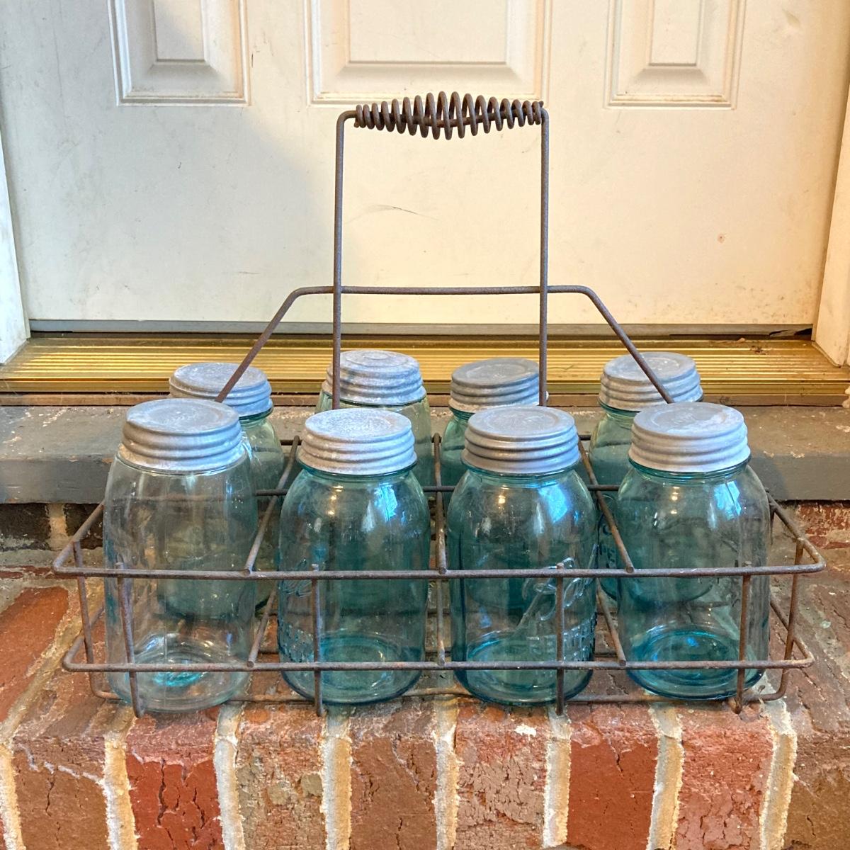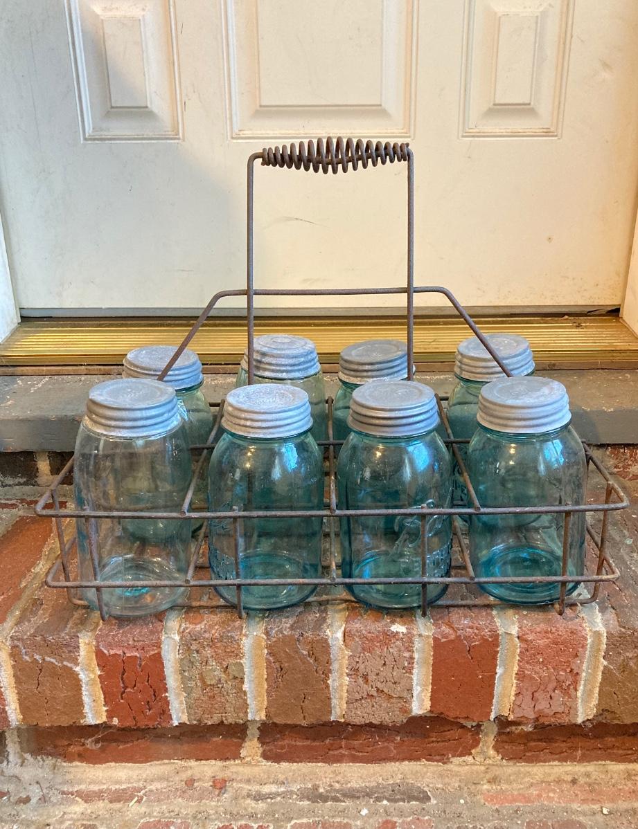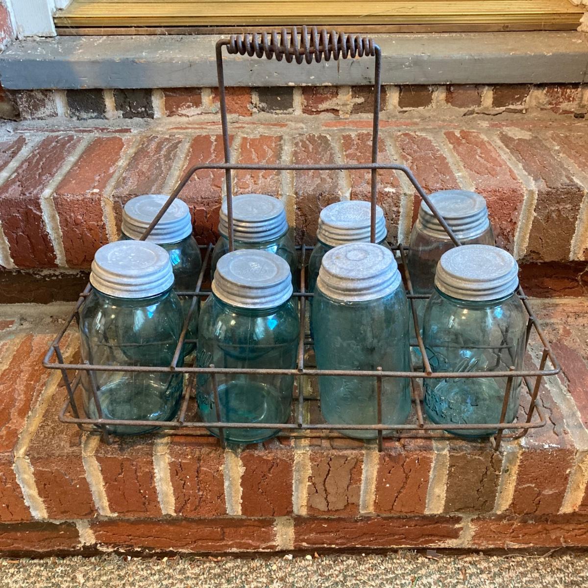 LOT 341: Vintage Blue Glass Canning Jars with Metal Carrier Rack