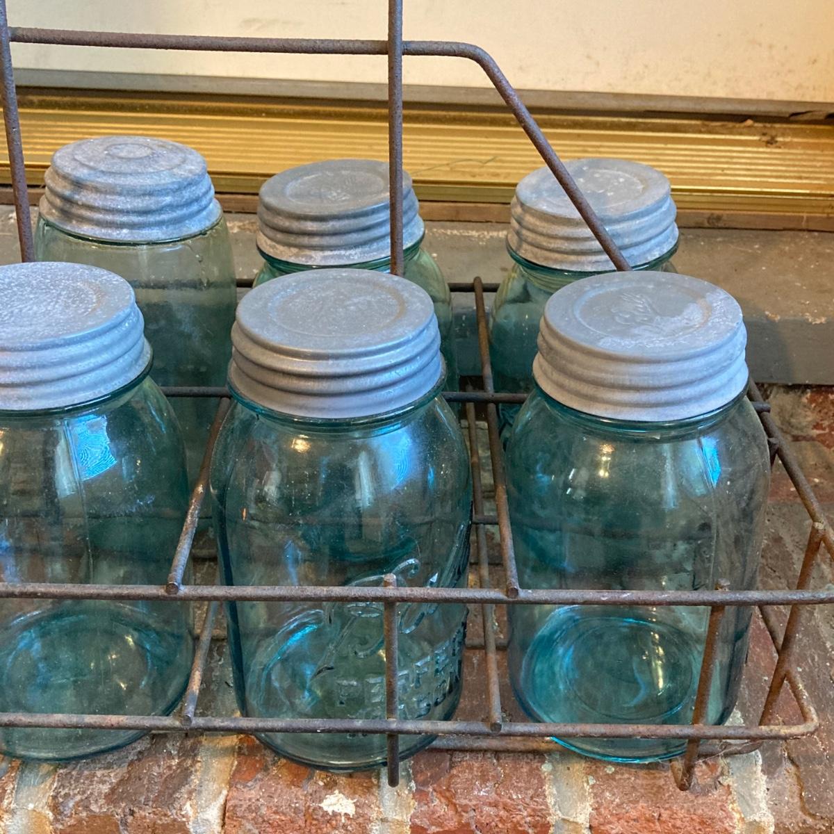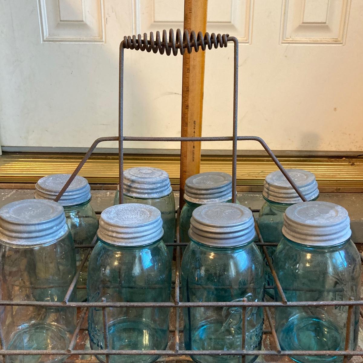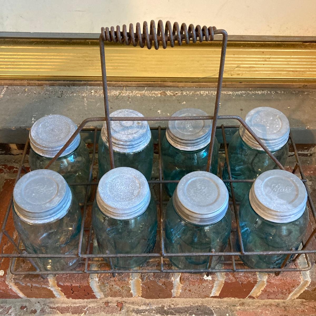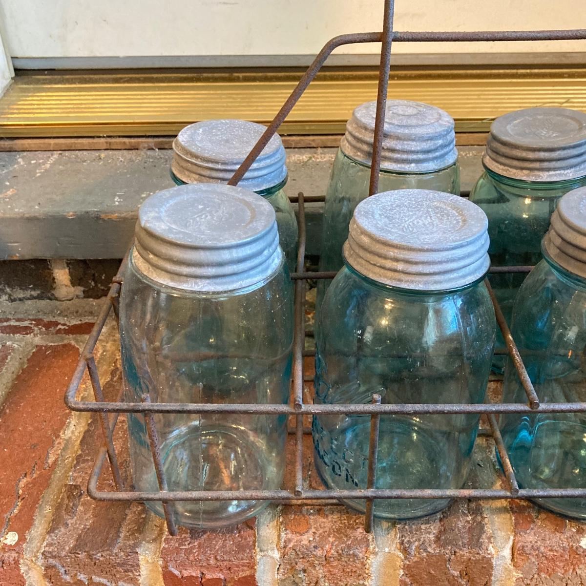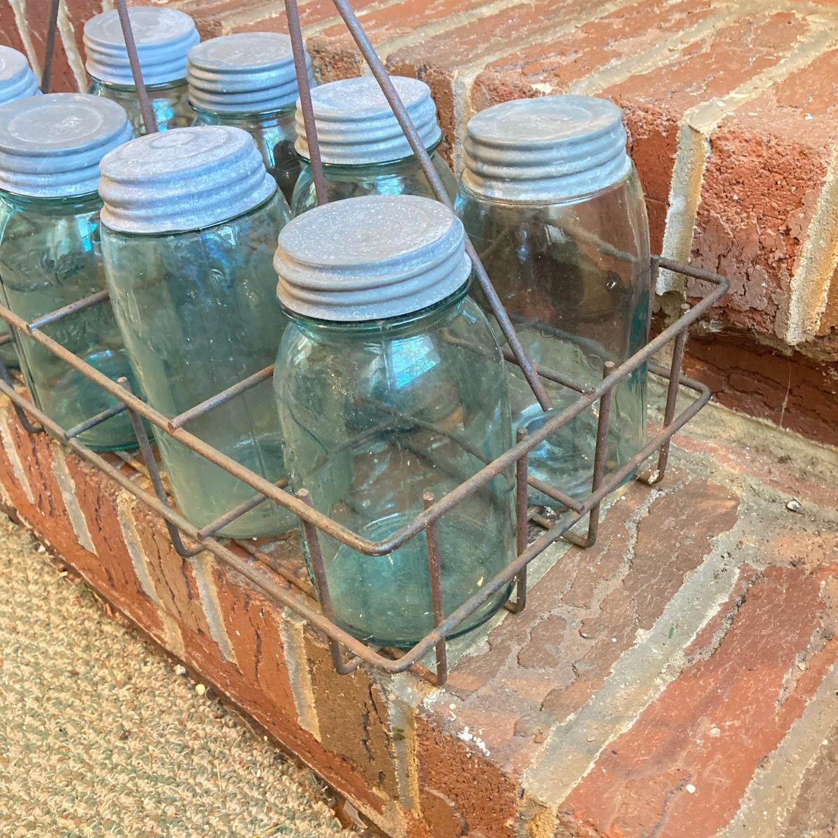 LOT 341: Vintage Blue Glass Canning Jars with Metal Carrier Rack