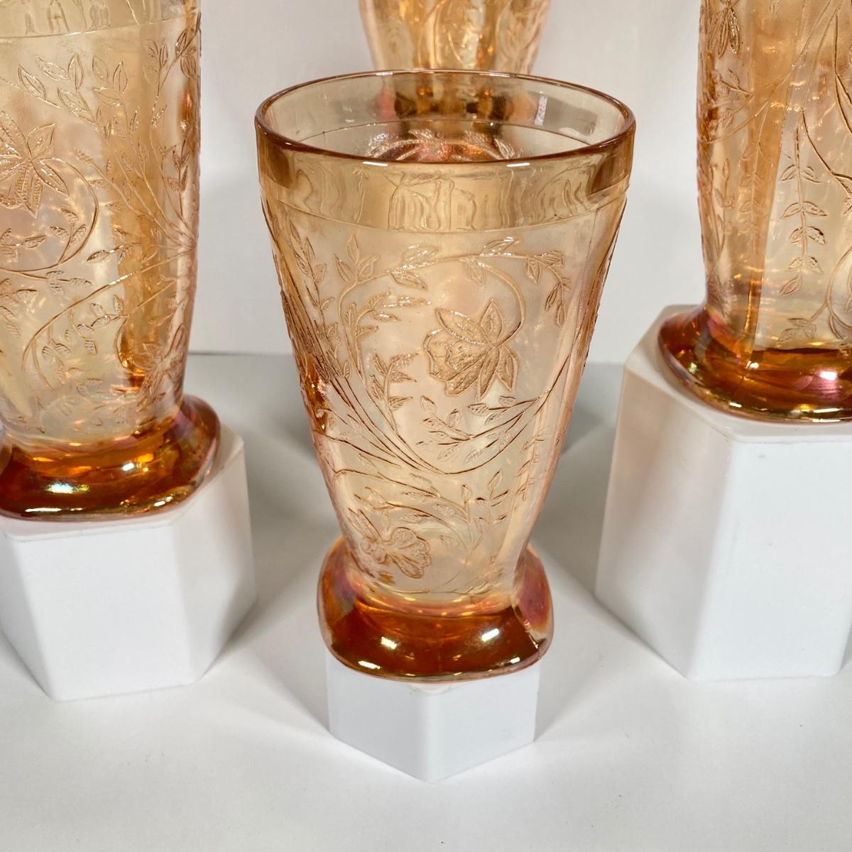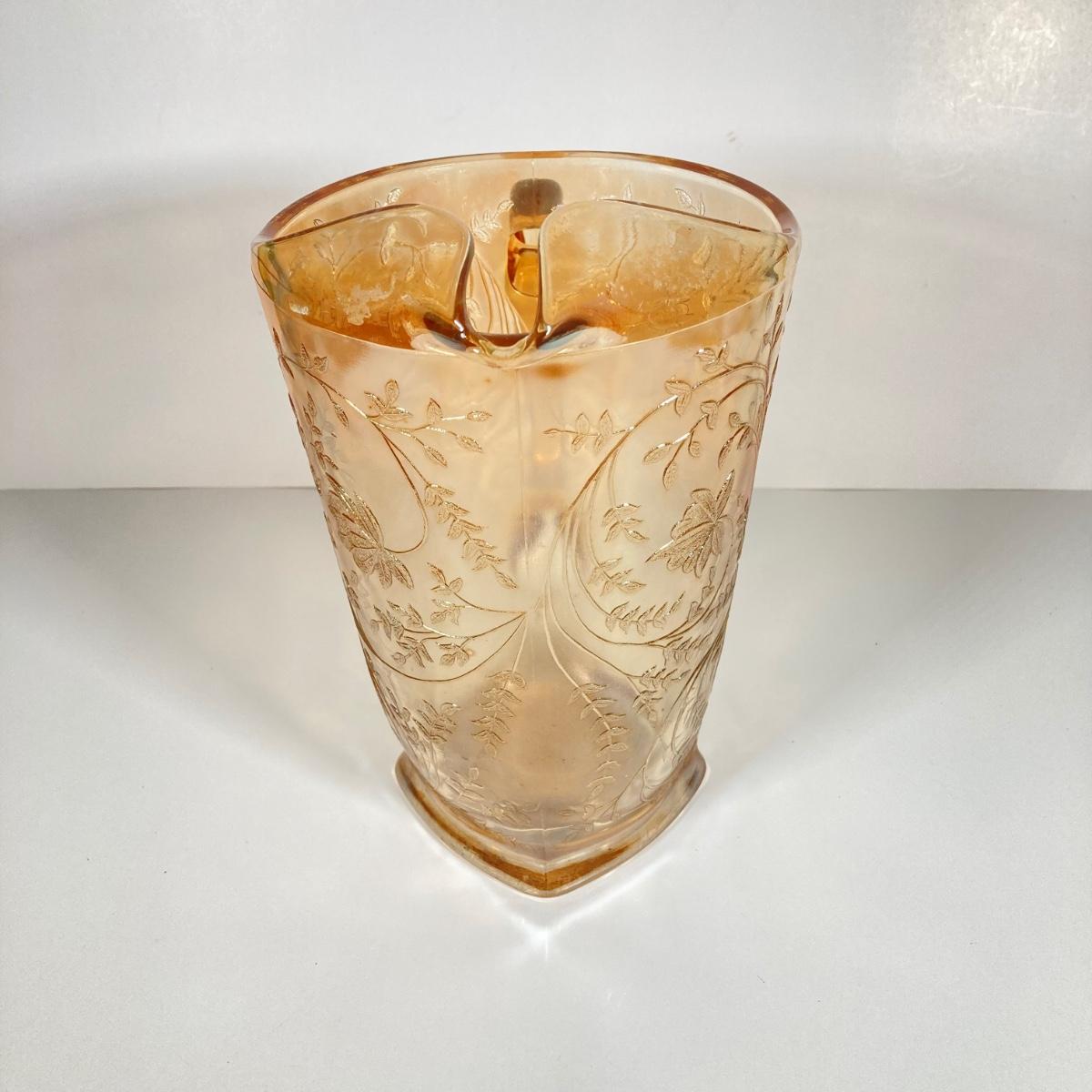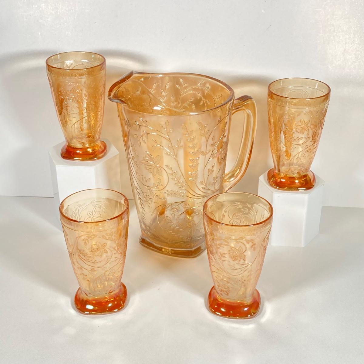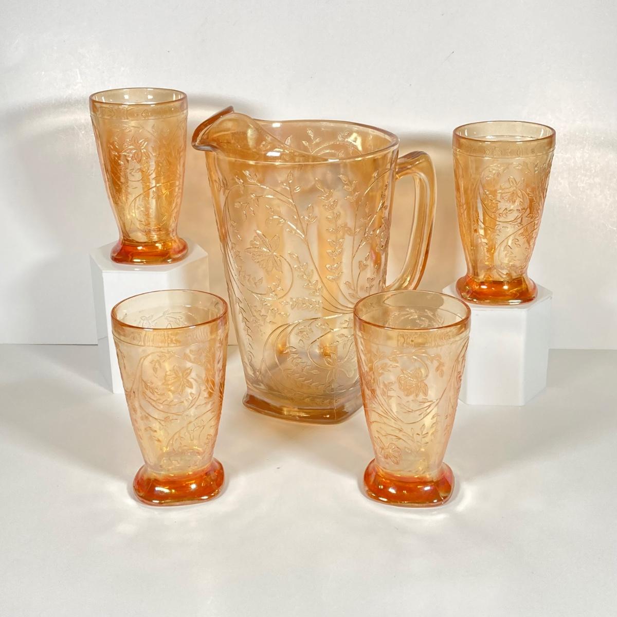 LOT 342: Carnival Glass Pitcher with Four Drinking Glasses