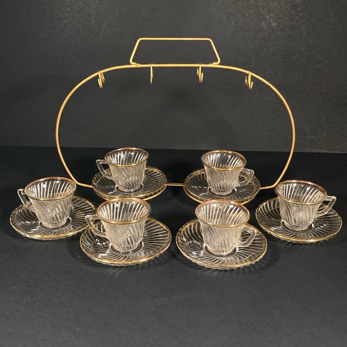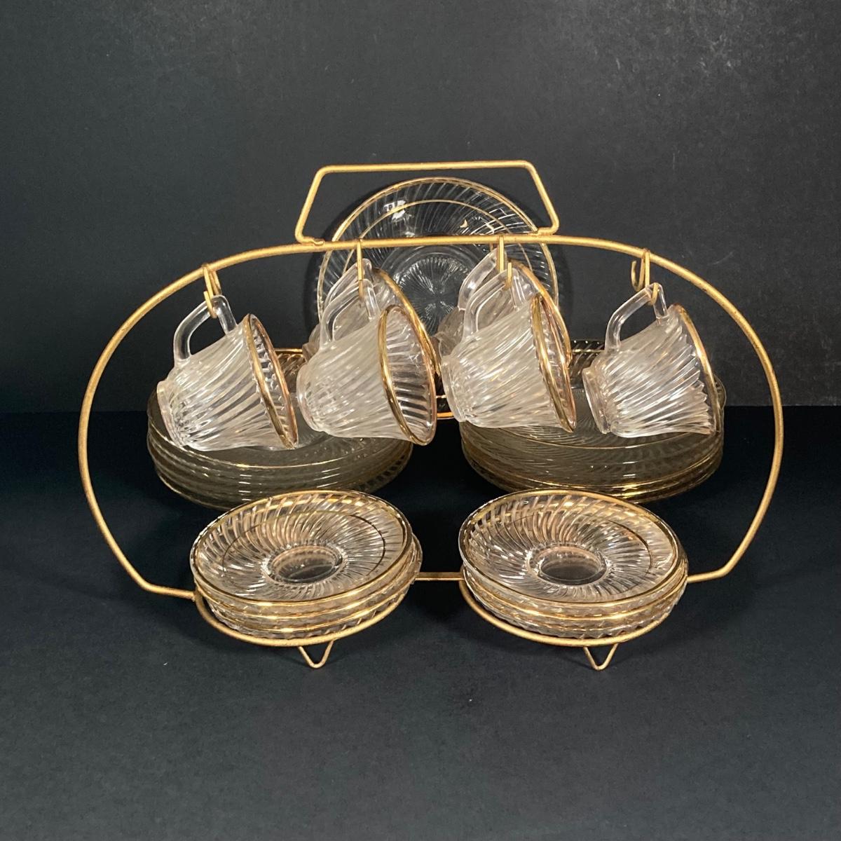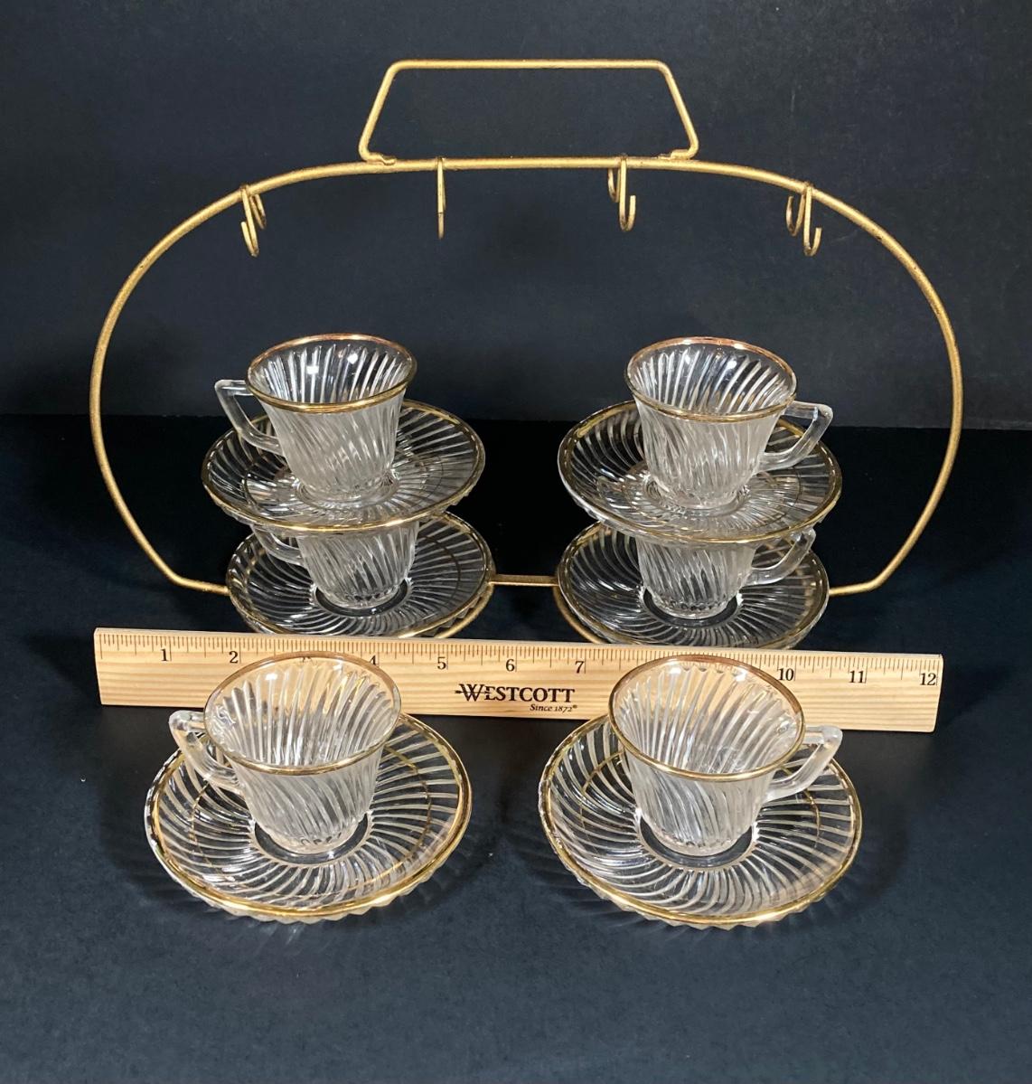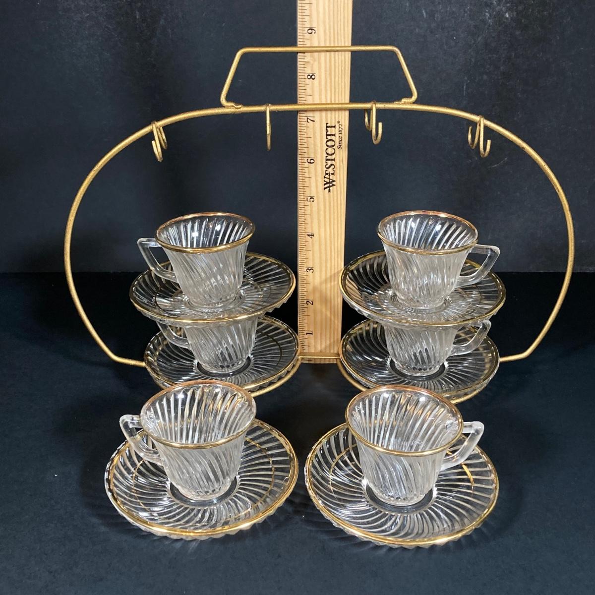 LOT 348: Vintage Glass w/Gold Trim Demitasse Set: Cups, Saucers, Dessert Plates and Holder