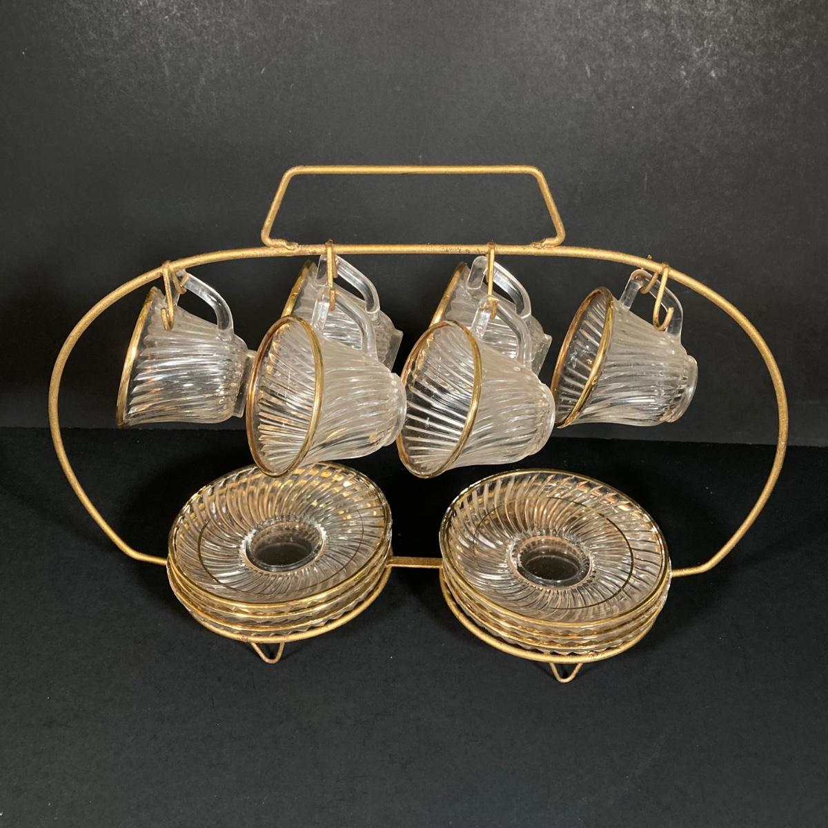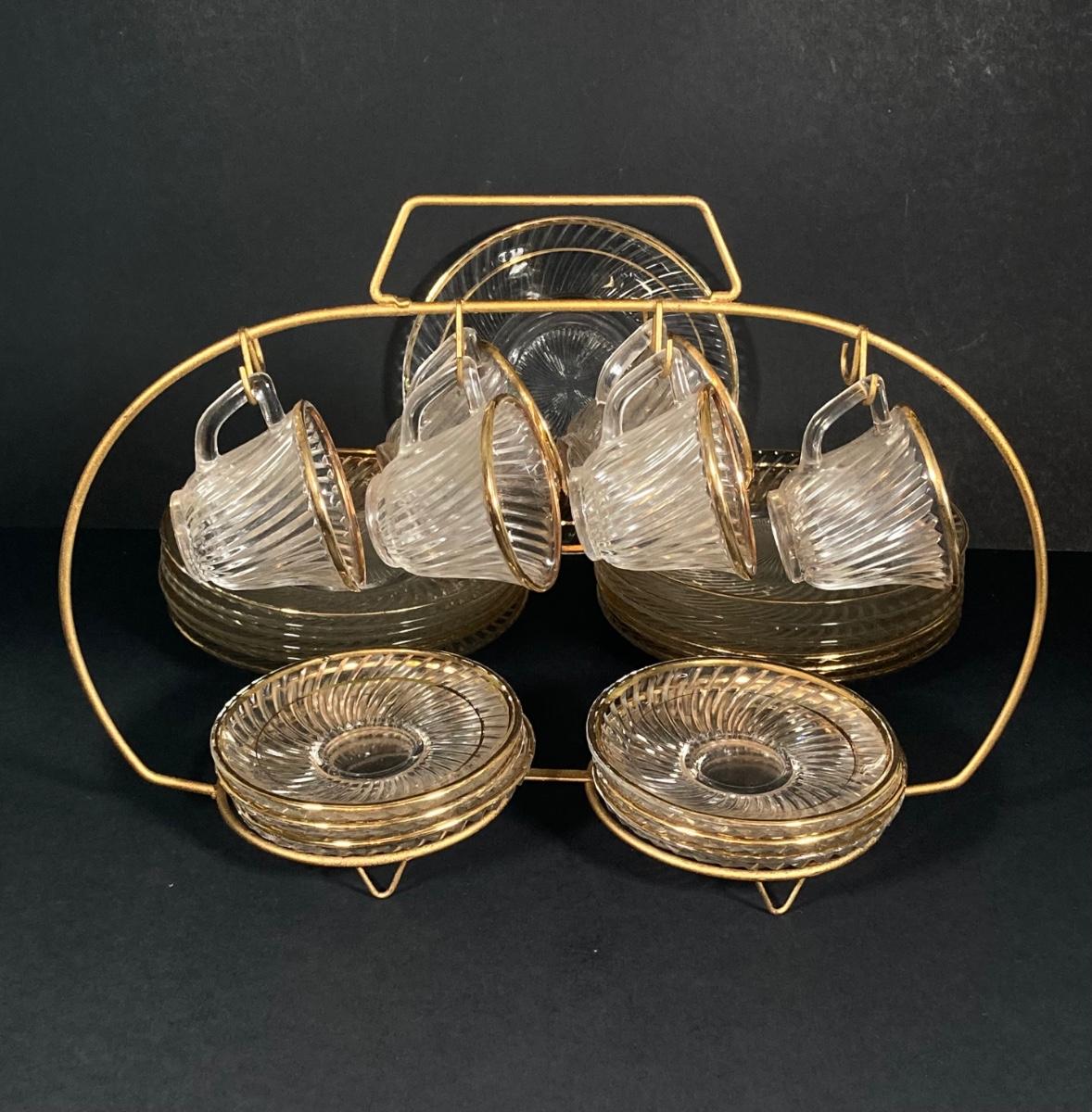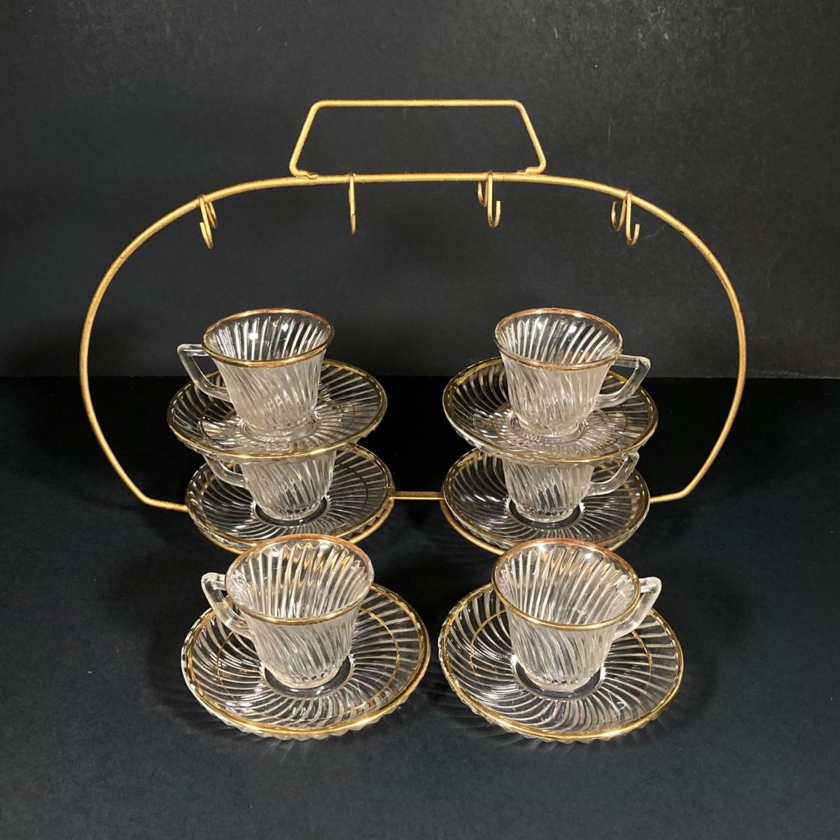 LOT 348: Vintage Glass w/Gold Trim Demitasse Set: Cups, Saucers, Dessert Plates and Holder