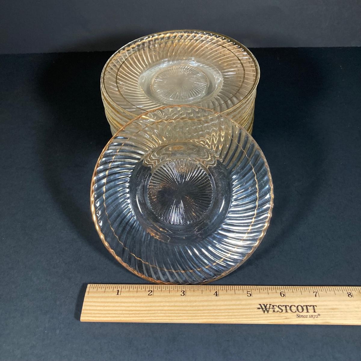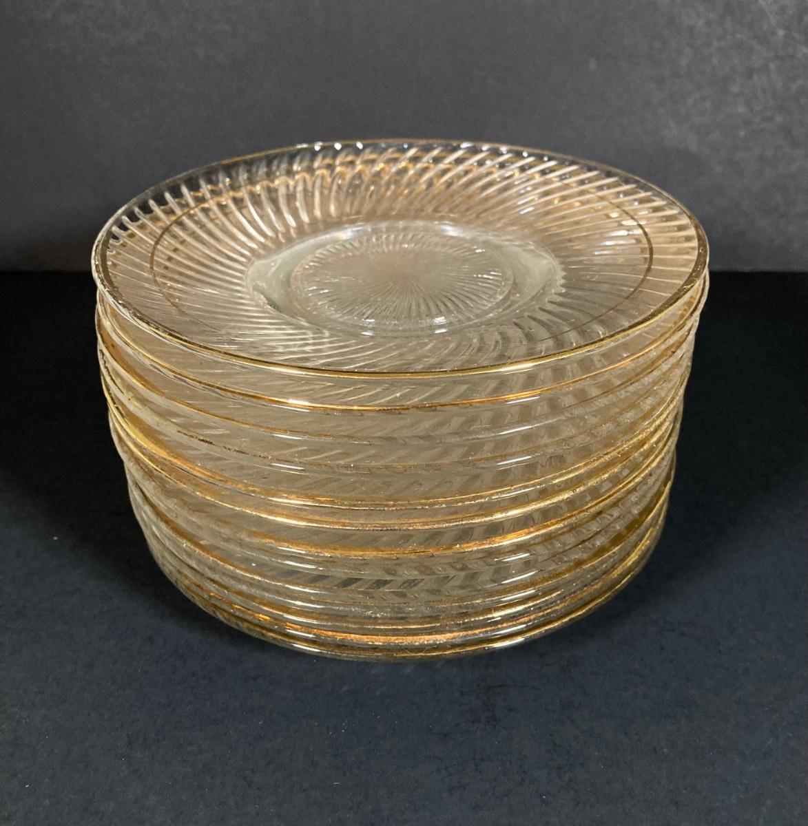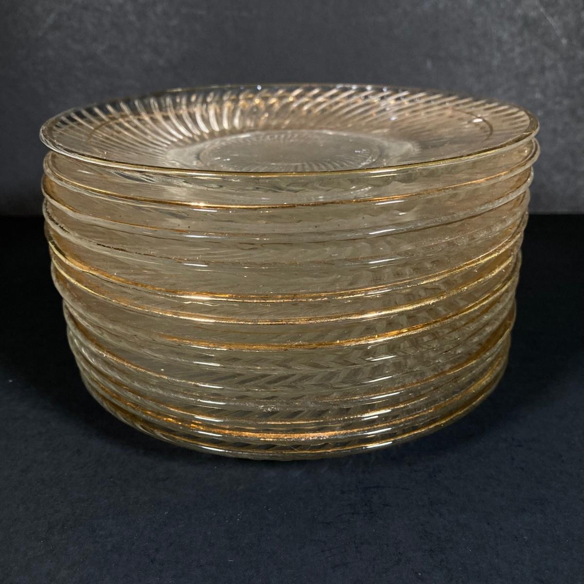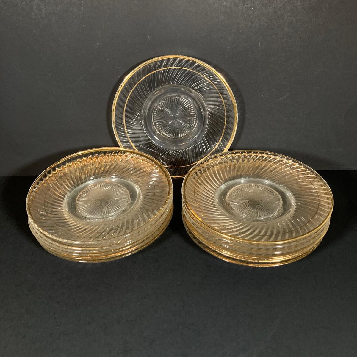 LOT 348: Vintage Glass w/Gold Trim Demitasse Set: Cups, Saucers, Dessert Plates and Holder