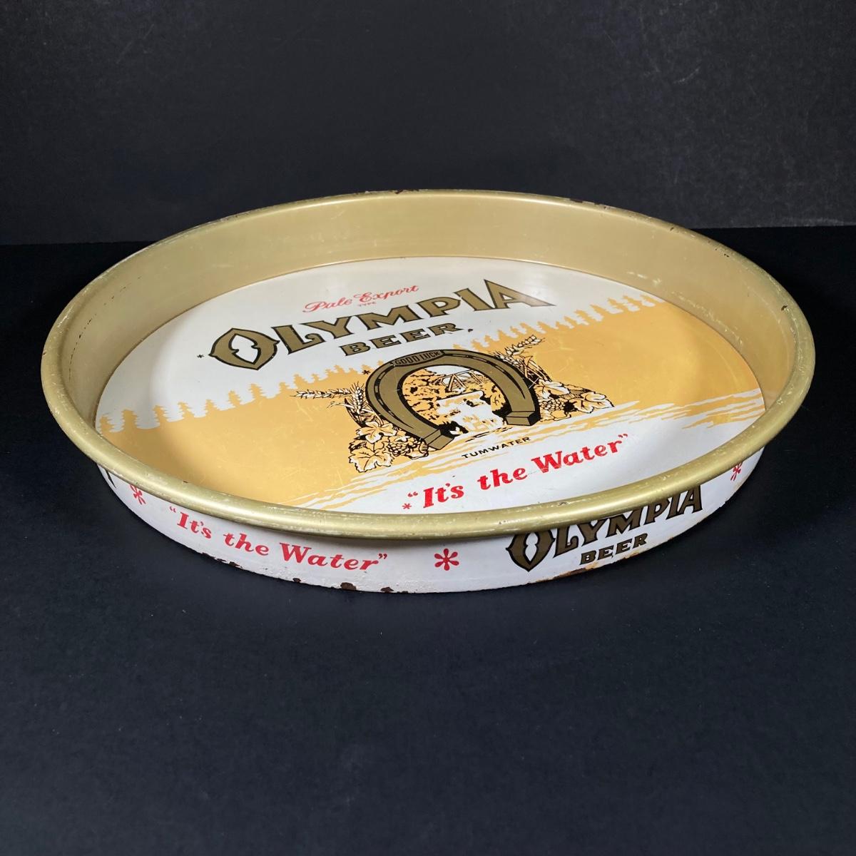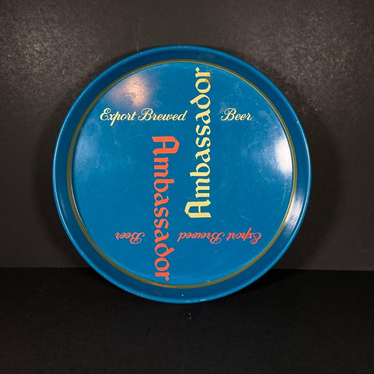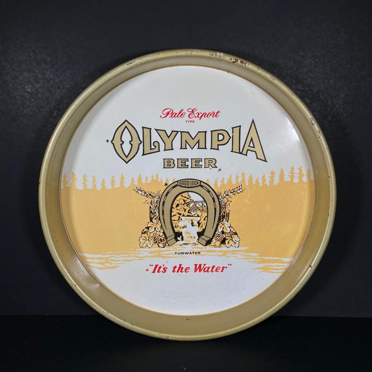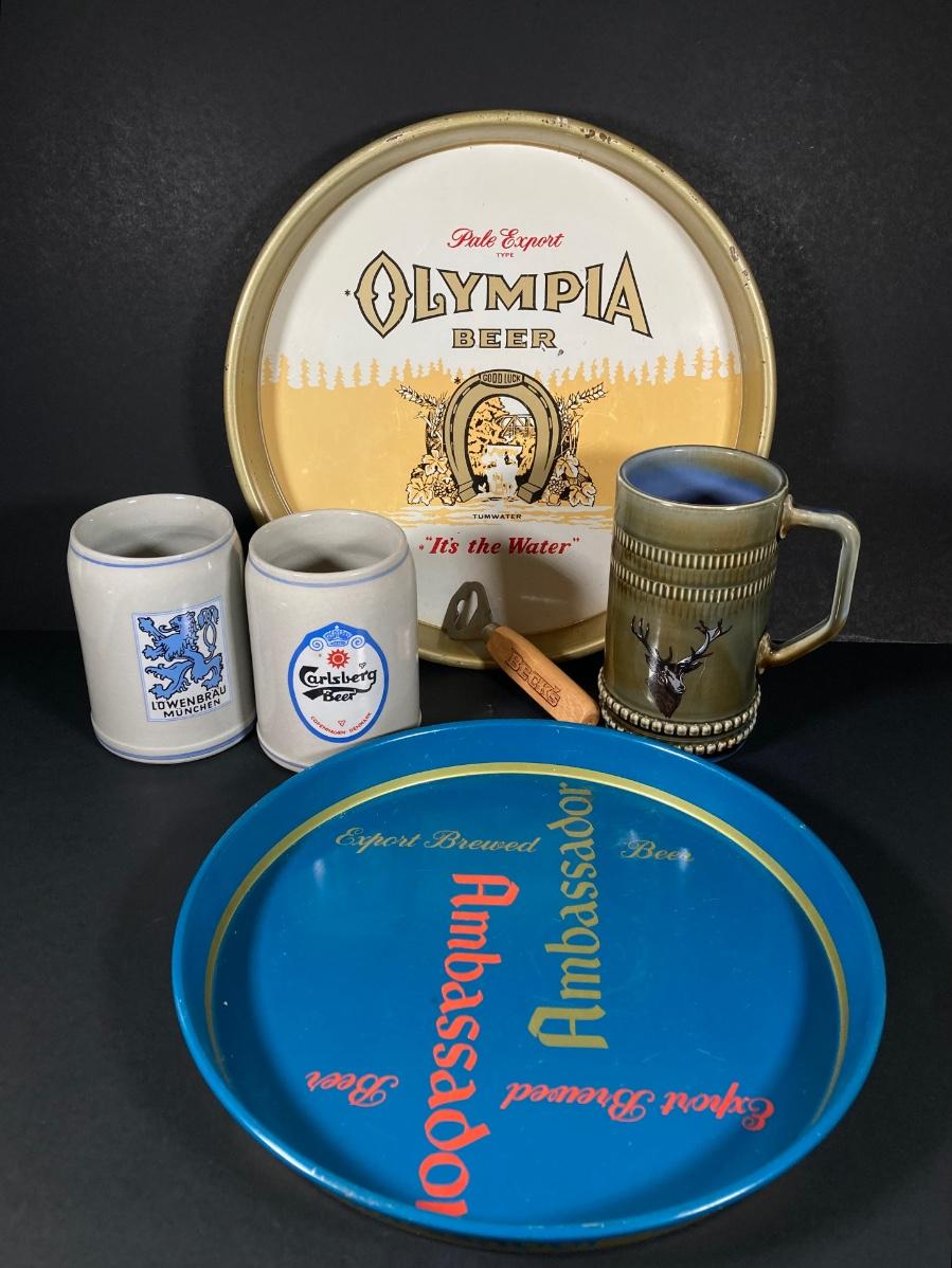 LOT 366: Vintage Olympia Beer and Ambassador Export Brewed Metal Beer Trays with German / Irish Mugs and More