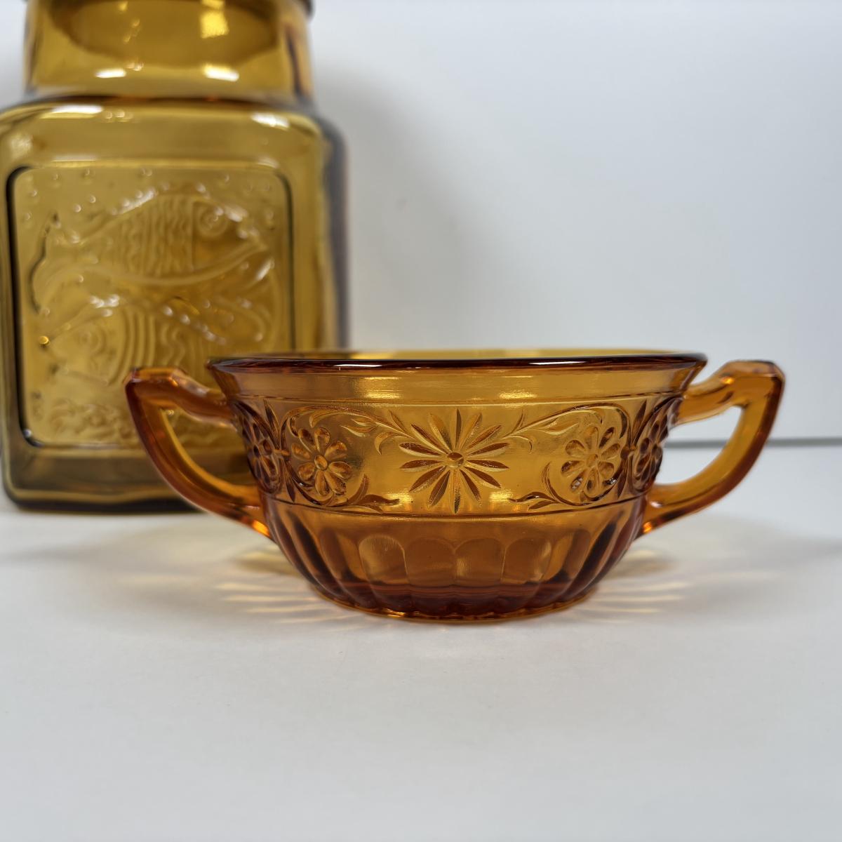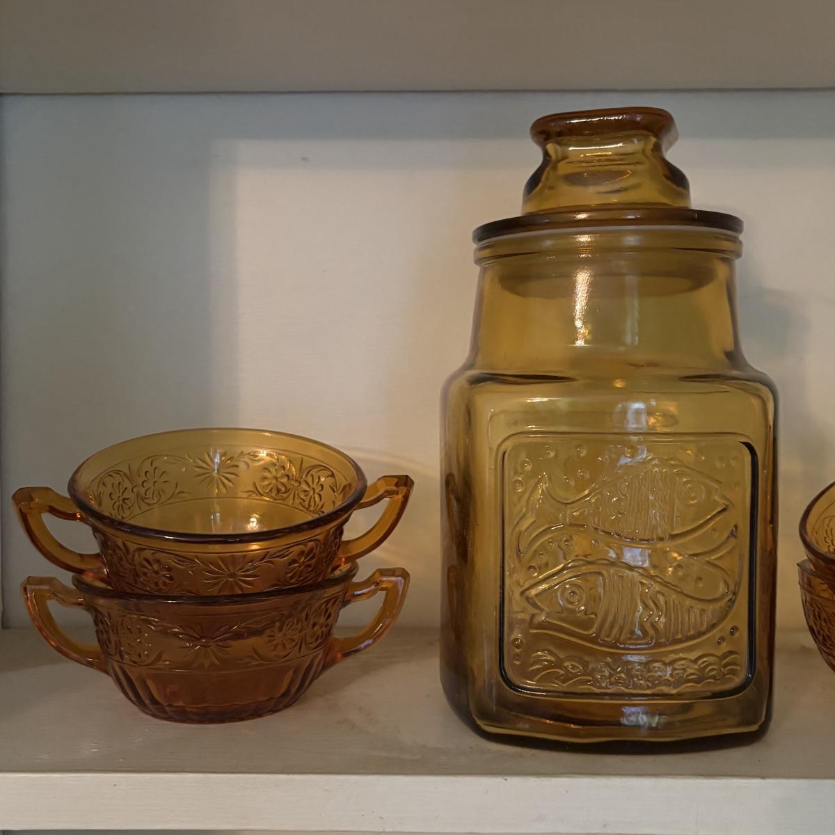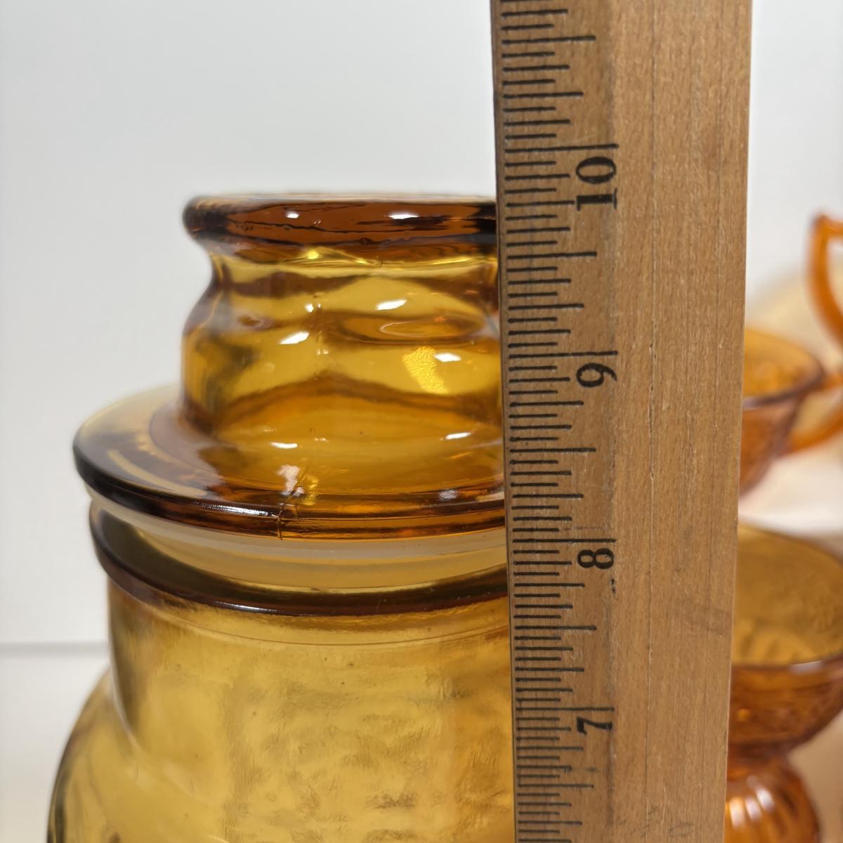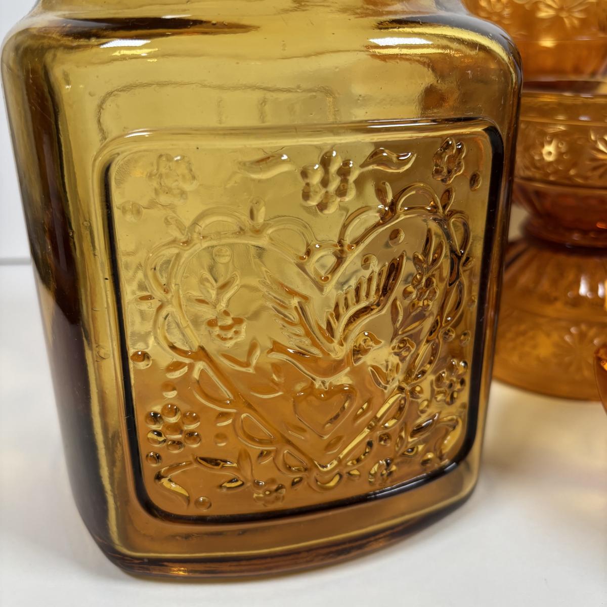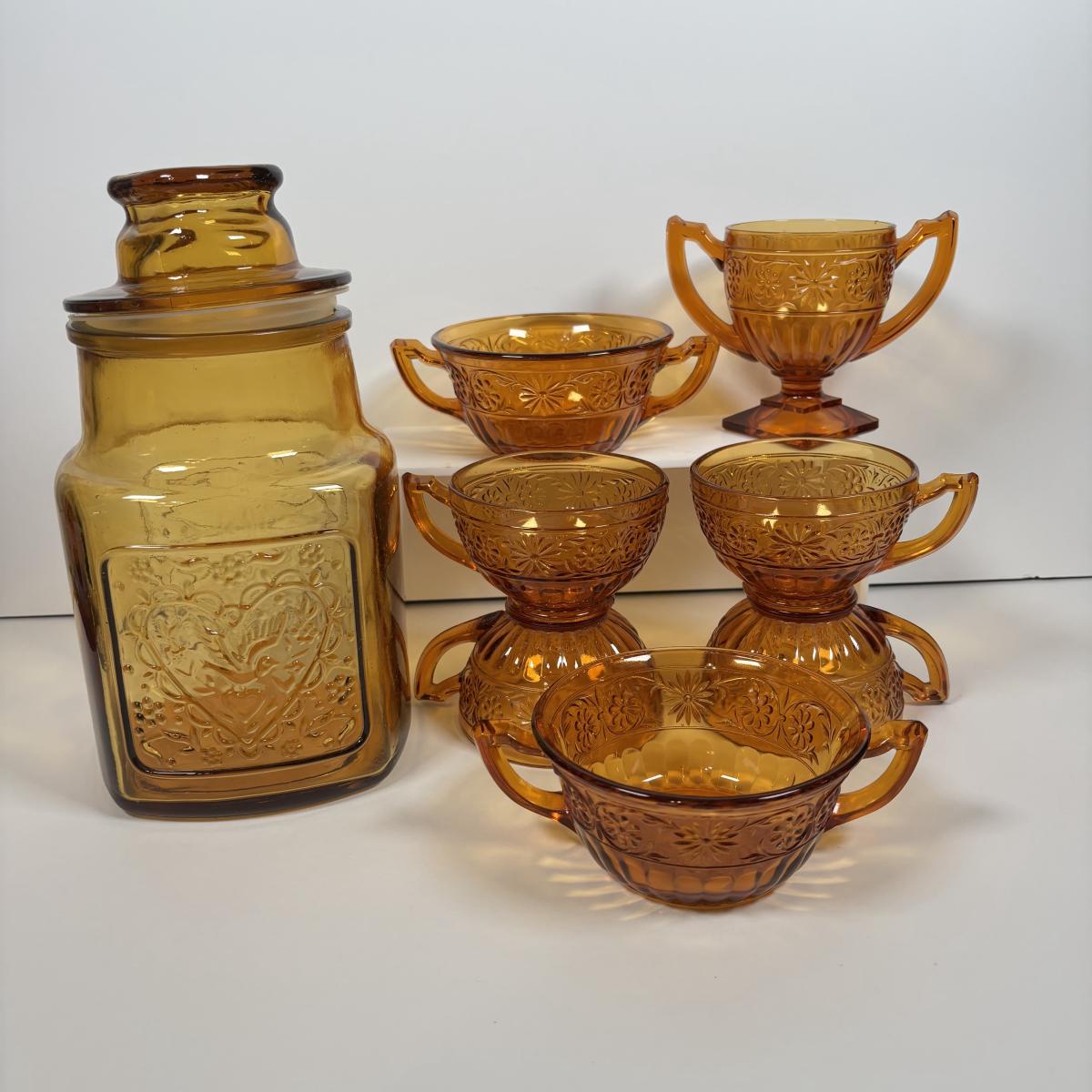 LOT 380: Vintage Amber Wheaton Glass Embossed Canister Jar & Indiana Depression Amber Glassware