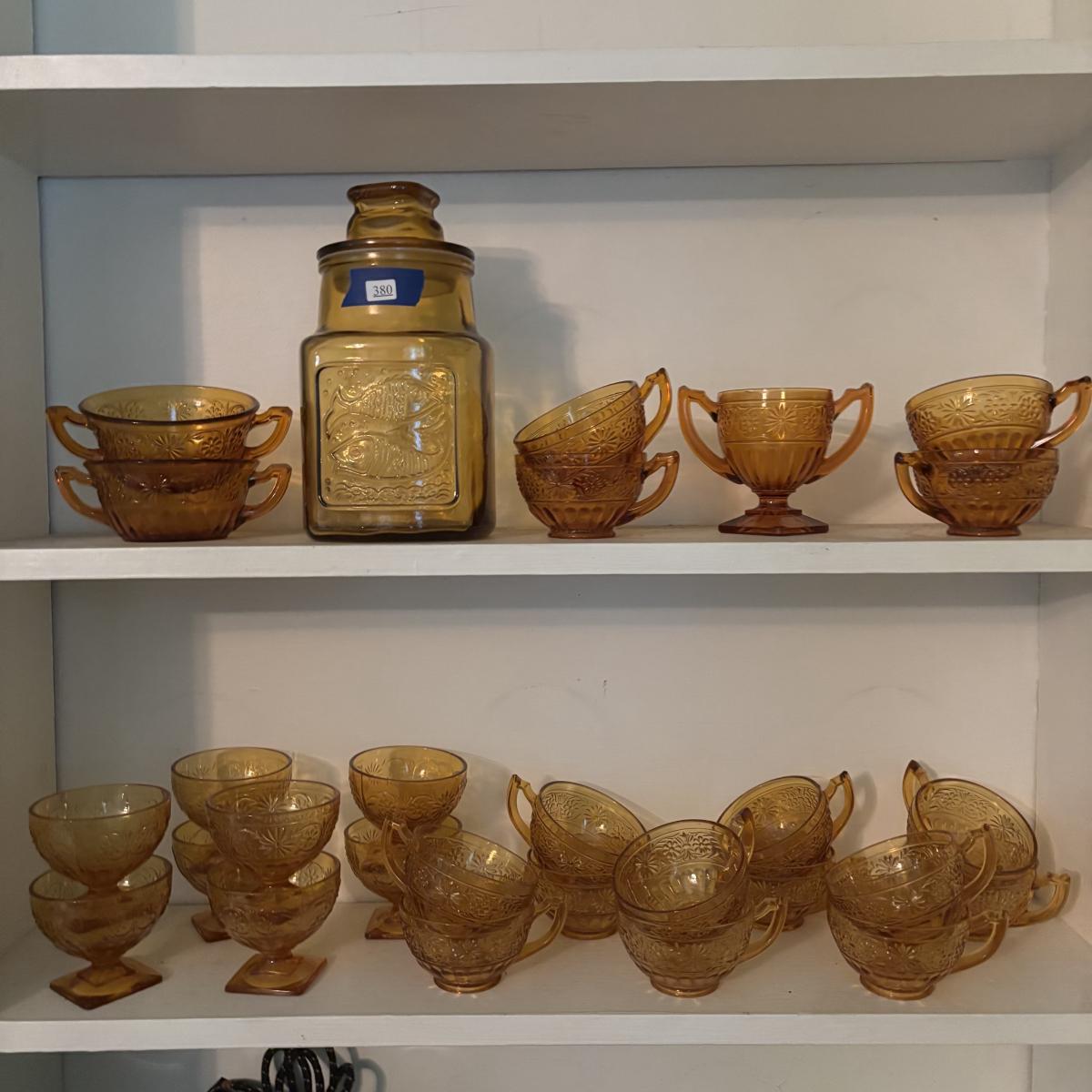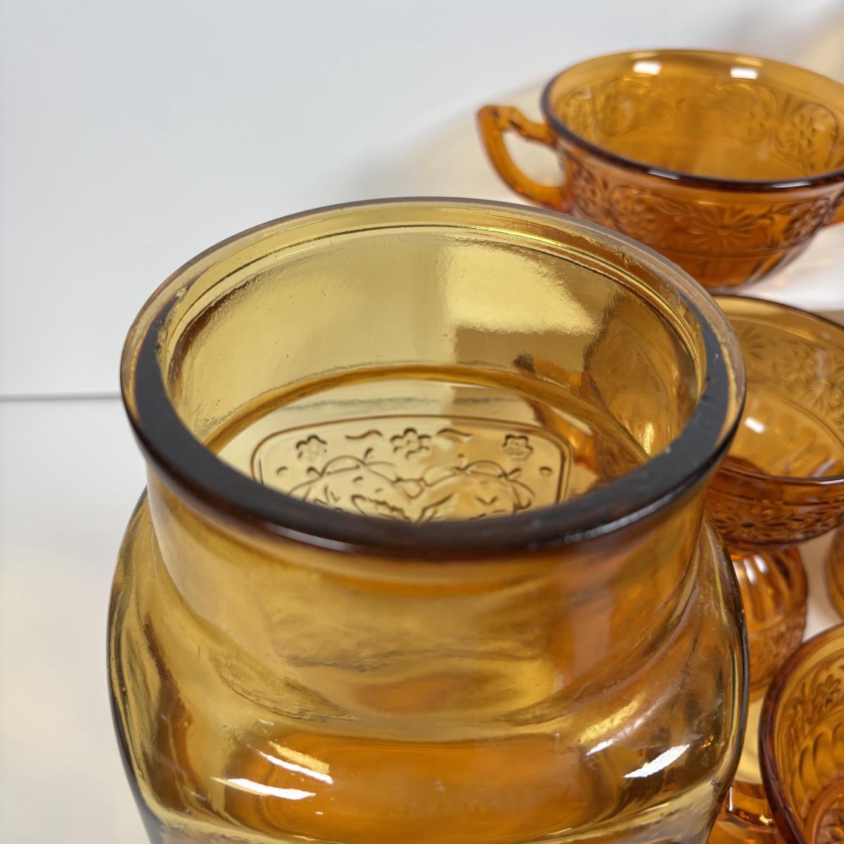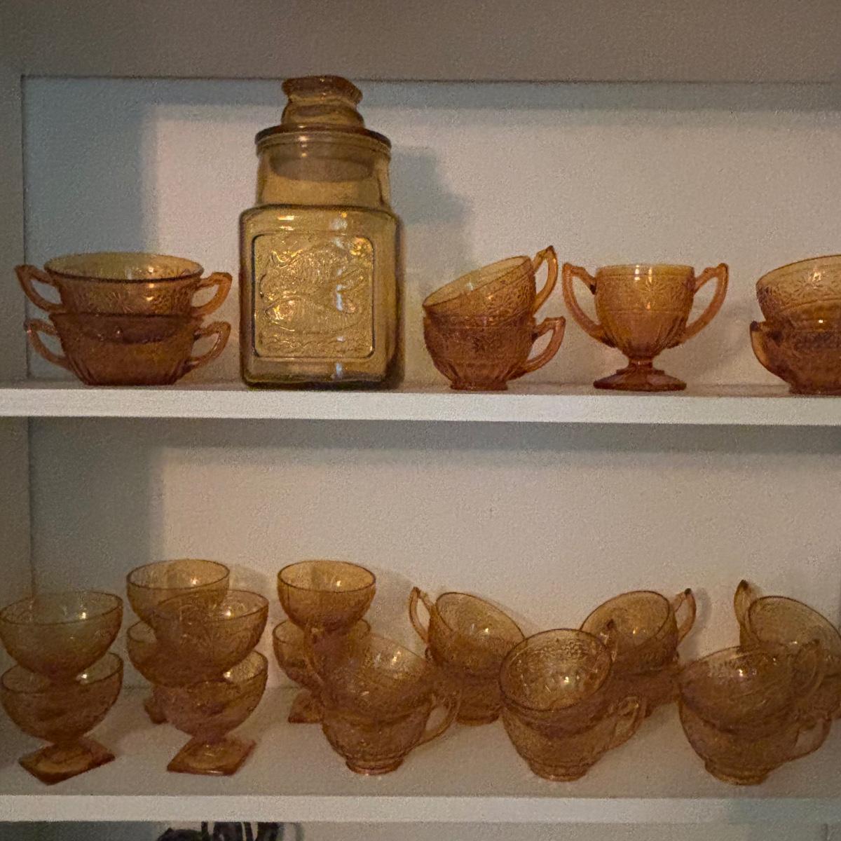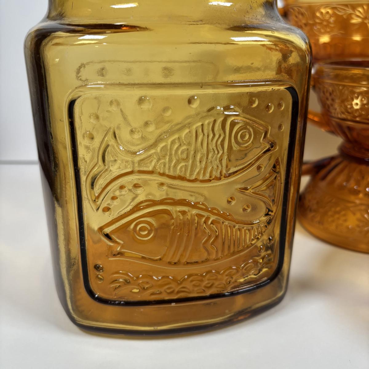 LOT 380: Vintage Amber Wheaton Glass Embossed Canister Jar & Indiana Depression Amber Glassware